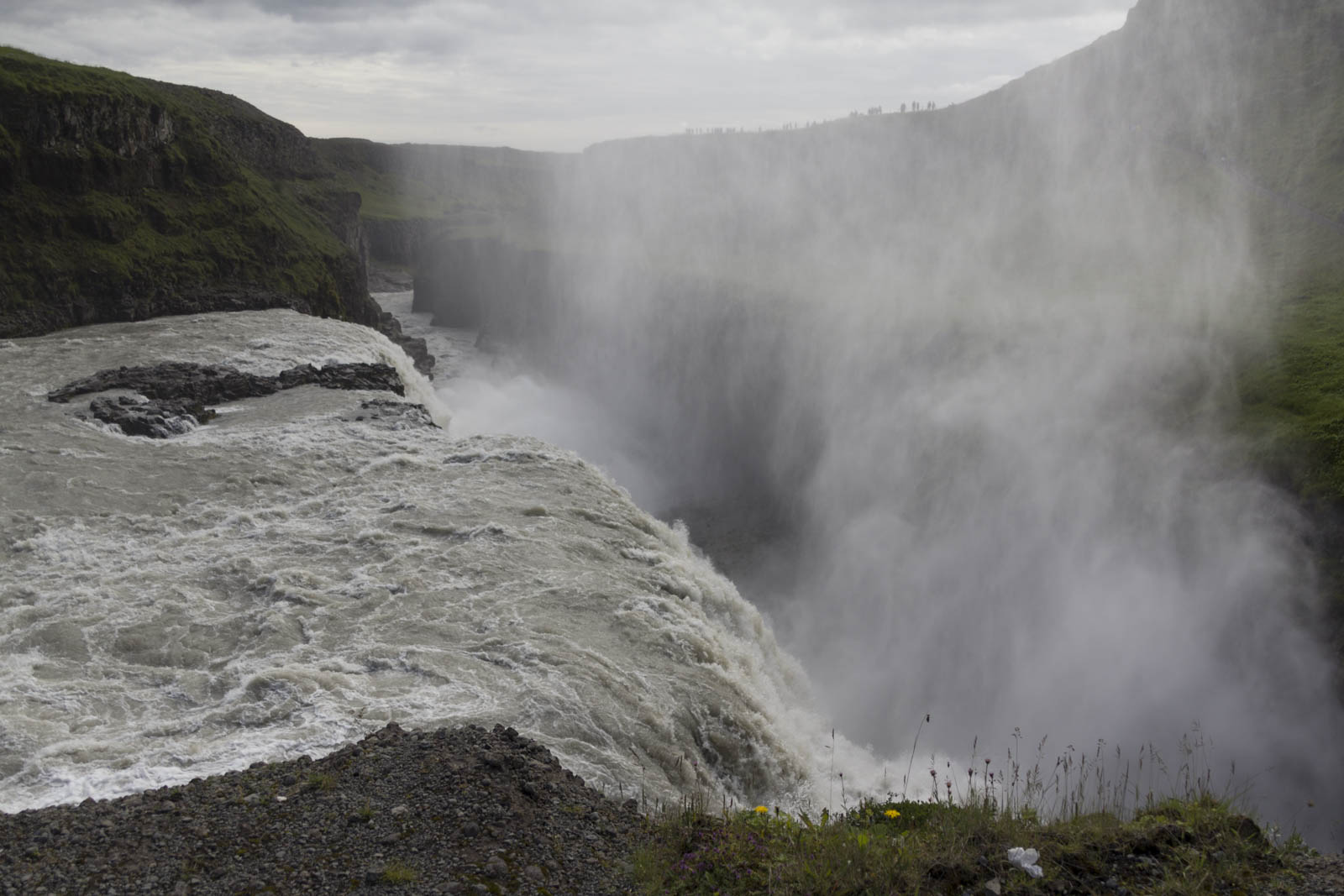 Cette fois direction Geysir, un site volcanique et géothermique. On y observe des petits cratères encore fumants, des sources chaudes et surtout un impressionnant geyser qui, toutes les 4-5 minutes, envoie violemment un jet d’eau à plusieurs mètres de haut. Bref, un geyser. Mais il vaut vraiment le coup, le plus beau moment étant celui où l’on voit une grosse bulle se former et gonfler jusqu’à exploser en un jet puissant. D’ailleurs, ici aussi, les touristes sont venus en masse.