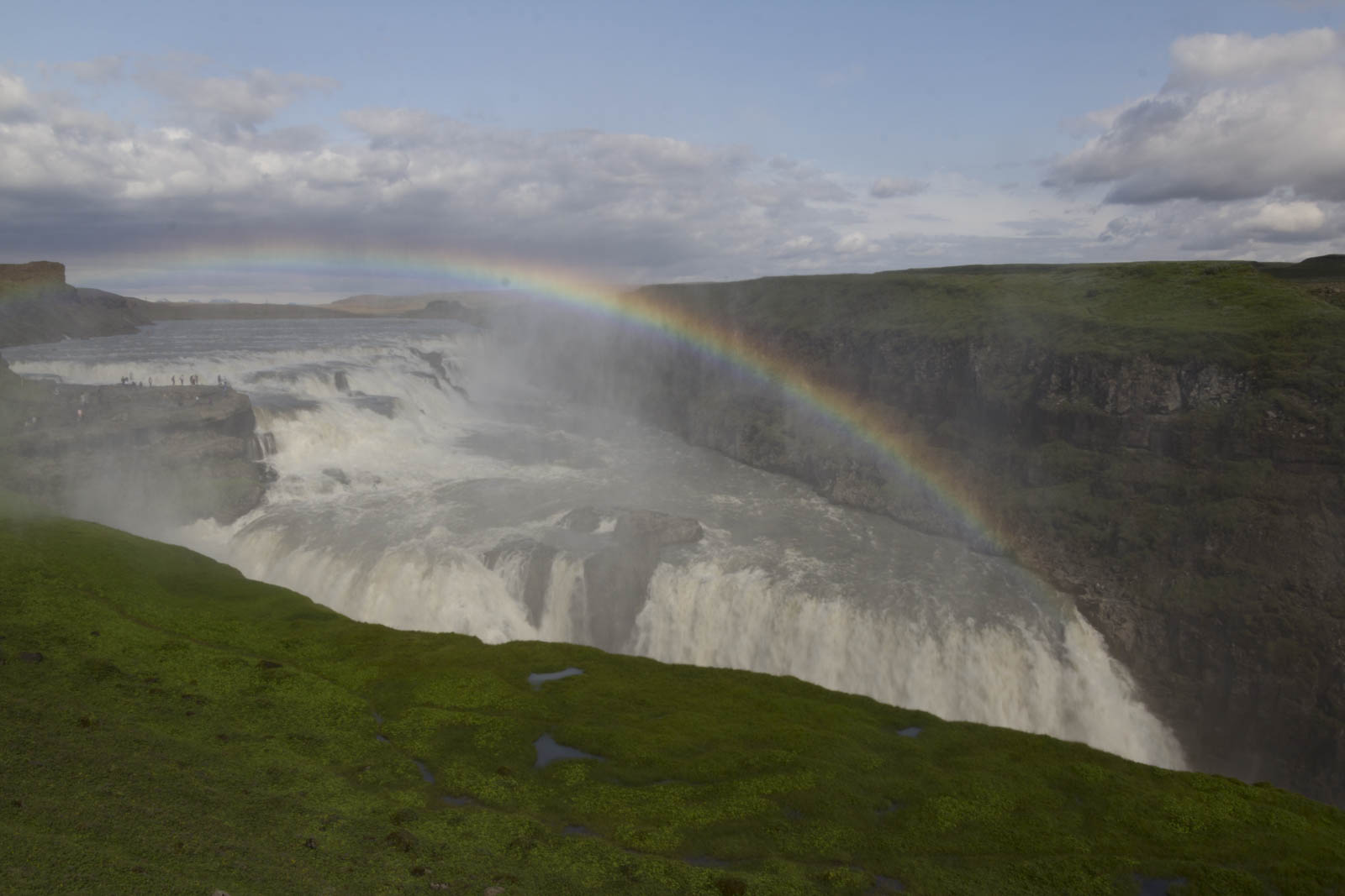 Gulfoss est une magnifique chute d’eau sur 2 niveaux, au milieu de la « rivière blanche » qui provient des glaciers alentours que l’on voit au loin. Le cadre est somptueux, et les touristes affluent, surtout par ce beau soleil. Nous nous prenons aussi au jeu : quelques belles photos, un arc en ciel qui en jette, et on repart.