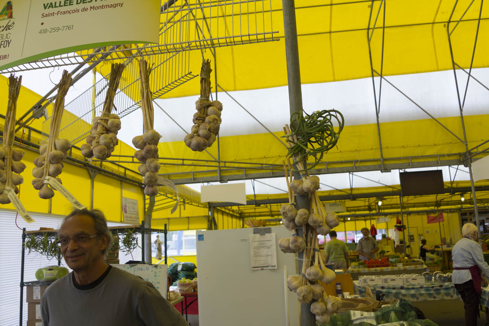 Marie-Pier, notre couchsurfeuse, nous a fait découvrir ce marché très local. Nous y sommes passés en express, mais avons pu goûter les premières pommes de la saison, excellentes, et découvrir les produits que l’on avait cuisiné la veille avec elle. Deux découvertes assez surprenantes : on y vend du chanvre concassé, que l’on utilise comme céréale. Nous y avons goûté juste comme ça, et c’est assez intéressant. On trouve aussi de la fleur d’ail. Moins forte en goût que la gousse d’ail, elle se digère aussi plus facilement. Elle peut se consommer cuite comme une asperge ou bien conserver en petits morceaux dans du vinaigre pour parfumer des assaisonnements.