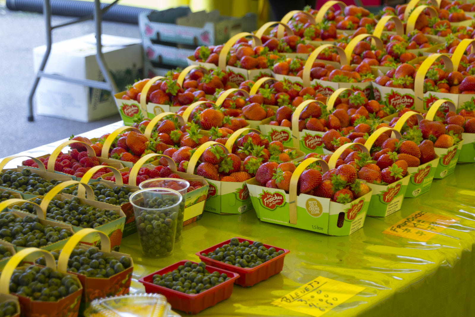 - Fruits : les bleuets (myrtilles) ont la part belle, mais on trouve aussi d’autres baies de couleur noire, rouge ou blanche. En cette saison estivale, beaucoup de fraises, des framboises, des canneberges, des physalis (qu’ils appellent cerise de terre) et les premières pommes