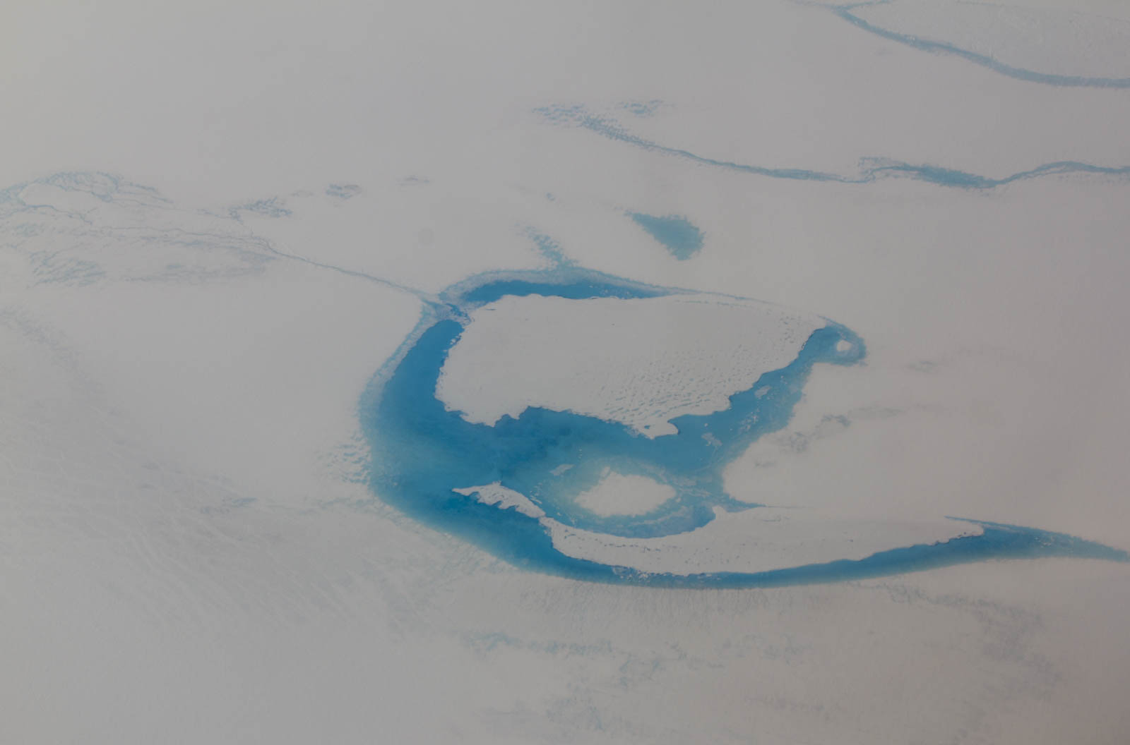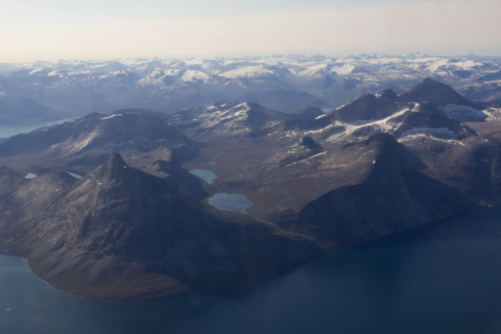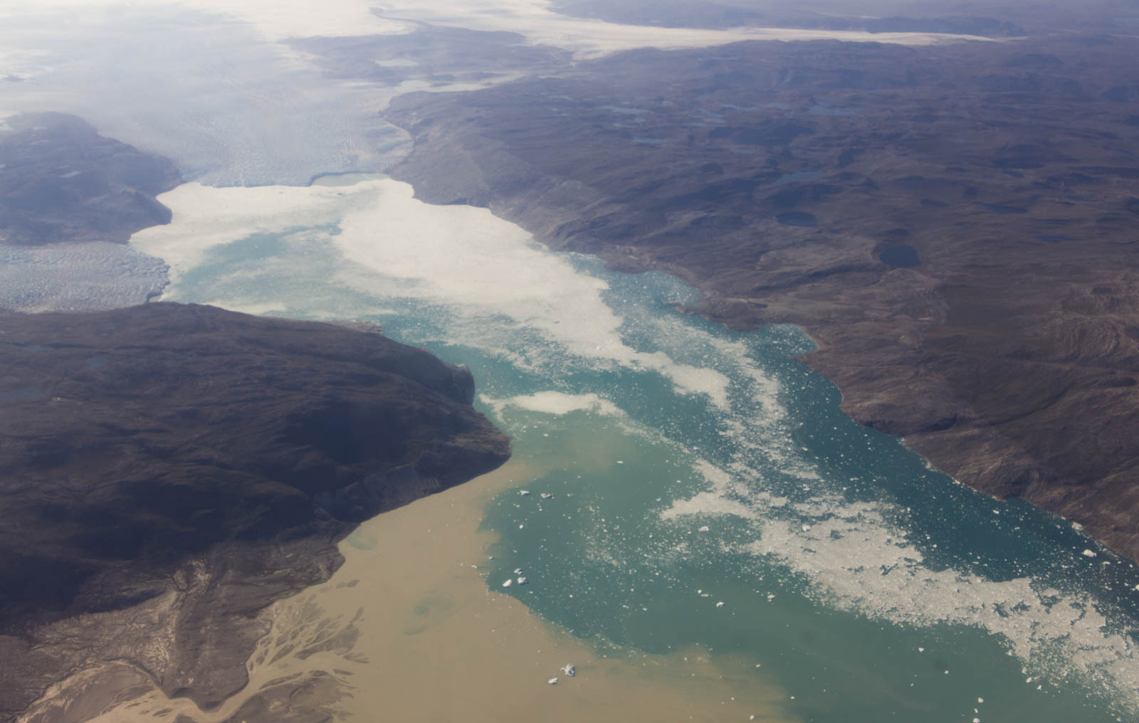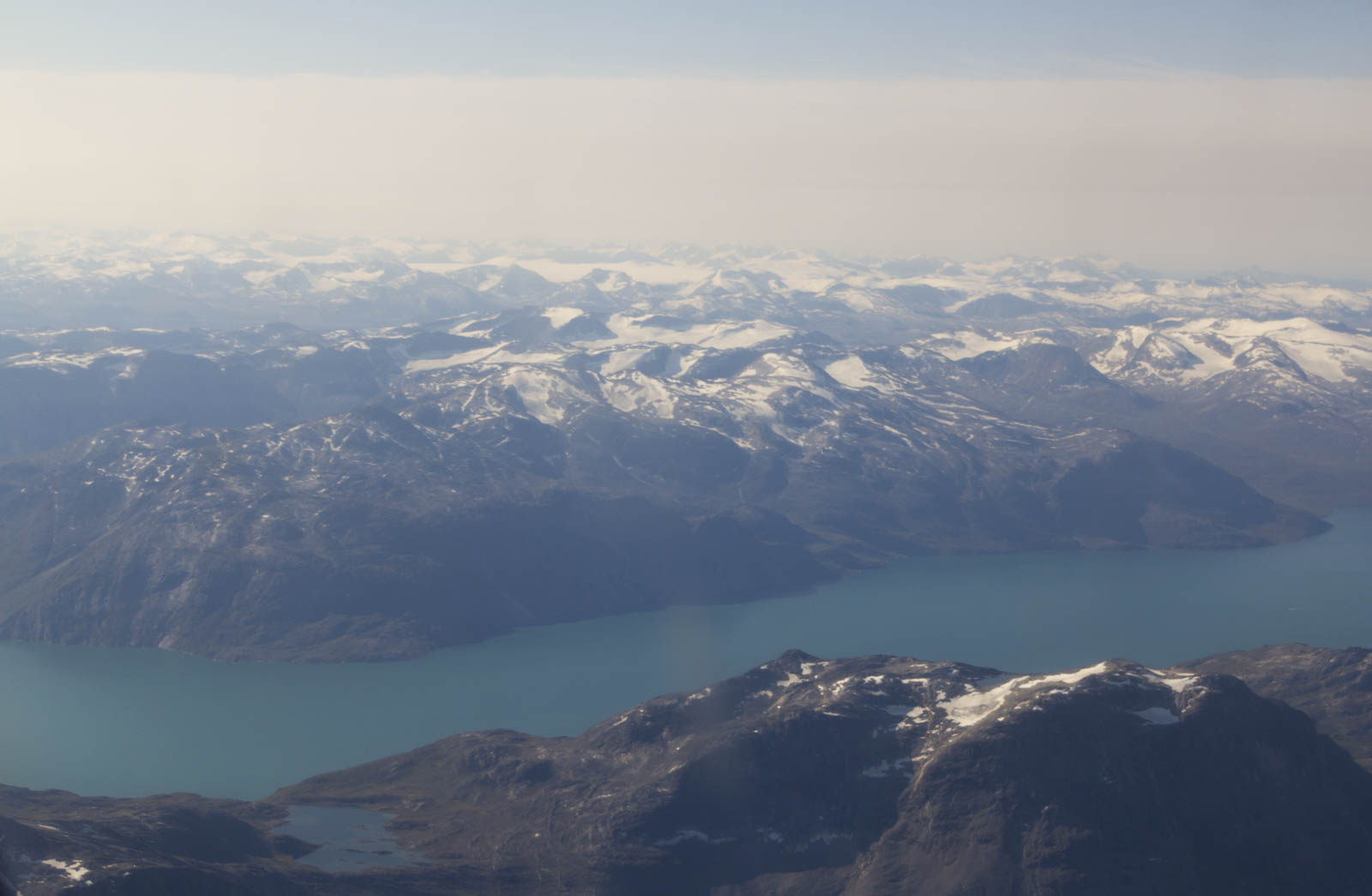 Et puis, au milieu du vol, la magie du Groenland commence à apparaître. Les nuages nous laissent la place d’apercevoir d’abord quelques points blancs au milieu de l’océan, sans doute des icebergs. Puis nous survolons une immense étendue blanche d’où surgissent quelques impressionnants reliefs. C’est le Groenland ! Et le début de notre mitraillage photo depuis l’avion. Quelques étendues d’eau turquoise sur fond blanc, puis quelques montagnes. En se rapprochant de la côte Ouest, les fjords apparaissent et l’avion commence sa descente. Des montagnes grises, parfois recouvertes de mousse verte ou jaune, parfois de neige, surgissent de la mer. Des glaciers qui plongent dans les fjords laissant échapper quelques icebergs. Magique !