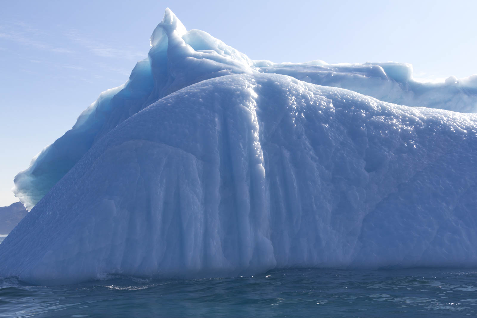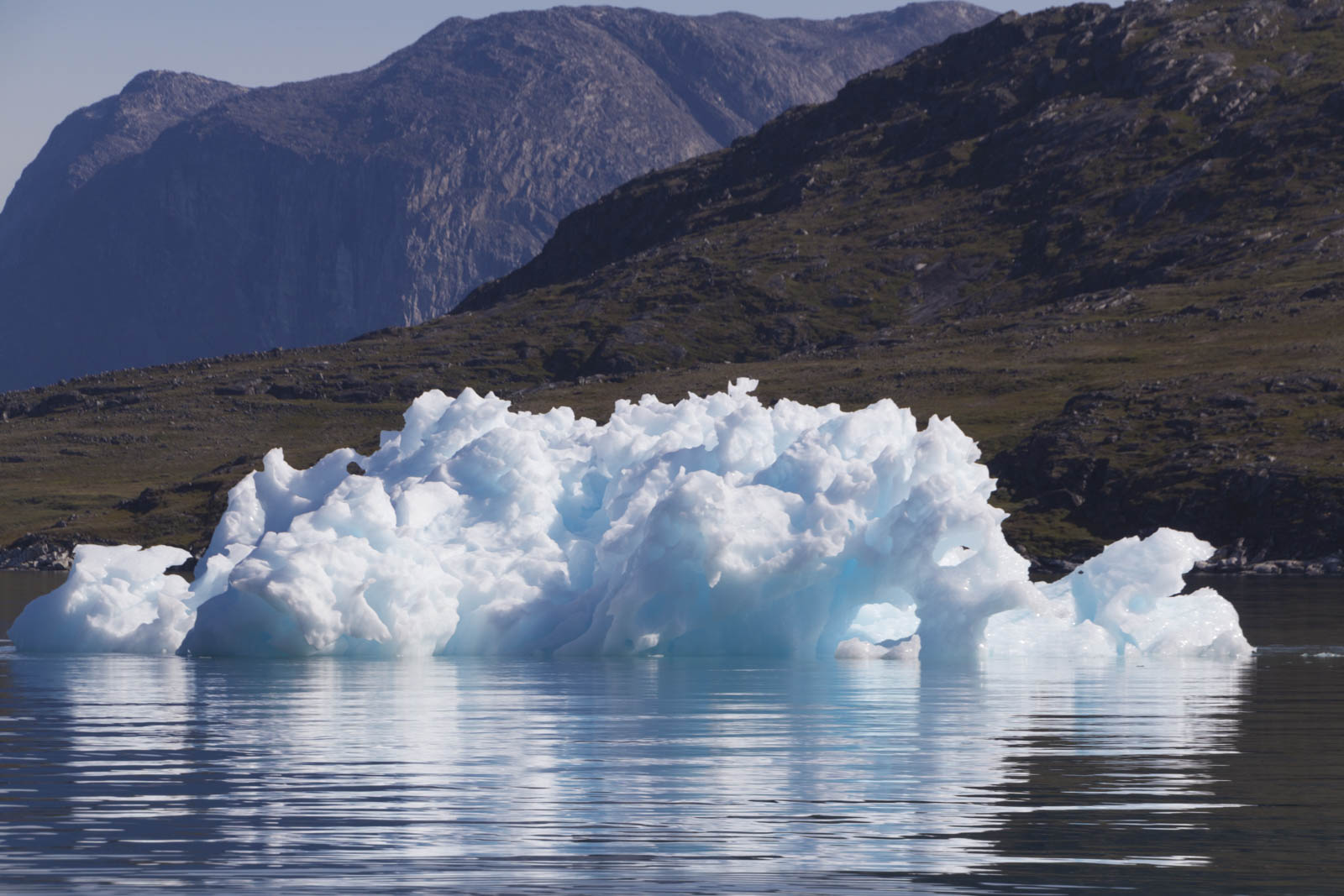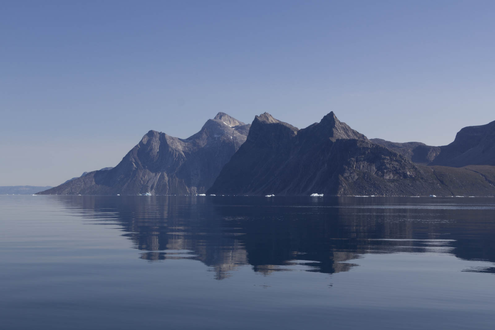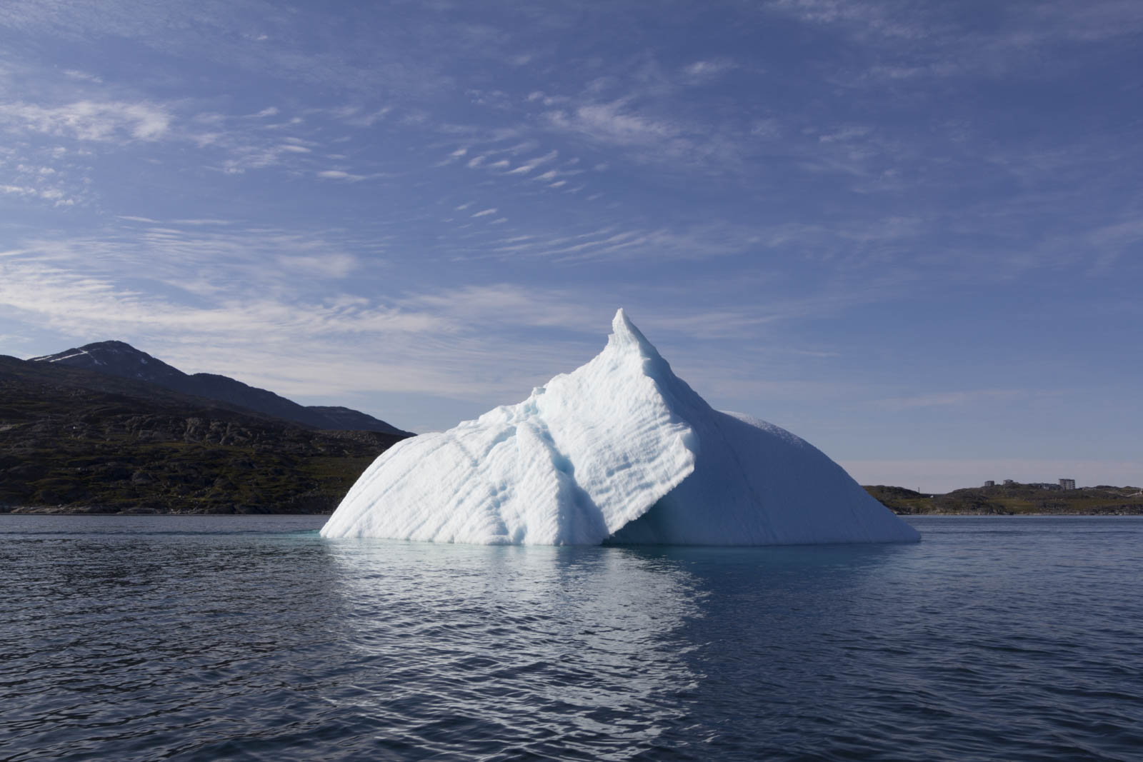 Démarre alors 2h30 de traversée du fjord. Le bateau file et vole sur une eau semblable à une mer d’huile. Le vent du à la vitesse frappe nos visages et siffle dans nos oreilles. On ne s’entend plus, de toute façon on est un peu coincés dans la combinaison et il est difficile de tourner la tête. On ressemble tous à Kenny, sauf qu’à la fin, on s’en sort bien. On profite alors chacun dans notre bulle de ces magnifiques paysages. Des icebergs, des montagnes, parfois un peu de neige en hauteur, l’eau bleue oscillant entre bleu marine et bleu turquoise, la nature, la nature et encore la nature. On est au Groenland !!! C’est magique !