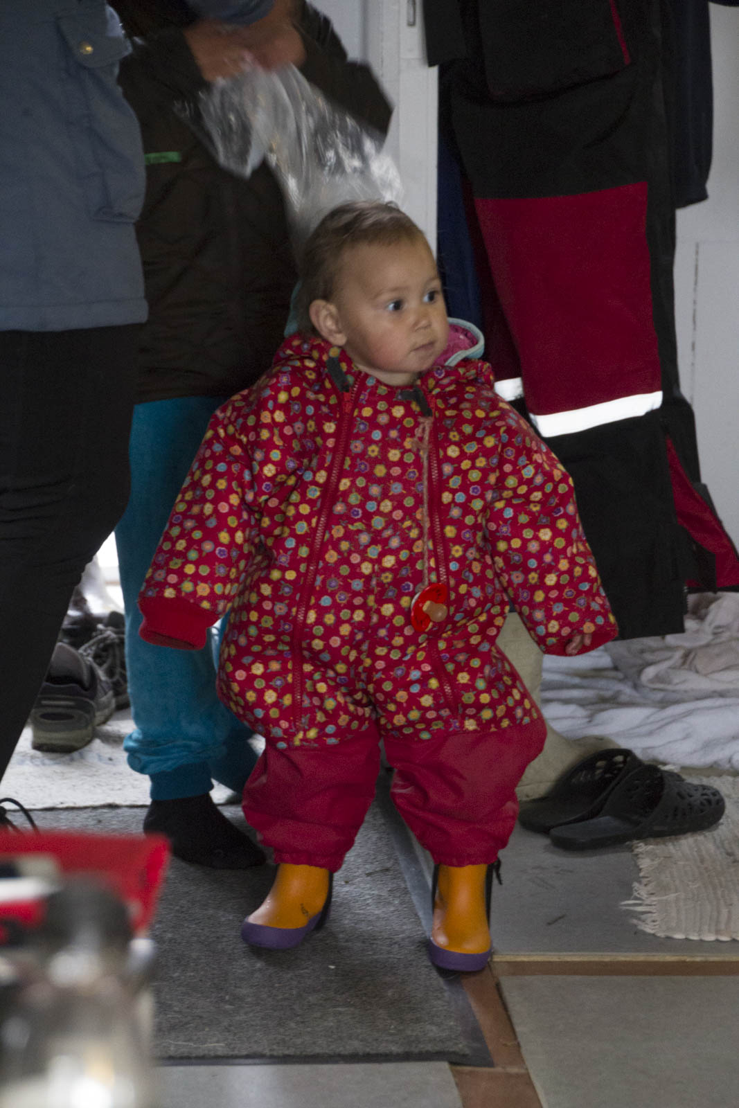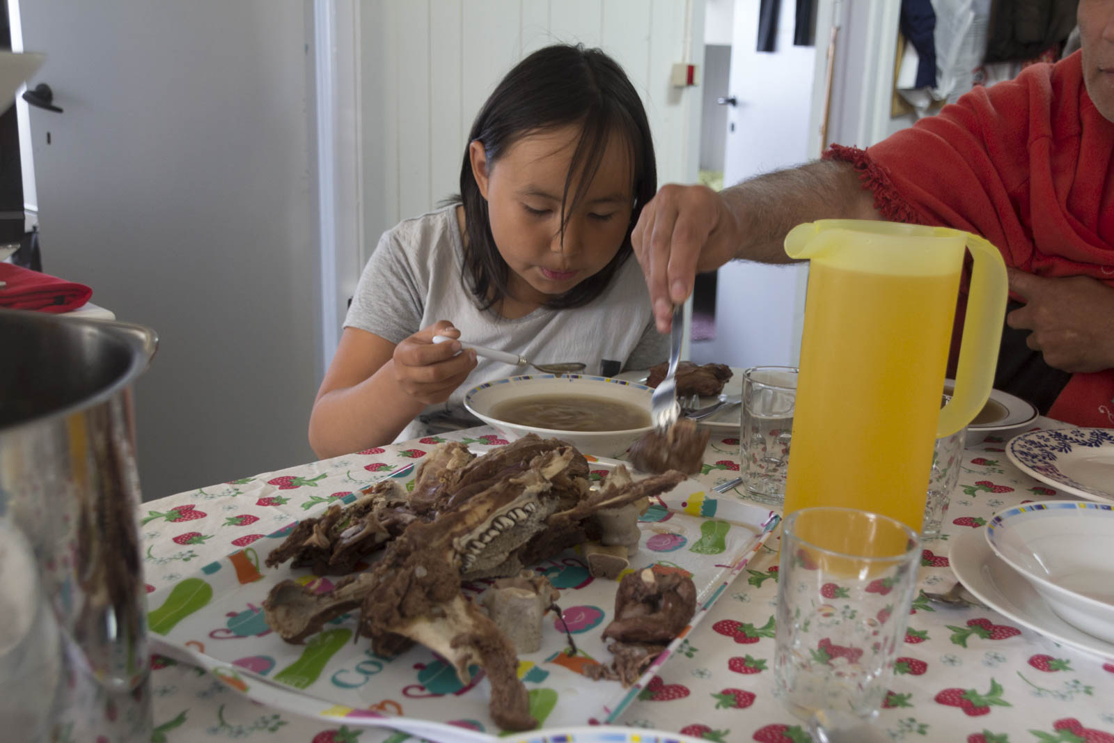 Alors que les soupes mijotent, une nouvelle famille arrive dans l’auberge ! Eux aussi de Nuuk, ils étaient partis camper près de la rivière quelques jours, mais veulent passer la nuit qui vient au sec à cause de cette maudite pluie ! En même temps, avec une fillette d’à peine un an, pas évident de camper dans ces conditions. Le jeune couple est aussi accompagné de leur fils de cinq ans, de son grand-père, Akara et de leur chien. Nous voilà donc à 10 adultes, 3 enfants et 2 chiens dans la petite maison. Belle ambiance !