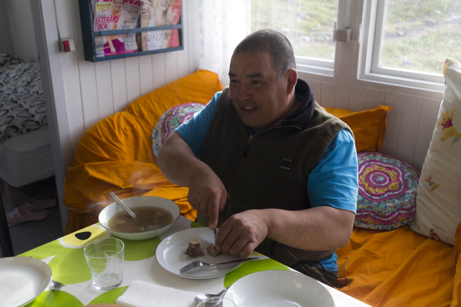 Un trio de chasseurs venus de Nuuk est en galère à cause de la pluie. Ils ne pourront rentrer sur Nuuk ce soir-là, et débarquent donc à l’auberge pour y passer la nuit. Nous voilà donc avec un chasseur groenlandais et sa femme accompagnés de la fille d’un de leurs voisins. Ils sont complètement trempés après avoir passé la journée à chasser. Ils ont d’ailleurs eu plus de réussite que nous : ils ont abattu quatre rennes, mais n’ont pas pu tout ramener à leur bateau. Apparemment, cela était trop lourd et compliqué à ramener, à trois, sous la pluie.