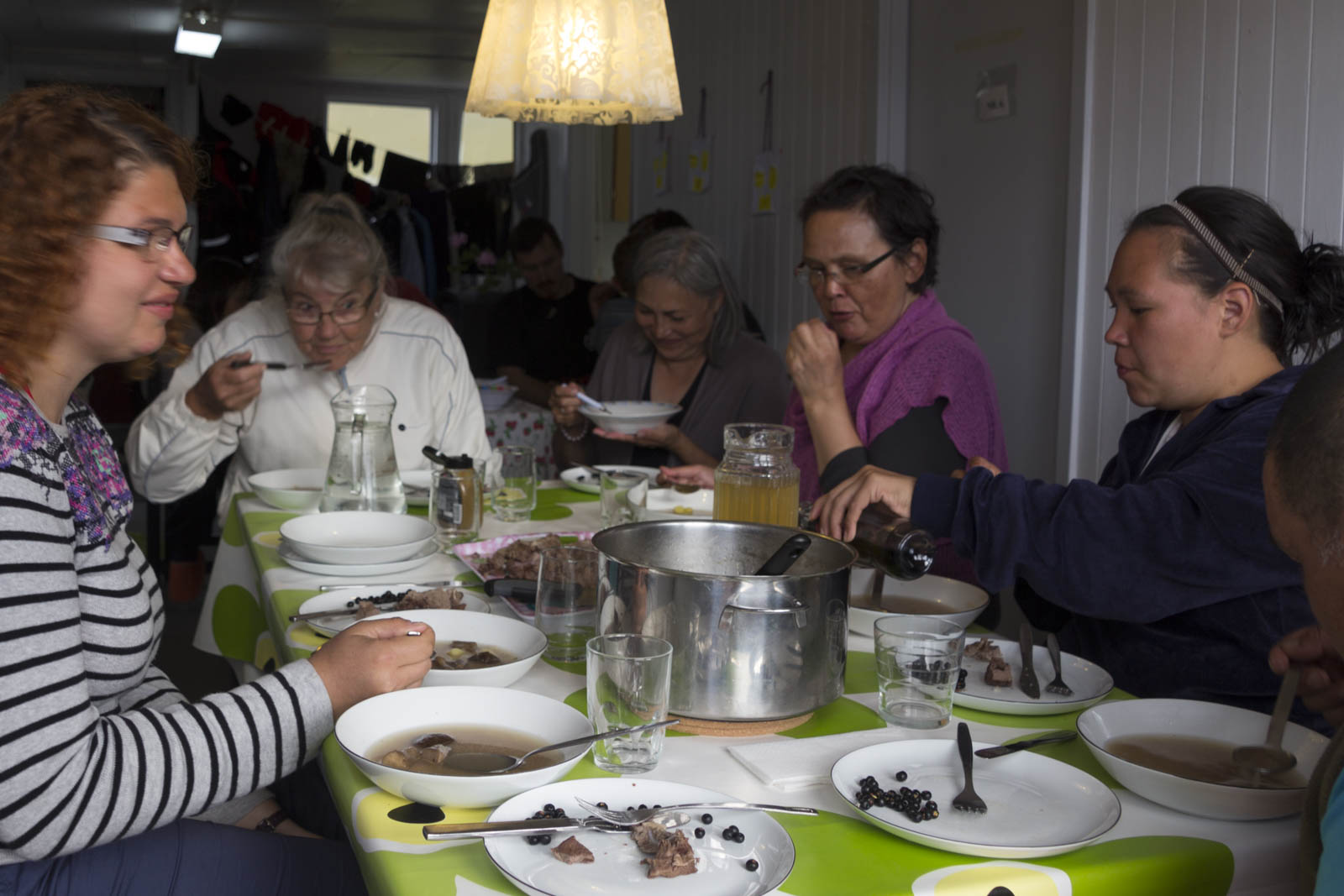 Une fois que tout ce petit monde s’est installé (avec des vêtements secs prêtés par Ane-Sofie !), on peut servir les soupes. Le résultat est vraiment excellent. Surtout la viande de renne, assez fine et tellement fraîche ! Et le cœur et la langue s’avèrent effectivement être les meilleurs morceaux :) !
