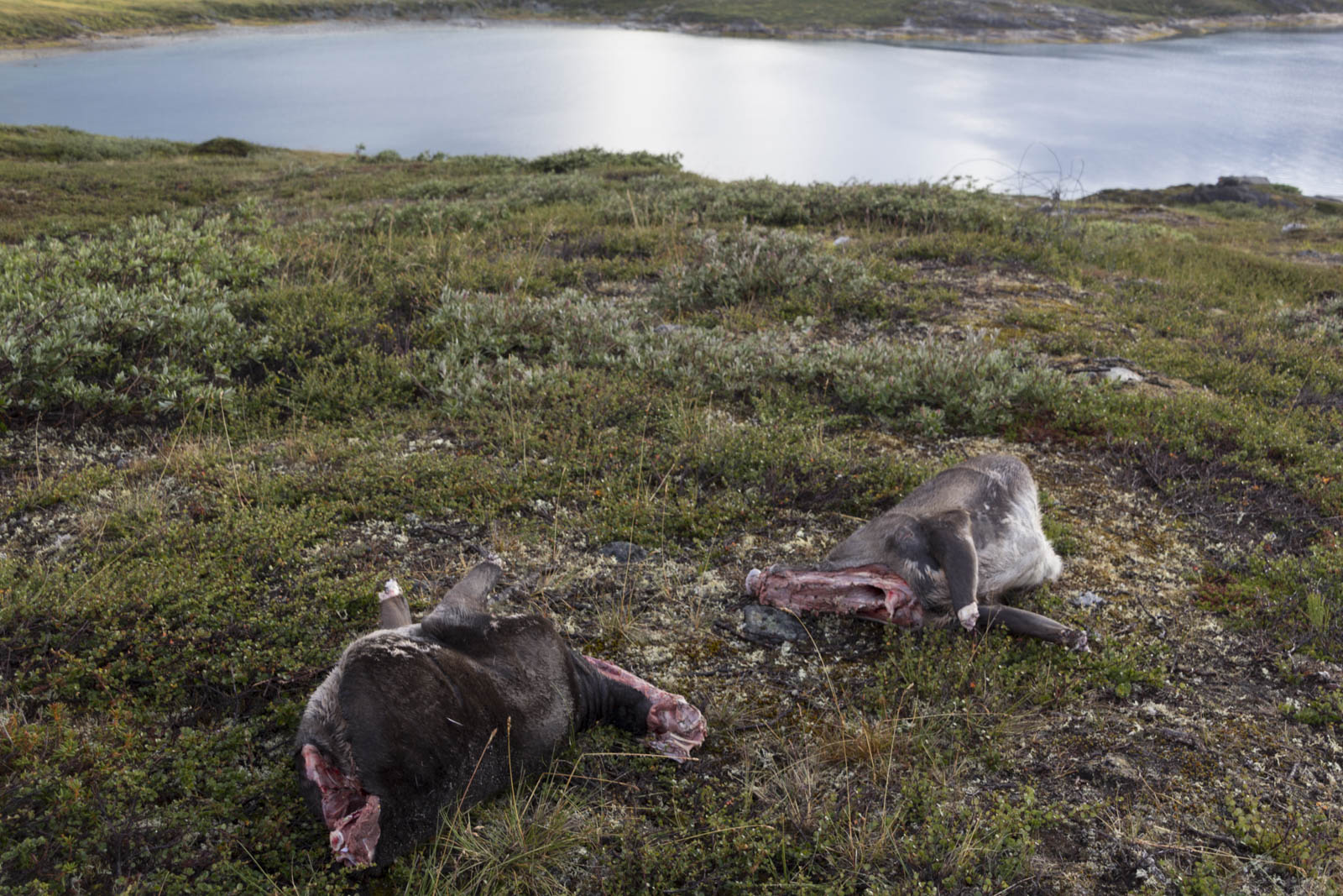 Le chasseur nous emmène à son bateau et nous partons à toute vitesse de l’autre côté de la baie. Un reste de renne gît par terre dans le bateau. Nous débarquons et grimpons sur un replat un peu au-dessus. Là, un autre renne attend. Puis il m’explique qu’il y en a encore trois autres plus loin. Là, je commence à flipper, à me dire que je n’arriverai jamais à porter des rennes morts sur ce terrain pentu et glissant. Ca doit vraiment être lourd ces bêtes là…