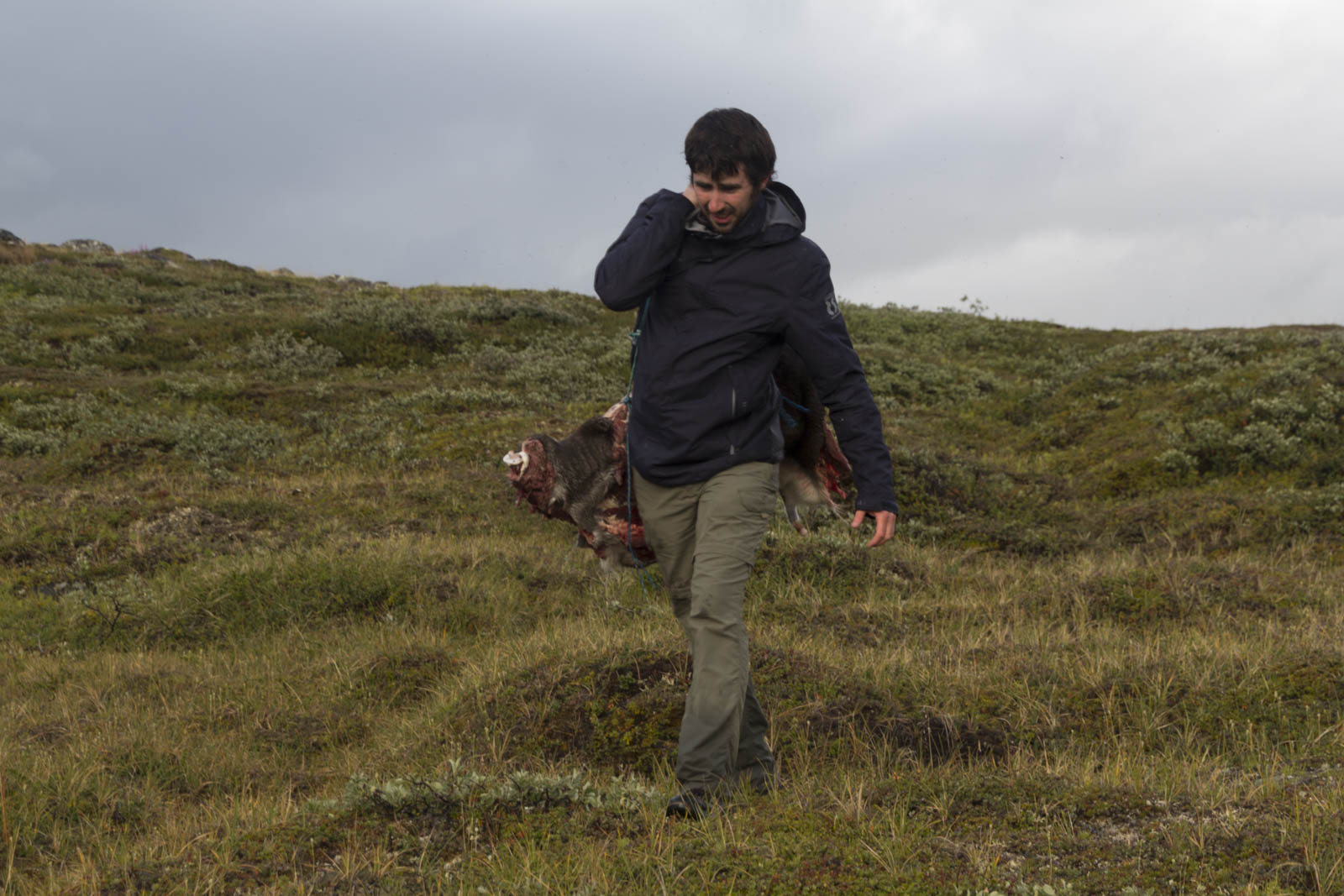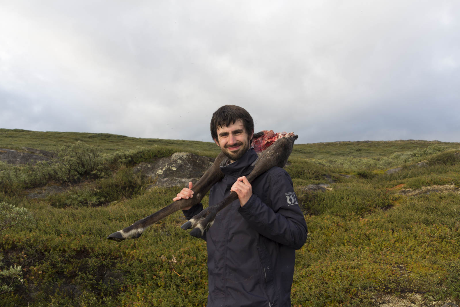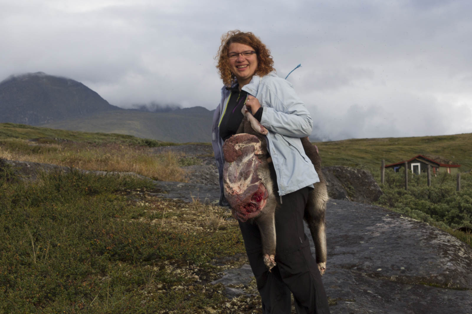 Nous voilà arrivés au dernier renne. En fait, notre chasseur a bien bossé : les bêtes sont déjà vidées et découpées en gros morceaux : tête, tronc, pattes avant et arrières. Plus les langues et cœurs que l’on n’a pas mangés. Il me charge d’un tronc de renne dans le dos, attaché à une sangle qui fait le tour de mon front. Trop cool ! La méthode traditionnelle pour porter les rennes ! C’est finalement pas trop lourd, ni trop dégoulinant. Sandrine s’amuse à filmer et photographier toute la scène. Mais elle aussi est mise à contribution : deux pattes à porter sur l’épaule, toujours à l’aide d’une sangle, ainsi qu’une langue et un cœur. On se dit que nos vêtements risquent d’en prendre un coup, surtout que le chasseur nous installe les bêtes côté viande sur nos vêtements. « Toujours porter côté viande » est devenu notre petite phrase-blague !