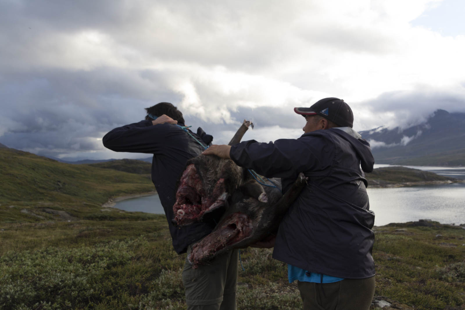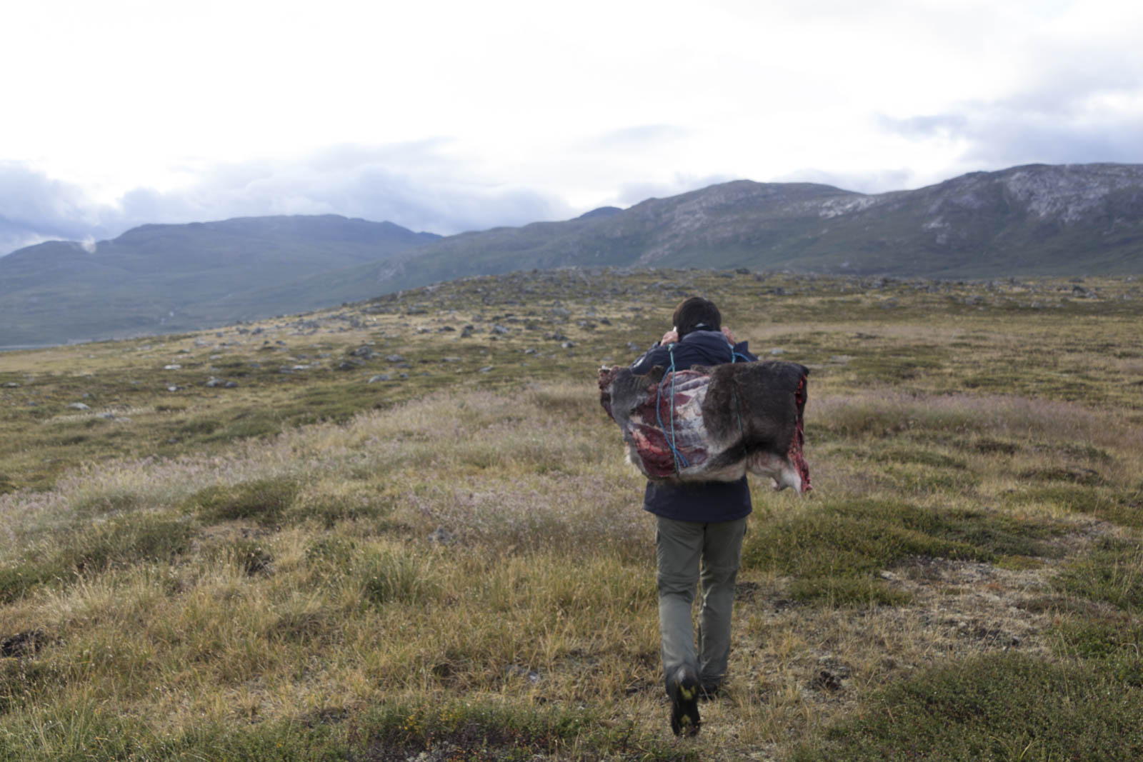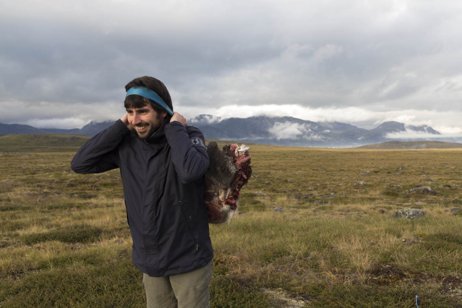Nous voilà arrivés au dernier renne. En fait, notre chasseur a bien bossé : les bêtes sont déjà vidées et découpées en gros morceaux : tête, tronc, pattes avant et arrières. Plus les langues et cœurs que l’on n’a pas mangés. Il me charge d’un tronc de renne dans le dos, attaché à une sangle qui fait le tour de mon front. Trop cool ! La méthode traditionnelle pour porter les rennes ! C’est finalement pas trop lourd, ni trop dégoulinant. Sandrine s’amuse à filmer et photographier toute la scène. Mais elle aussi est mise à contribution : deux pattes à porter sur l’épaule, toujours à l’aide d’une sangle, ainsi qu’une langue et un cœur. On se dit que nos vêtements risquent d’en prendre un coup, surtout que le chasseur nous installe les bêtes côté viande sur nos vêtements. « Toujours porter côté viande » est devenu notre petite phrase-blague !