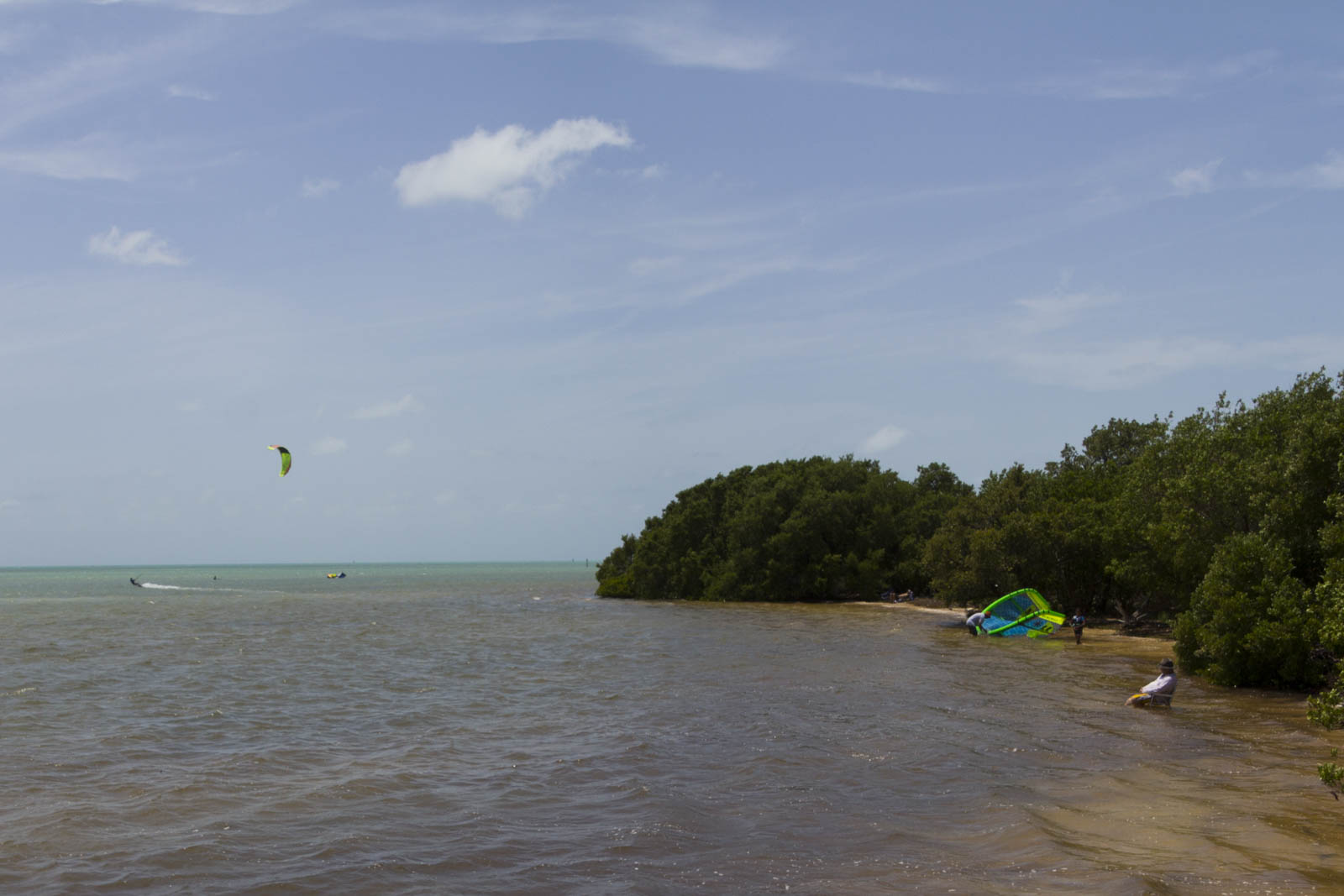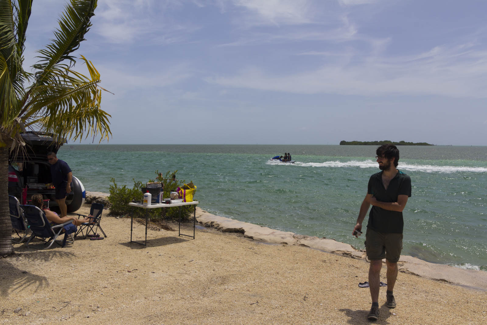 Key Largo, la plus grande île des Keys, nous a en effet offert essentiellement des « paysages » de grande surface, d’hôtels, de clubs et de fast food bien sûr. Ensuite, en s’éloignant de la grande route à la recherche d’une petite plage, on découvre qu’il faut payer 10$ pour accéder au bord de l’eau. Super… On a donc poursuivi notre route sur d’autre îles et là, la beauté des Keys a commencé : l’océan à gauche, le golfe du Mexique à droite, des eaux très claires, parfois turquoises à perte de vue et de mignonnes petites plages parsemées de palmiers. Nombreux sont les locaux, ultra équipés, – chaises pliantes, barbecue portatif, table, matelas pneumatiques, kyte surf … – qui viennent y passer la journée en famille.