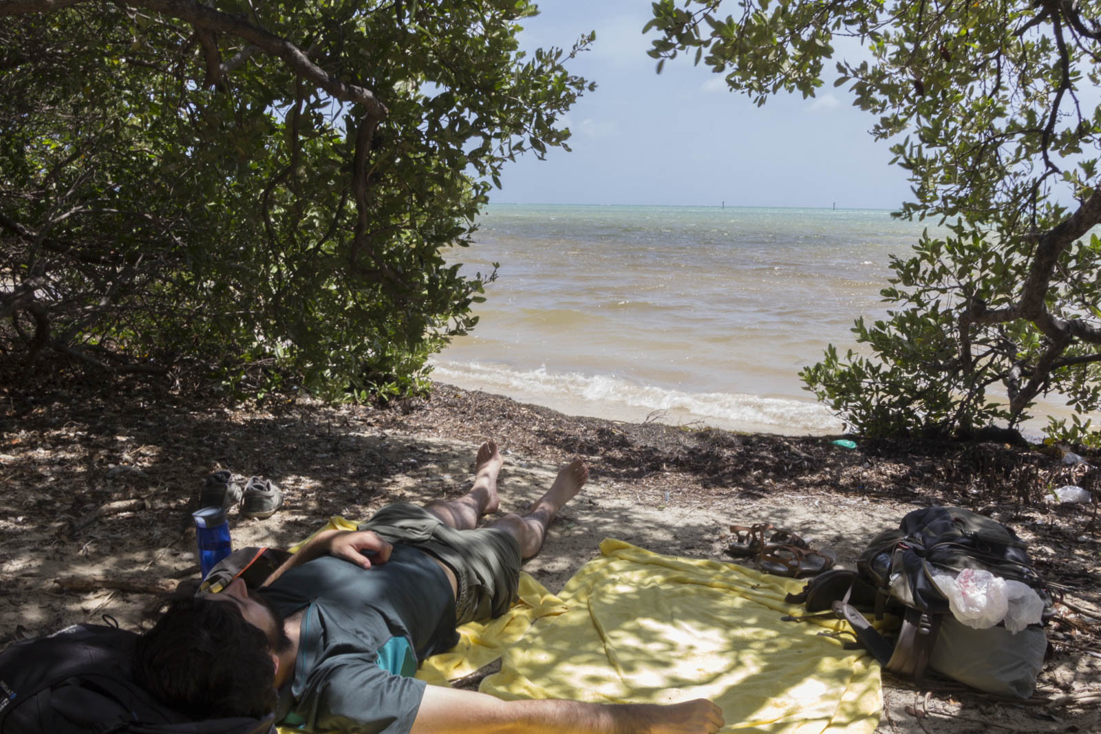 En cherchant un peu, on a fini par trouver un petit parking où notre Spark s’est faufilée jusqu’à l’une des seules places disponibles, au nez et à la barbe des grosses voitures de ricains. De là, en marchant sous les palmiers, on a pu se poser dans notre petit coin privé, sous les arbres et au bord de l’eau. Seul petit regret : de l’eau seulement jusqu’aux genoux… On devient difficile :)
