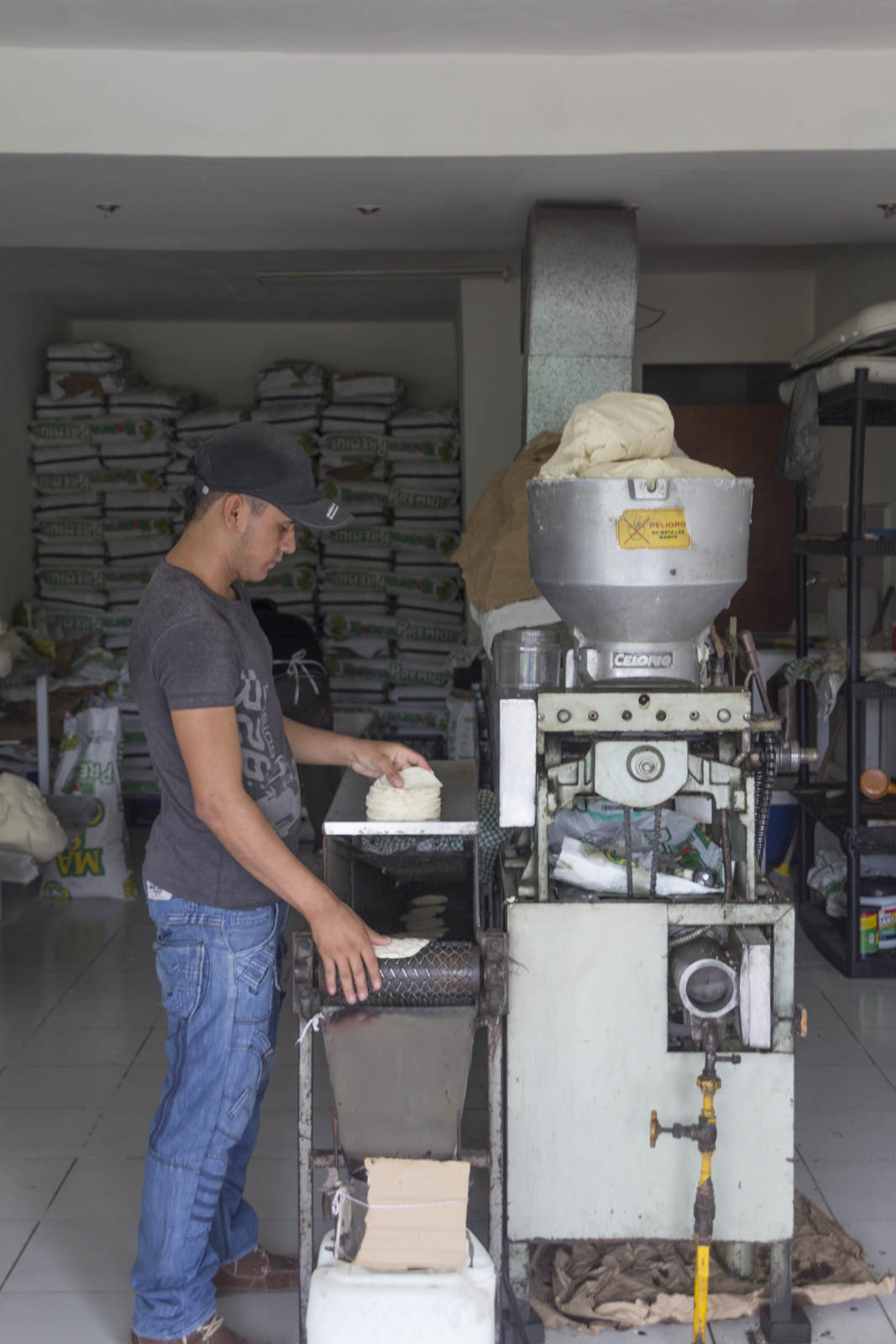 La masa en poudre est mélangée à de l’eau, puis pétrie. Ensuite, une machine se charge du reste : aplatir une petite quantité de pâte pour former une fine galette ronde qui passe au four. Les tortillas cuites restent plates, car il n’y a pas de levure.