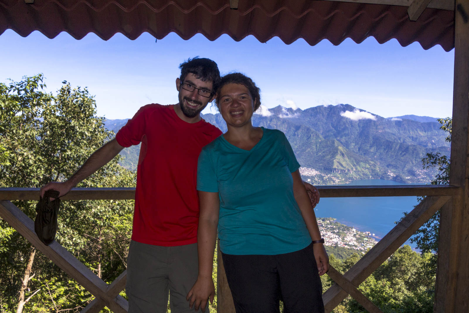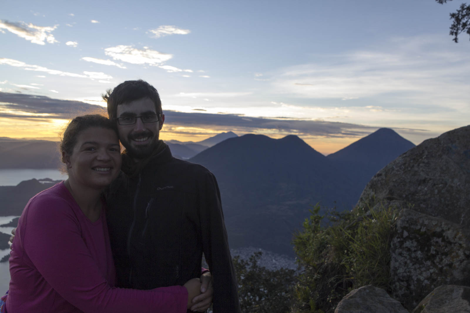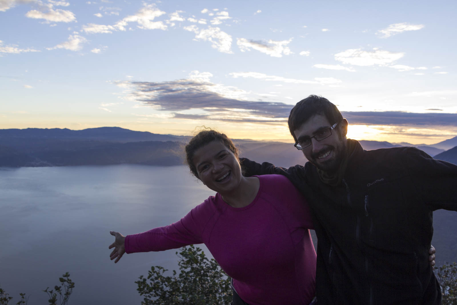 Le soleil est en train de se lever à l’autre extrémité du lac. L’eau, calme, brille. Les villages autour dorment encore. Au Sud les deux autres volcans (Toliman et Atitlan) du lac Atitlan découpent le ciel. On suit la montée du Soleil depuis là-haut, le paysage s’éclaire au fur et à mesure. Ce spectacle nous émerveille, on est heureux !