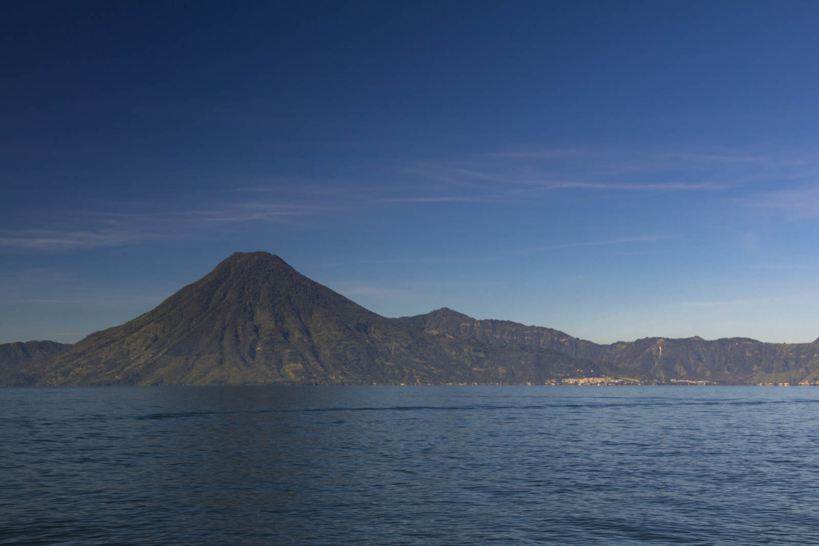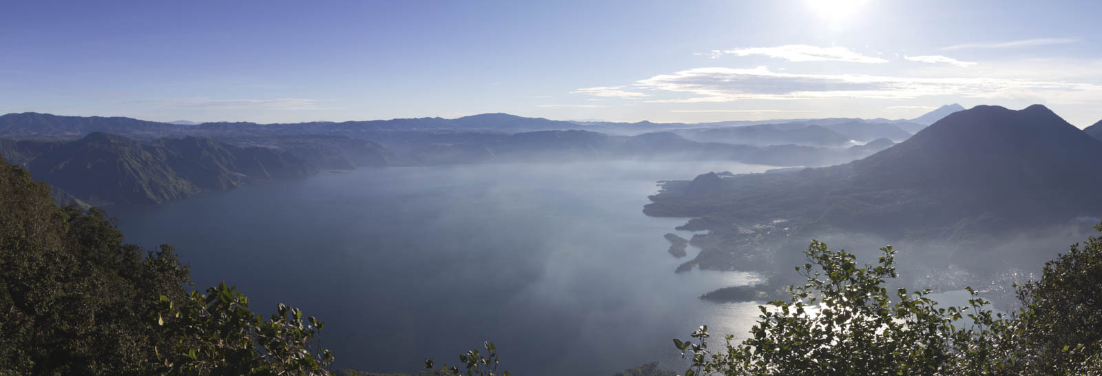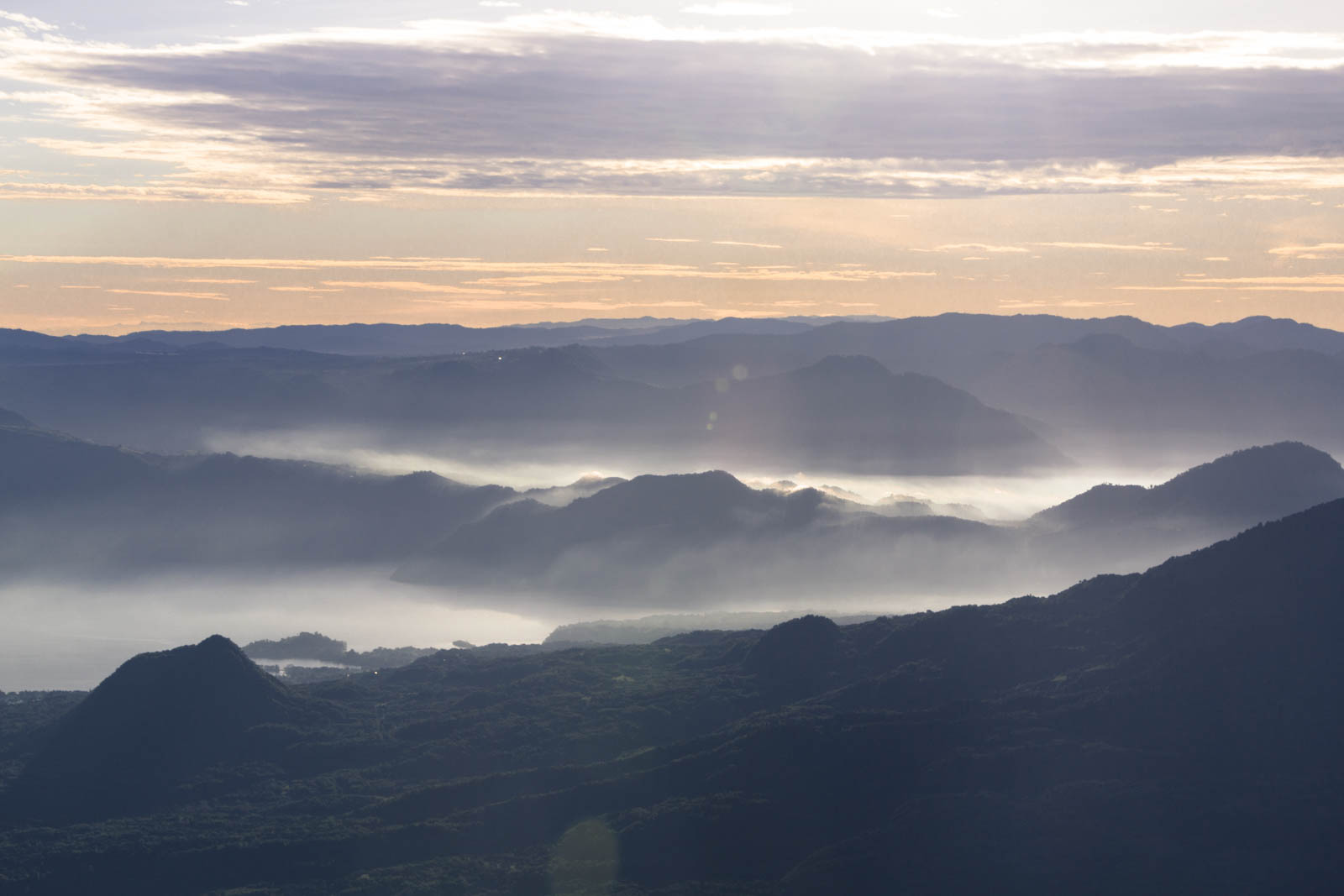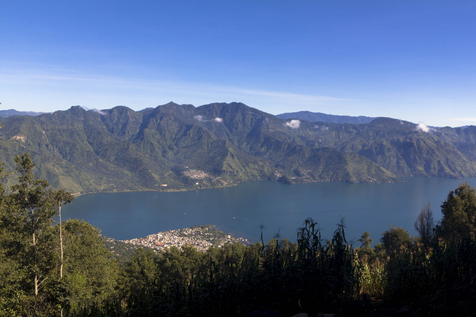 Le soleil est en train de se lever à l’autre extrémité du lac. L’eau, calme, brille. Les villages autour dorment encore. Au Sud les deux autres volcans (Toliman et Atitlan) du lac Atitlan découpent le ciel. On suit la montée du Soleil depuis là-haut, le paysage s’éclaire au fur et à mesure. Ce spectacle nous émerveille, on est heureux !