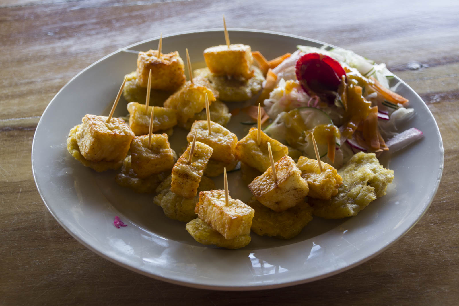 Le fromage nicaraguayen est assez savoureux et bien salé. Et en cuisant, ce fromage a la particularité de ne pas fondre, mais de devenir spongieux, avec une croûte un peu croquante. Pour accompagner les bananes, il est coupé en gros morceaux que l’on couvre d’épices et frit dans l’huile. Et on dispose les morceaux de fromage chaud sur les tajadas, les tostones ou les maduros, avec un peu de crudités à côté. Et ça, c’est vraiment trop bon ! On vous recommande donc vivement les tostones con queso et les maduros con queso, que l’on a renommés « poutine du Nicaragua ».