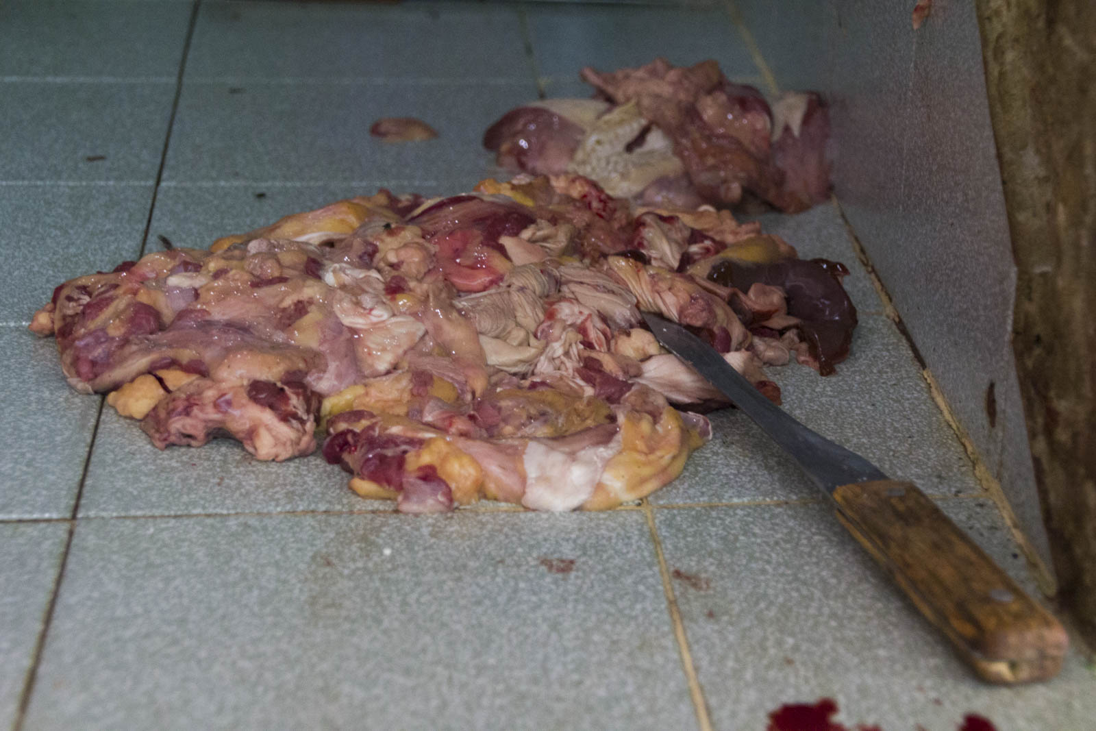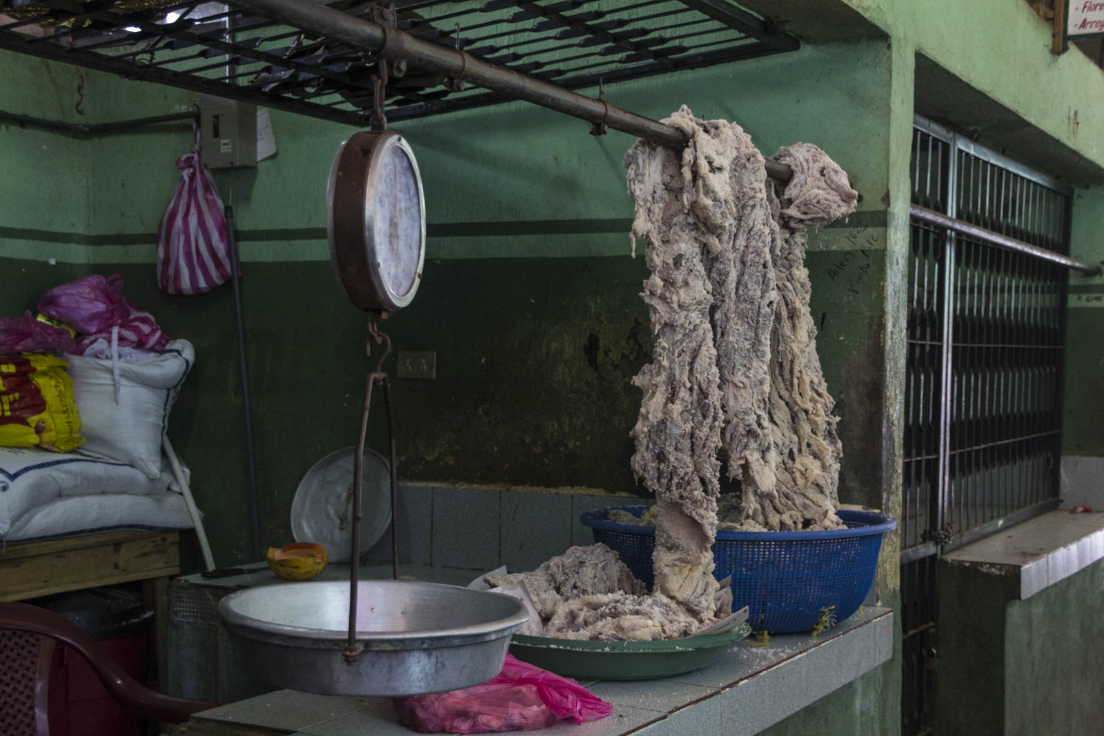 - Les grosses pièces de bœuf ou de porc, suspendues au-dessus des étals, pas toujours très ragoûtantes
