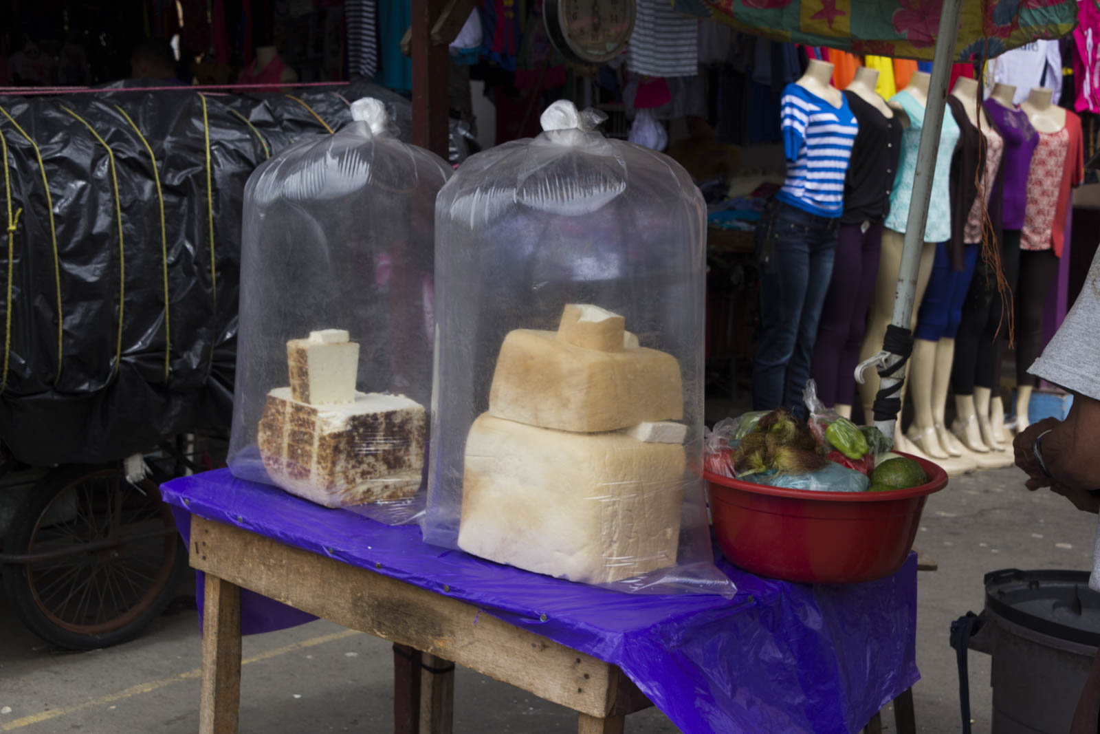 Toutefois, en ce qui concerne les vêtements, on reste ici dans les classiques occidentaux : points de tenues traditionnelles mayas ou autres ici. Ce qui enlève un peu de couleur et d’exotisme à ces marchés. Et du côté des produits alimentaires, faute de tortillerias, on n’a pas entendu non plus les claquements de main caractéristiques de la fabrication des tortillas.