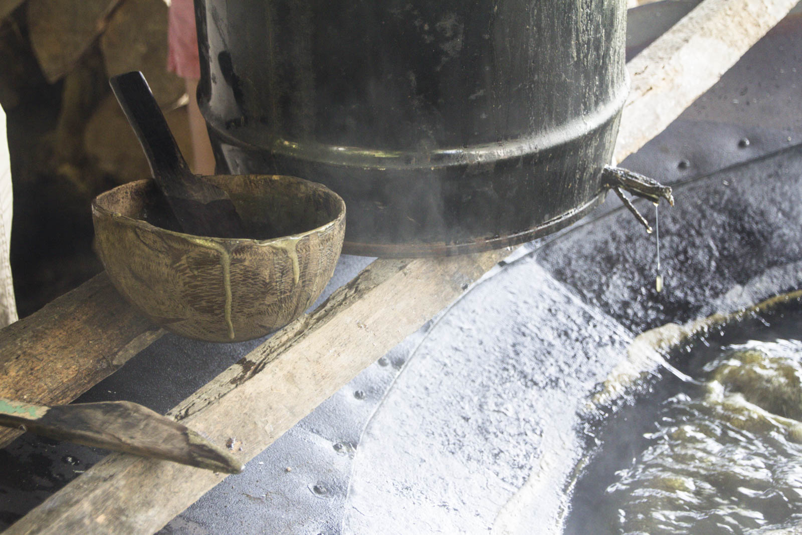 En arrivant chez Dago, le processus de fabrication était déjà lancé : un liquide bouillonnait déjà depuis un bon moment dans une sorte d’immense marmite. Ce liquide, c’est le jus de la plante de canne à sucre, que l’on obtient en compressant les tronçons de canne à sucre, à l’aide d’une machine.