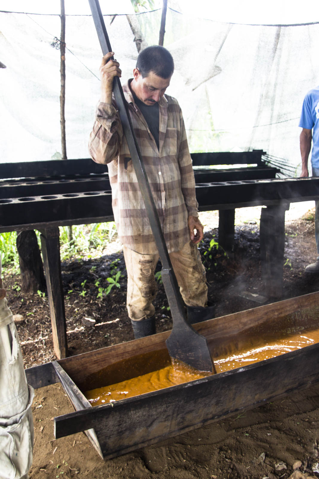 Le liquide commence à durcir, à prendre une teinte d’abord brune voire un peu verdâtre. Il faut alors le verser dans les moules en forme de cône tronqué. En quelques minutes seulement, il sera suffisamment solidifié pour être démoulé, et donner des blocs de tapa de dulce, prêts à être utilisés.