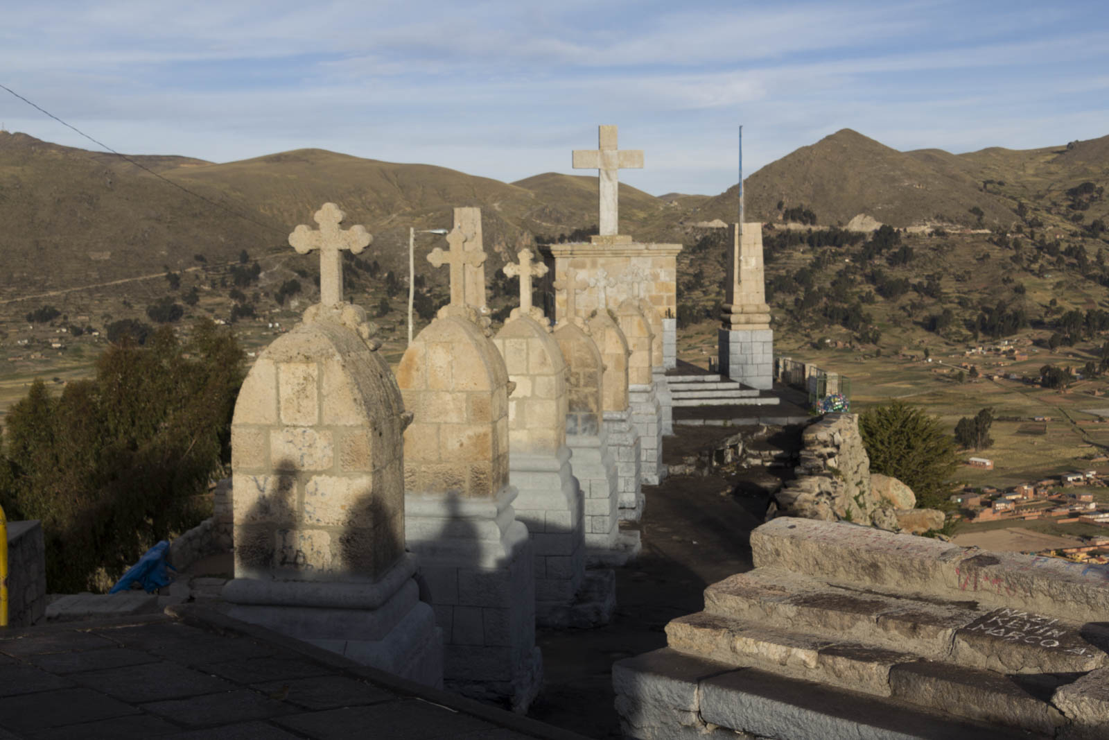Ensuite, Jhonny nous emmène à l’autre bout de la ville pour visiter le cimetière. Là, radical changement d’ambiance ! Comme à La Paz, on constate que les sépultures sont majoritairement disposées dans de petites cases formant de grands blocs. Les cases sont souvent bien entretenues, fleuries, avec toujours un peu d’eau pour le défunt. On découvre aussi que les grands blocs sont regroupés suivant la fonction des défunts : un pour les chauffeurs de bus, un pour les professeurs, un pour les cheminots… Etrange conception de la mort, où la corporation prime sur la famille.