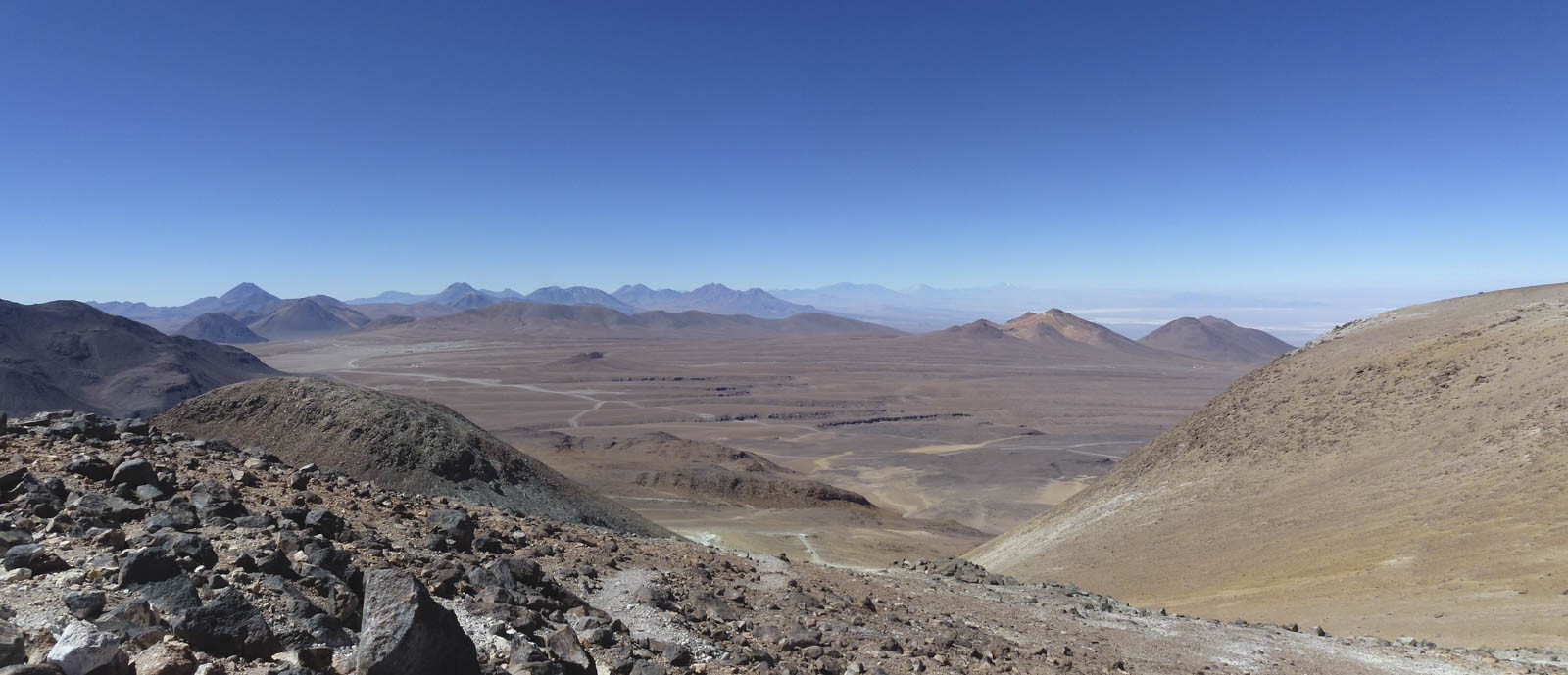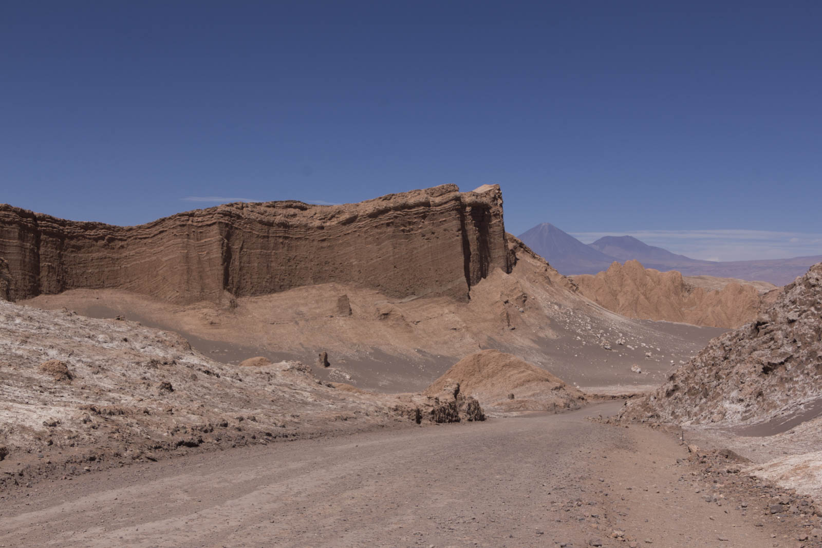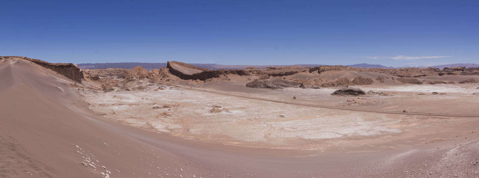 L’apothéose intervient un peu plus loin, en suivant un petit sentier qui passe derrière une dune. Après une vingtaine de minutes de marche, on arrive au sommet d’un promontoire. Impossible d’aller plus loin, c’est bien trop pentu. Mais le paysage qui se dessine alors devant nous est à couper le souffle ! Un condensé de ce que regroupe le désert d’Atacama : des montagnes gris-brun, des déserts de pierre, de sable, de sel, une vallée aride où s’engouffre le vent, soulevant des nuages de poussière sous un magnifique ciel bleu azur. Pas un nuage à l’horizon, pas une trace d’humidité. Époustouflant !