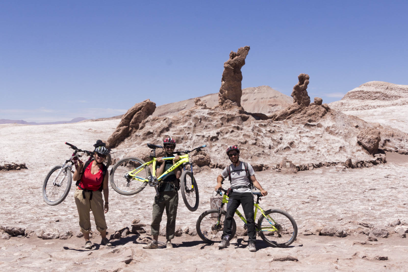 On reprend la route et nos vélos vers une immense dune de sable et de pierre, suivie d’impressionnantes formations rocheuses, puis de petits lacs de sel. Les paysages incroyables s’enchaînent au fur et à mesure de nos coups de pédales.