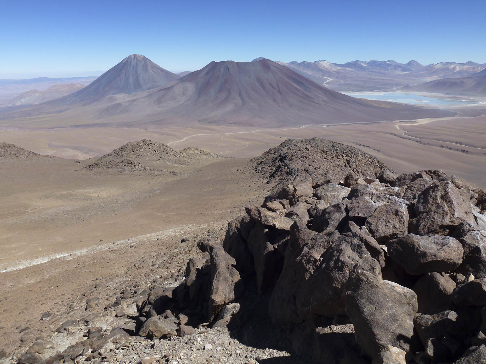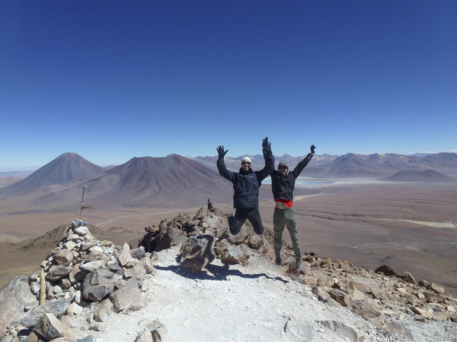 Le lendemain, c’était au tour de Pascal et Benoît de se rapprocher des étoiles. A pied cette fois. A l’aube, on est partis avec un guide s’attaquer au Cerro Tocco et ses 5604 mètres d’altitude. Après 1h50 d’ascension sans difficulté, le sommet est déjà là. La vue là haut est impressionnante, aux confins de 3 pays : le Chili, la Bolivie et l’Argentine. On distingue aisément le début du désert d’Atacama, les hauts sommets et volcans à la frontière chilo-argentine, la laguna Blanca et le volcan Licancabur que l’on avait déjà vus côté bolivien quelques jours plus tôt.