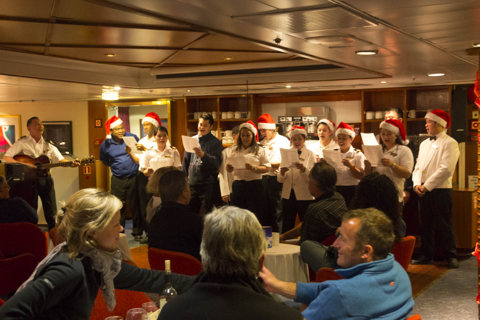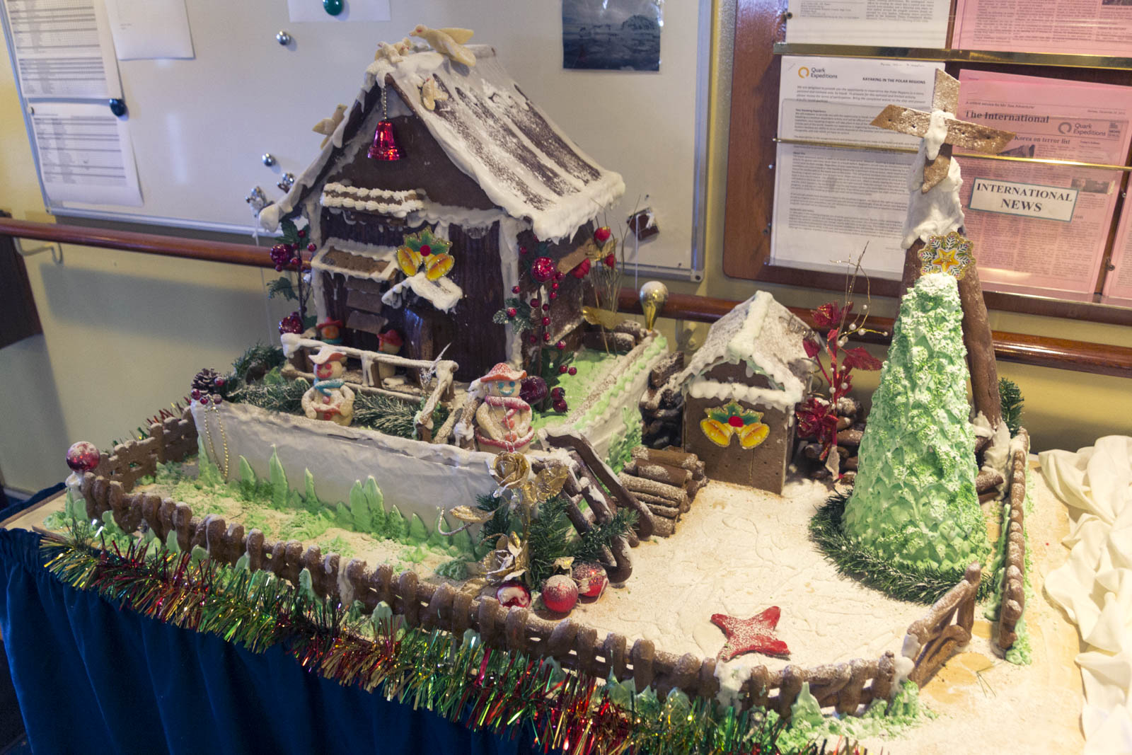 Youhou ! Le chef a réalisé une jolie maison en pain d’épices et l’équipe de la réception et des serveurs nous a même concocté quelques chants de Noël. Mais il faut dire que mon ventre me tiraille et je ne fais pas long feu dans le salon. Quel dommage. Au final je serai malade toute la nuit et passerai le 25 en quarantaine dans ma chambre ! En fait j’ai attrapé un virus intestinal qui court sur le bateau en ce moment parait-il. Pas de chance mais rendez-vous manqué avec Noël…