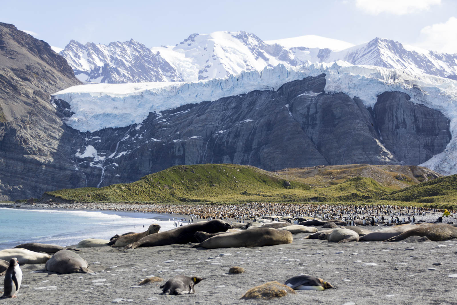Derniers pieds à terre en Géorgie du Sud, à Saint Andrew’s Bay. Et encore une fois nous en prenons plein les yeux. Glacier, pleine verdoyante et faune incroyable. Nos désormais habituels amis sont là : otaries, éléphants de mer et manchots royaux.