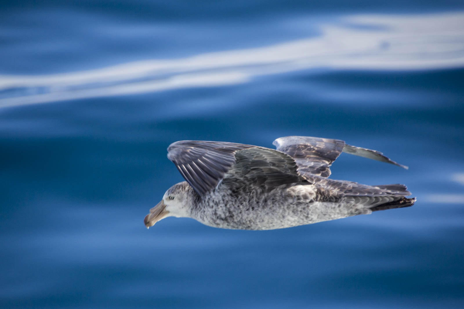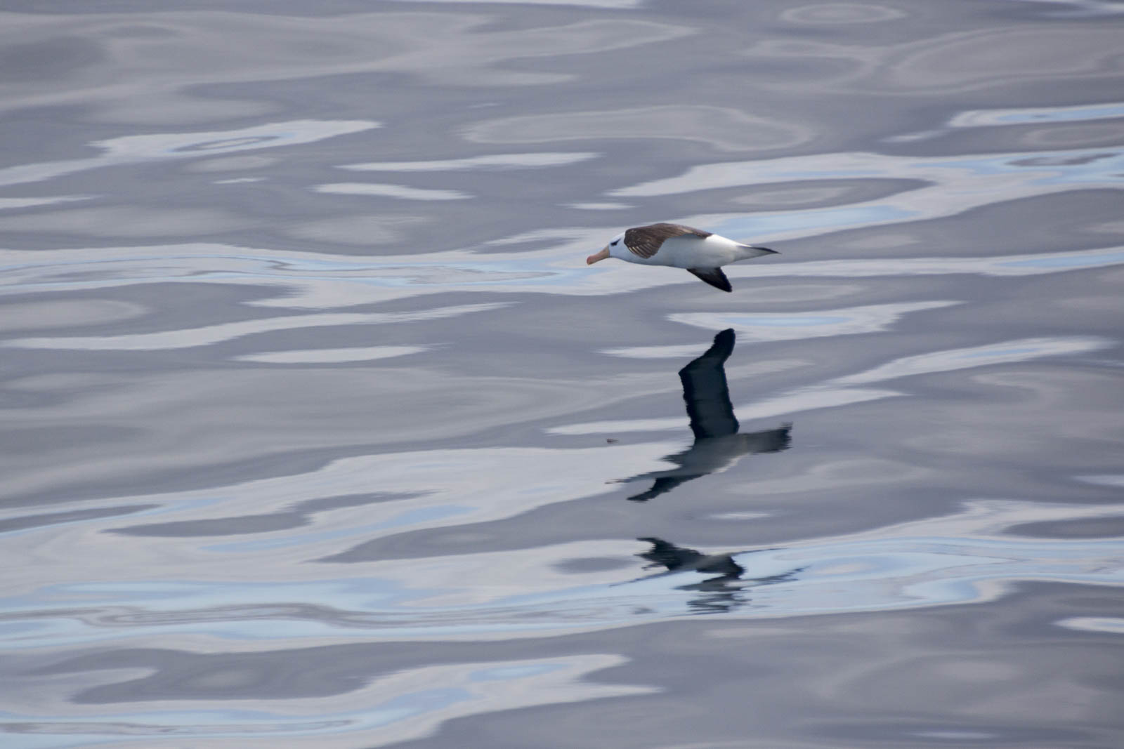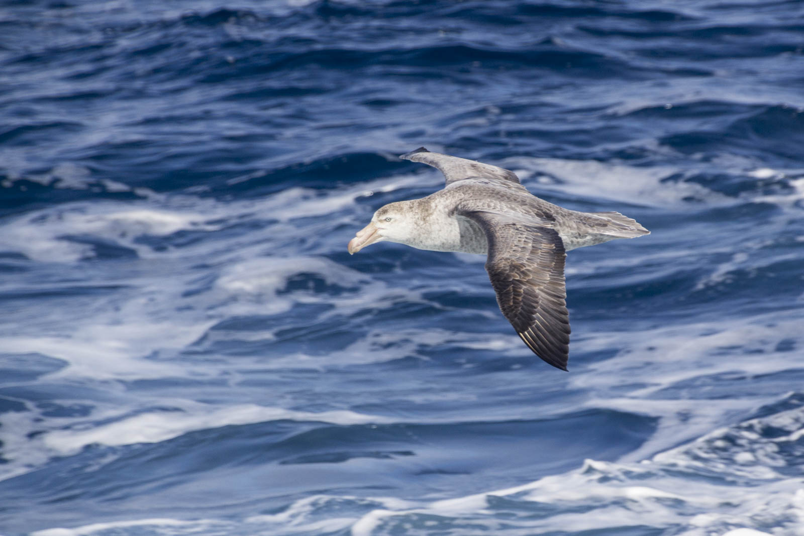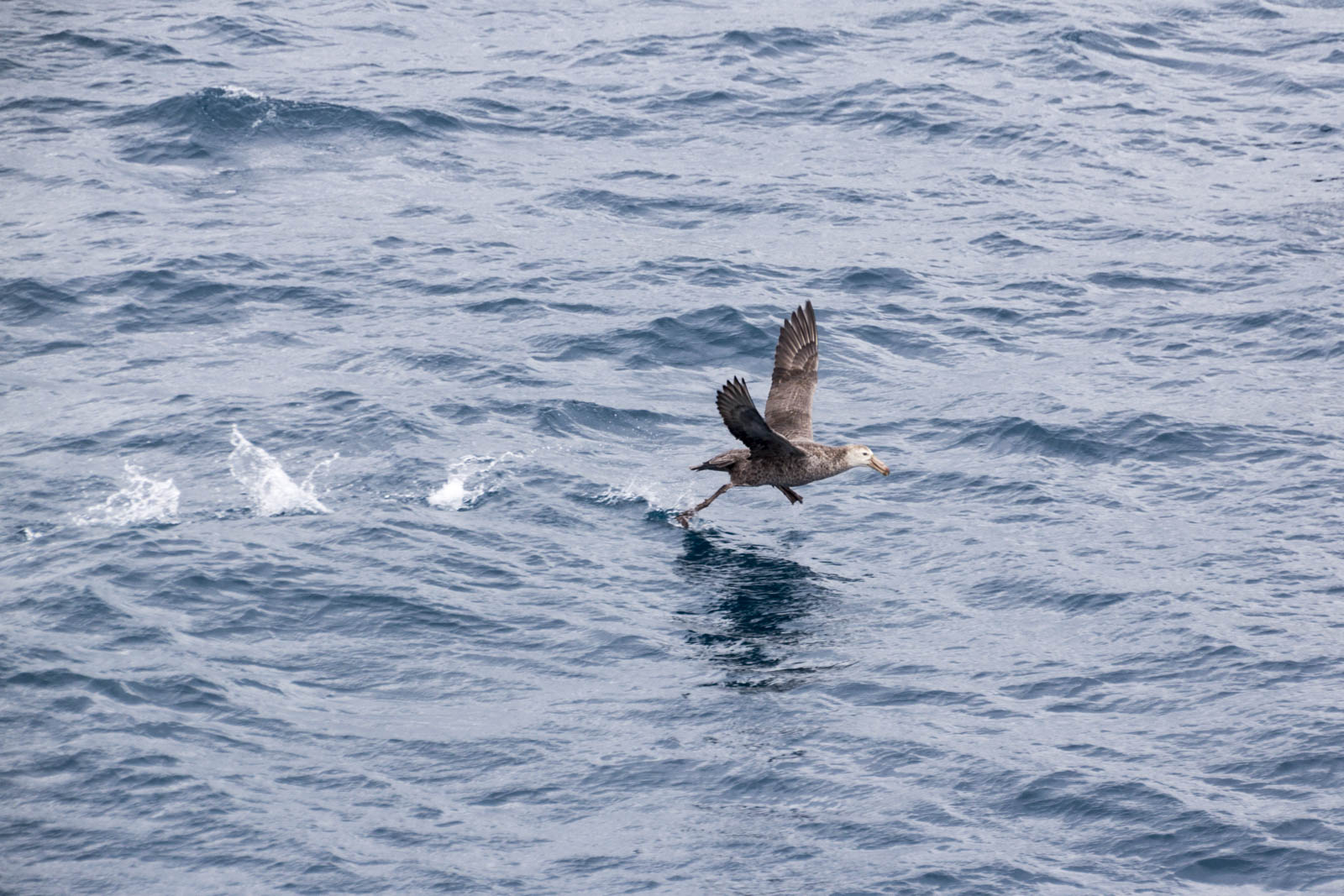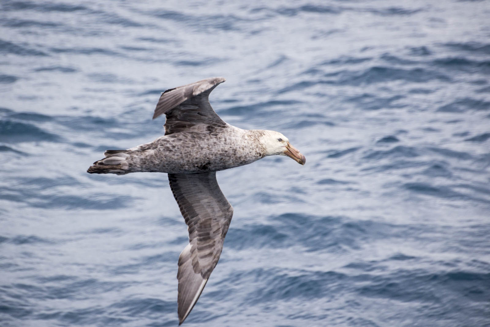 Ma première rencontre avec celle-ci a d’abord été avec les oiseaux marins. Première expérience en mer, aucune connaissance en ornithologie : la découverte a donc été totale pour moi ! Et je me suis surpris à passer beaucoup de temps à les observer sur le pont arrière du bateau, surtout les premiers jours. Car au bout d’un moment, en fait, c’est toujours un peu la même chose. Bien sûr les experts rencontrés sur le bateau avec leur paire de jumelles et leur énorme objectif d’appareil photo me rétorqueront, sans doute à raison : « Mais non, ce n’est pas du tout la même chose. Regarde ce grand oiseau gris, et bien il a une tâche verte sur le bec. C’est donc un pétrel géant. Alors que l’autre grand oiseau gris là-bas, il a le bout du bec rougeâtre, c’est donc un pétrel de Hall« . Mouais… En même temps, je n’ai ni paire de jumelles, ni gros appareil photo, donc à l’œil du nu, c’est assez difficile d’identifier ce genre de subtilités, surtout sur un oiseau en mouvement.