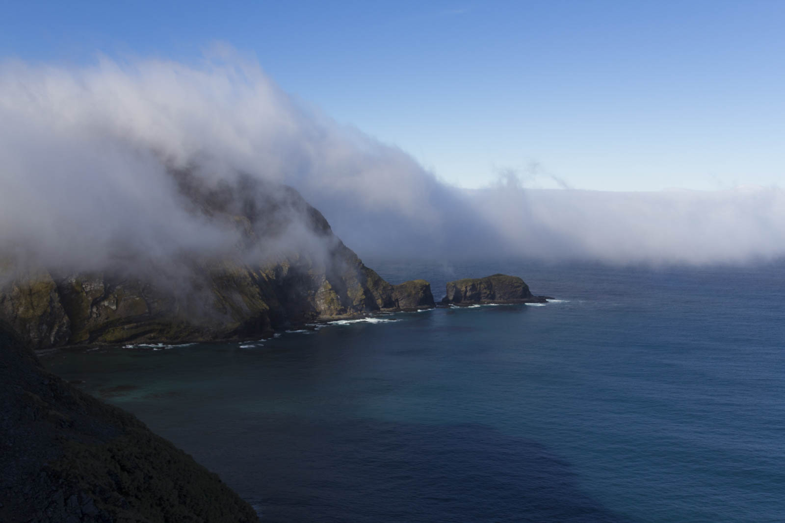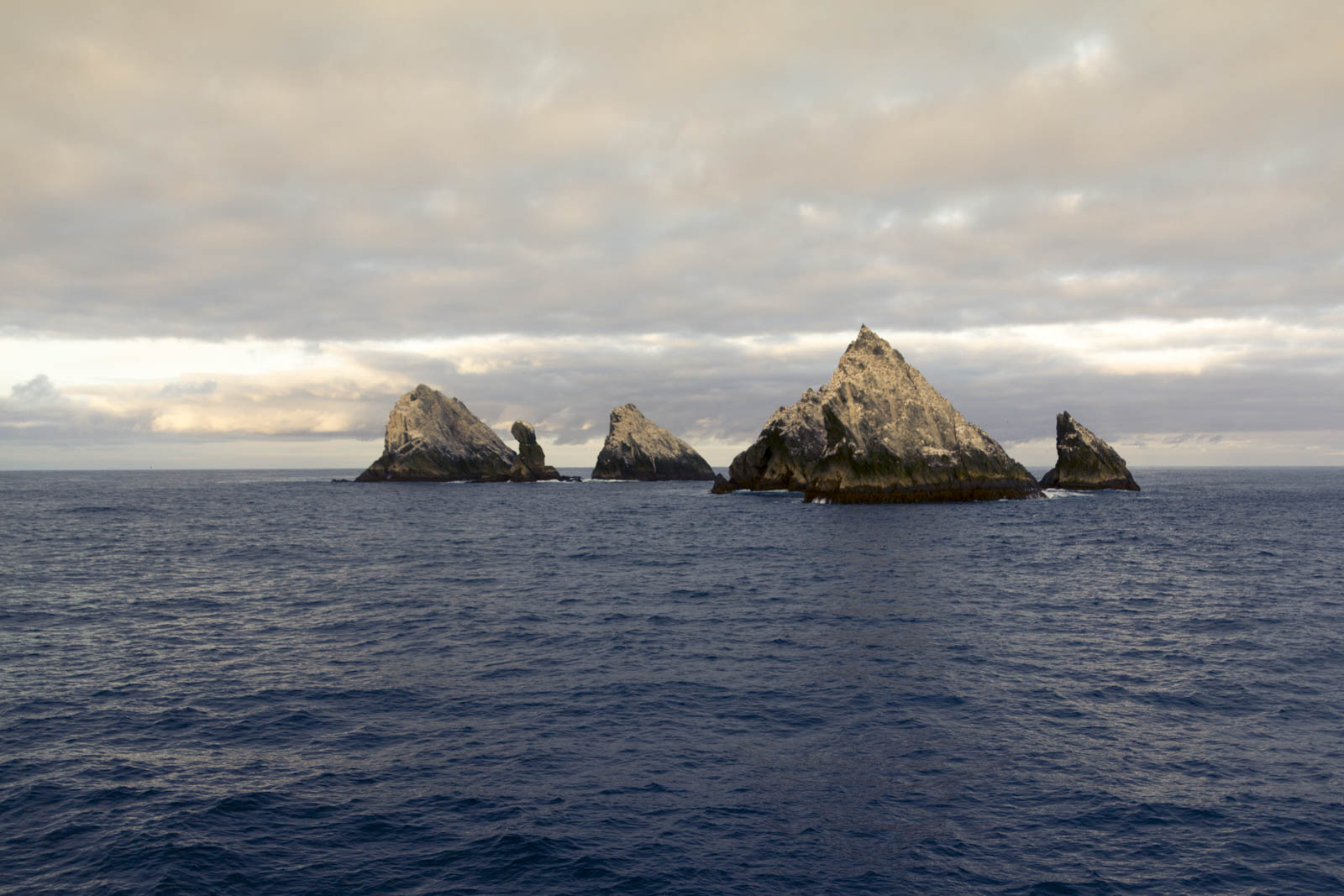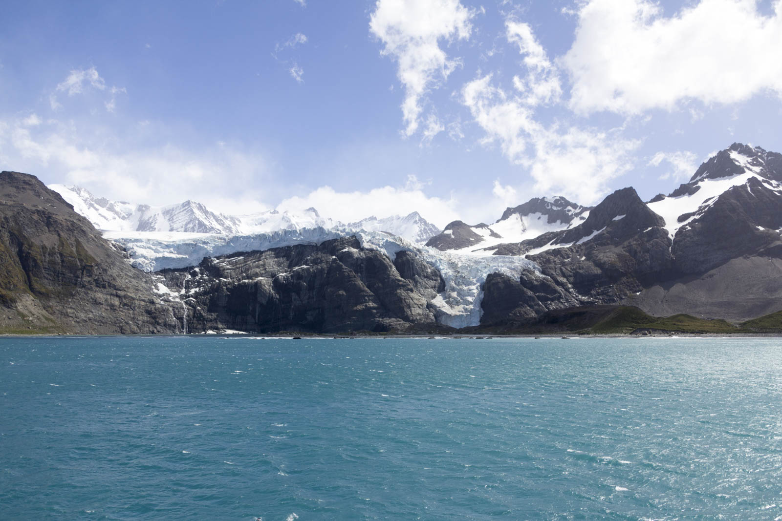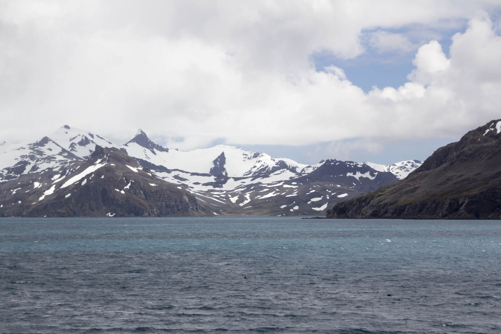 En quittant les Malouines, nous avons aussi quitté nos derniers paysages de végétation. Après, tout n’a été que neige, glace, roche, sable voire cendre… Mais tellement bien agencés ! Par exemple, Shag Rocks (ou îles Aurora) : juste six gros cailloux qui émergent au milieu de l’océan, à 1000 km des dernières côtes des Malouines et 240 km des premières de la Géorgie du Sud, donc seulement accessibles et visibles en bateau. Encore un paradis pour les oiseaux et quelques manchots, qui sont même venus nous saluer près du bateau lors de notre passage au large de ces rochers. C’est vrai que les visiteurs doivent y être rares ! Telles des pyramides naturelles surgies du fond de l’eau, ces îlots m’ont vraiment impressionné, notamment par le nombre d’oiseaux et de manchots qui habitent sur ces quelques mètres carrés disposés quasi à la verticale. Une merveille de géologie et de biologie marine ! Et une belle introduction à la Géorgie du Sud.