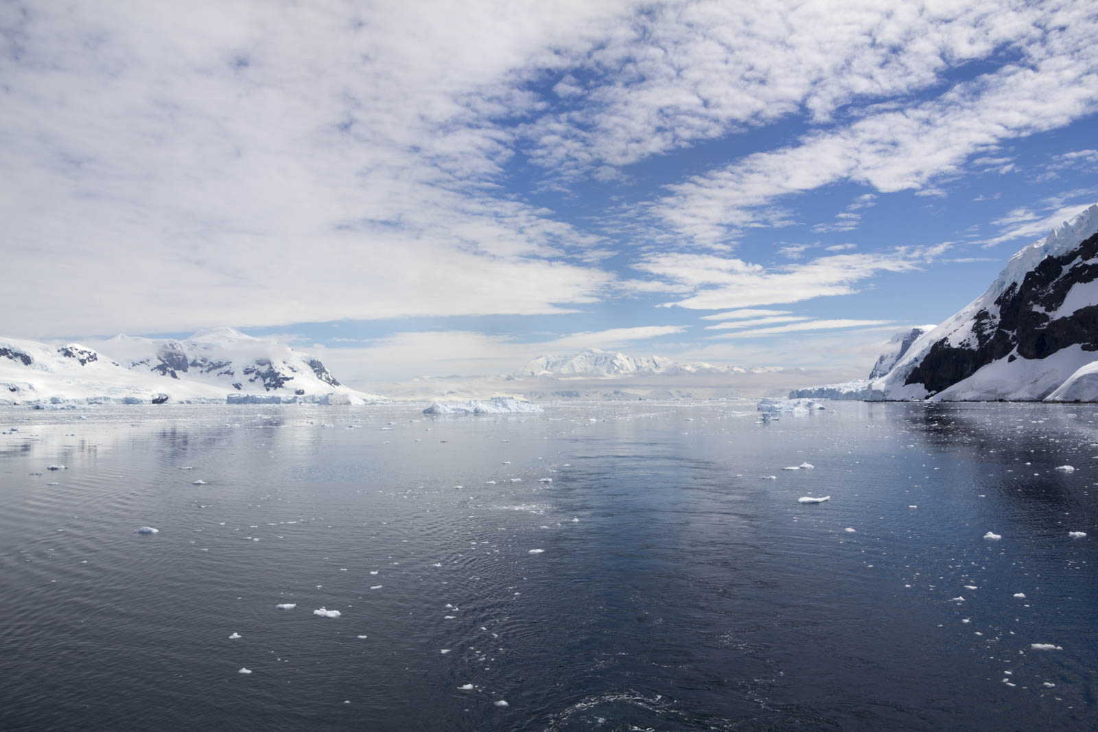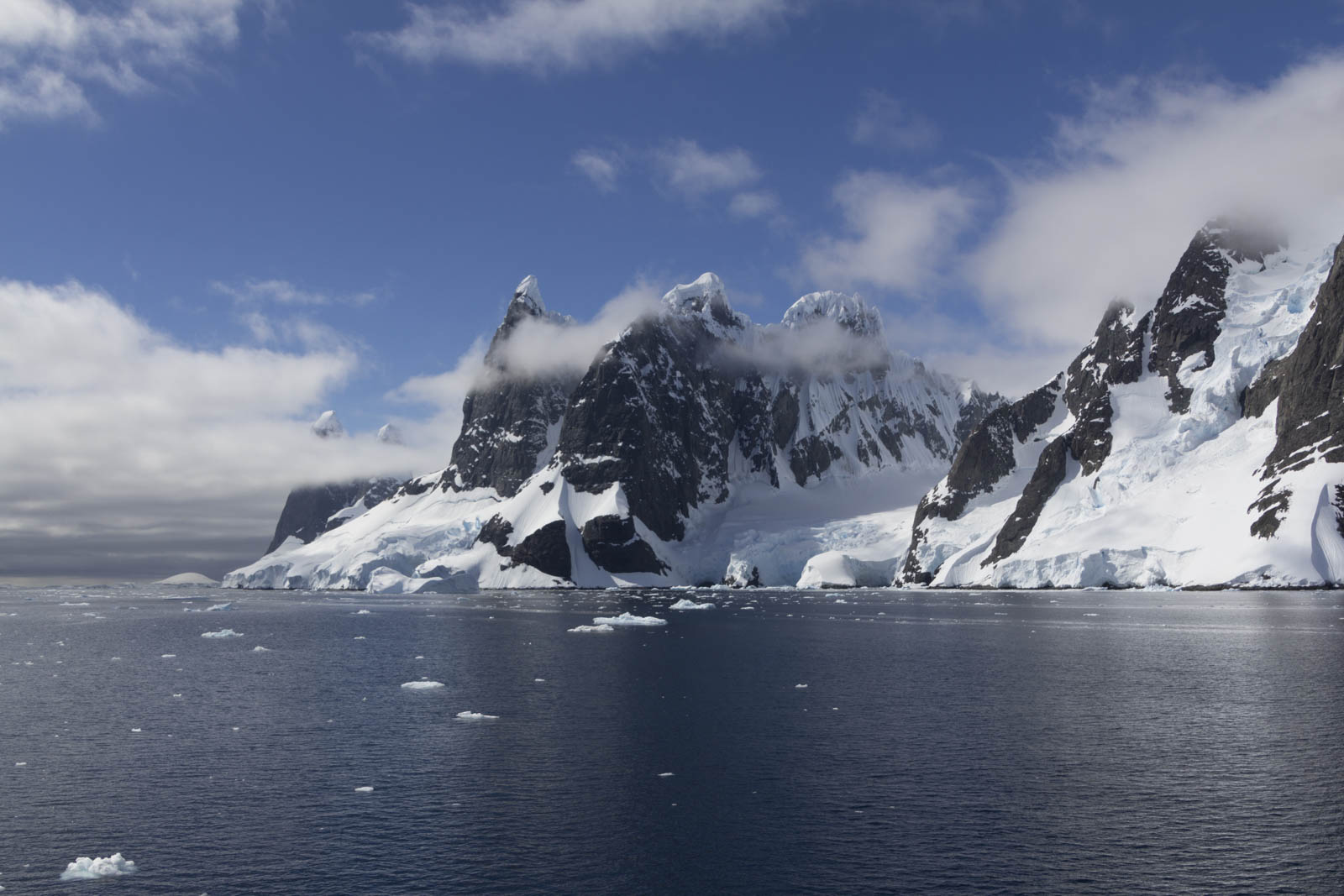 Quant à la navigation au large de la côte Ouest de la péninsule Antarctique, c’est assez difficile à décrire… Si je peux dire que tout ce que j’ai vu avant m’a émerveillé, alors les mots me manquent cruellement pour décrire les paysages du septième continent. Vu depuis le bateau, on est très loin de la représentation que l’on a, dans notre imaginaire, de l’Antarctique : une infinie étendue blanche et plate. C’est bien plus montagneux et diversifié que cela. Au début, la basse et grise couverture nuageuse donnait un air mystique aux paysages. On se disait : « c’est normal, c’est l’Antarctique, il doit faire souvent gris ». On distinguait seulement au loin quelques bouts de montagne cachés derrière les nuages, laissant apercevoir le mystérieux continent.