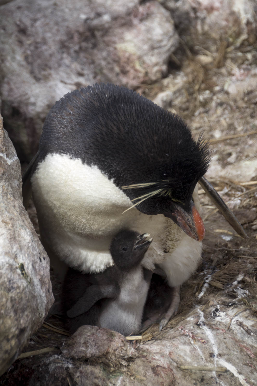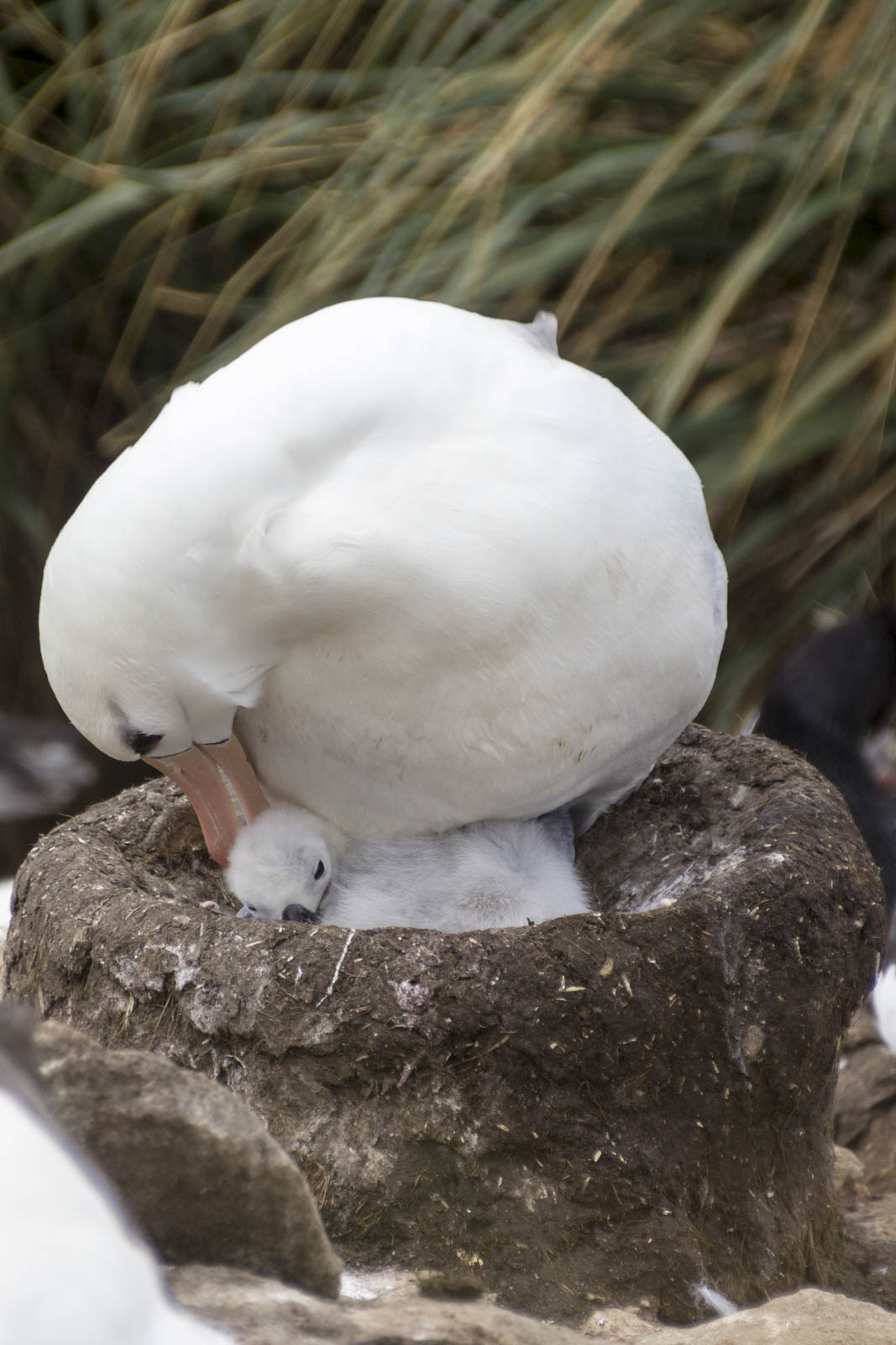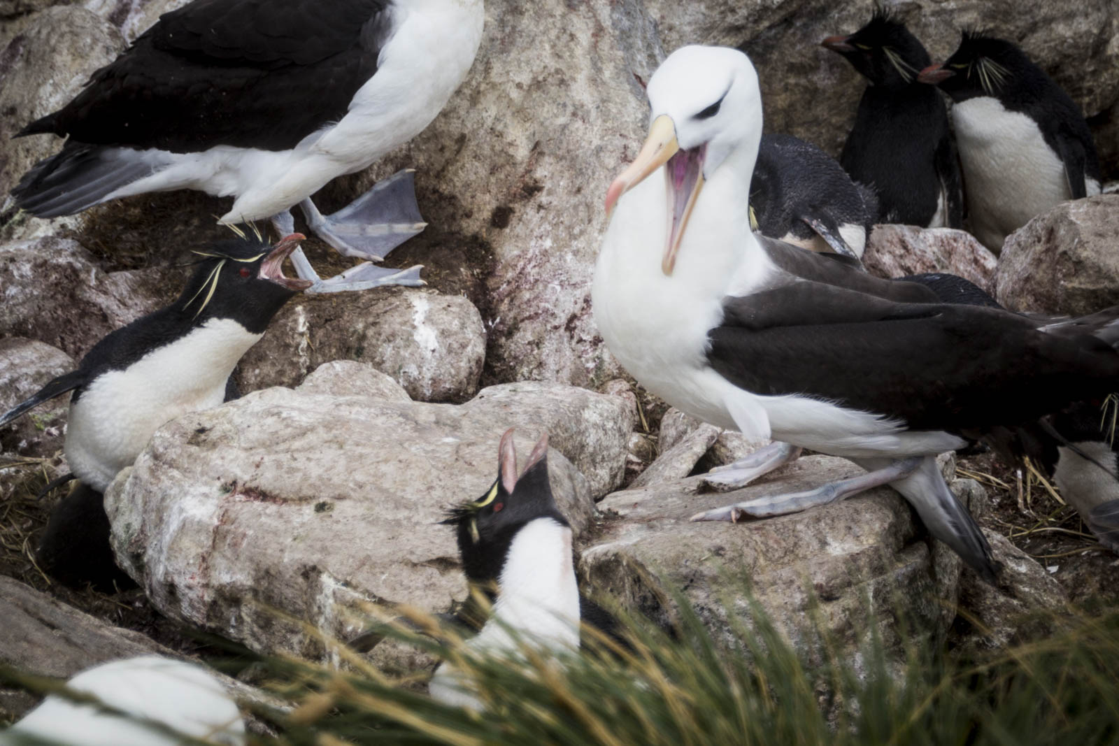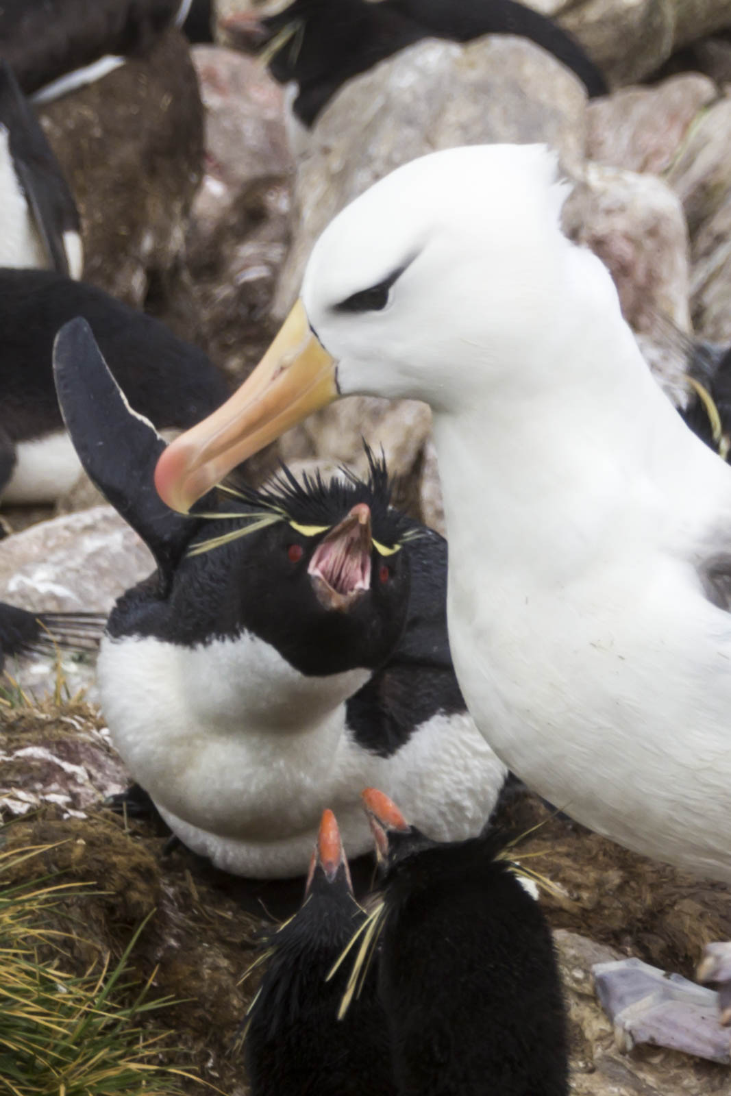 En continuant d’avancer au milieu des hautes herbes, on découvre de plus en plus d’albatros assis sur leur nid de pierre, protégeant qui son œuf, qui son tout petit. Et tiens, c’est quoi cet autre oiseau très bizarre au milieu des albatros ? On dirait des manchots, avec une sorte de crête et des yeux rouges… Oh, ce sont des « rockhopper penguins » (gorfous sauteurs) ? Incroyable, ils sont également en train de couver sur les mêmes rochers que les albatros ! Les deux colonies se partagent ce petit bout de terre pour faire naître leurs petits, et la cohabitation semble assez pacifique. Bien sûr chacun défend becs et… becs son espace vital, les quelques décimètres autour de son nid, mais globalement les lieux sont habités par une grande tranquillité.