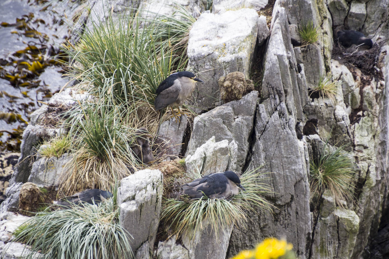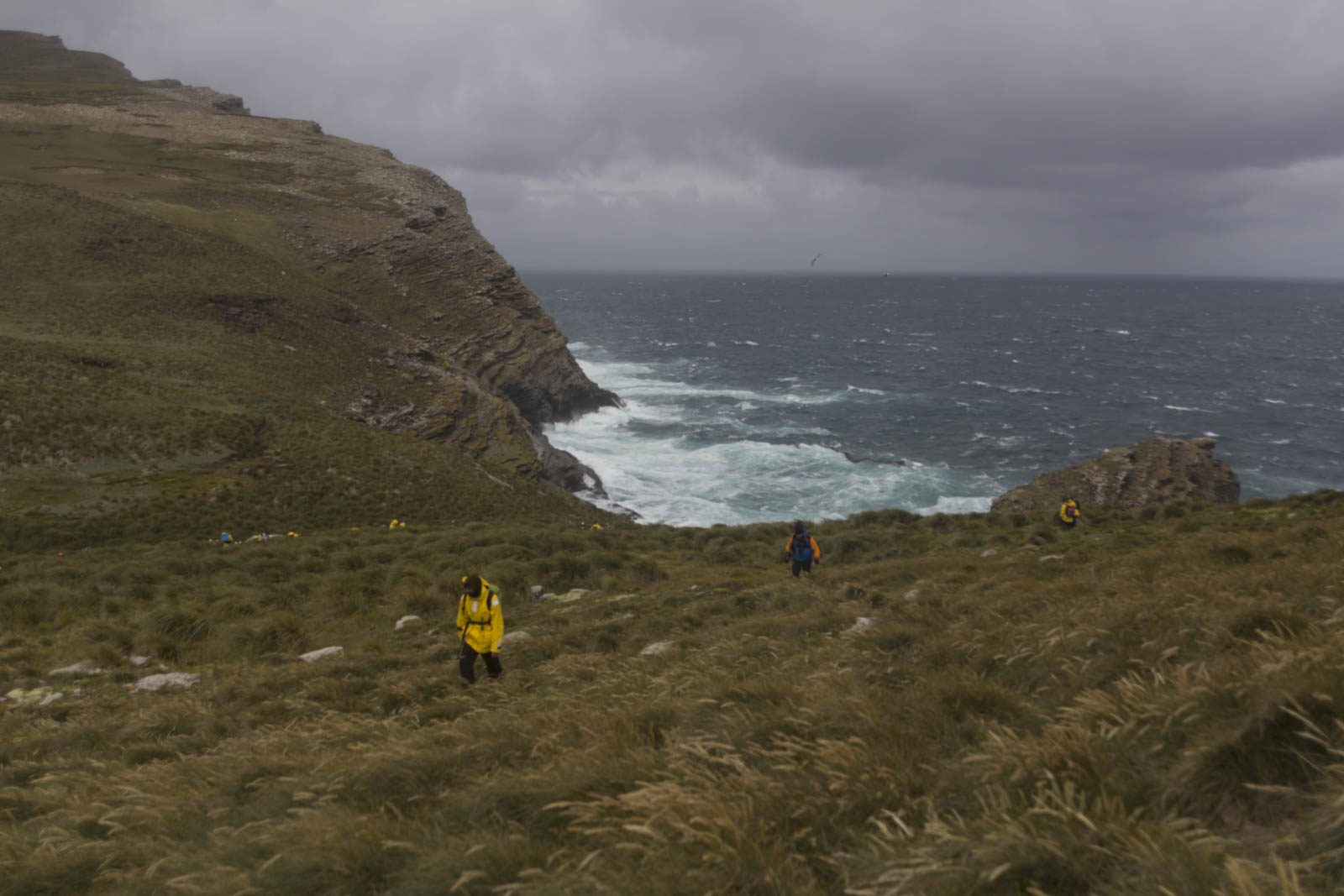 On débarque donc en zodiaque sur une petite plage, avec un peu plus haut une maison entourée de quelques arbres complètement déformés par le vent. Mais point de faune abondante ! On suit un chemin, grimpe en haut d’une petite colline sous une fine pluie et un fort vent, et là, toujours rien. Seulement quelques canards et quelques oiseaux, et beaucoup de parkas jaunes cheminant en file indienne sur les collines verdoyantes. Puis après 45 minutes, on commence à apercevoir la mer, de l’autre côté de l’île. Je me dis que les 2-3 oiseaux qu’on voit au loin sont peut-être ce qu’il y a à observer finalement, et commence donc à les regarder de plus près. Mouais, j’y connais peut-être pas grand-chose en oiseaux, mais là c’est quand même pas ouf…