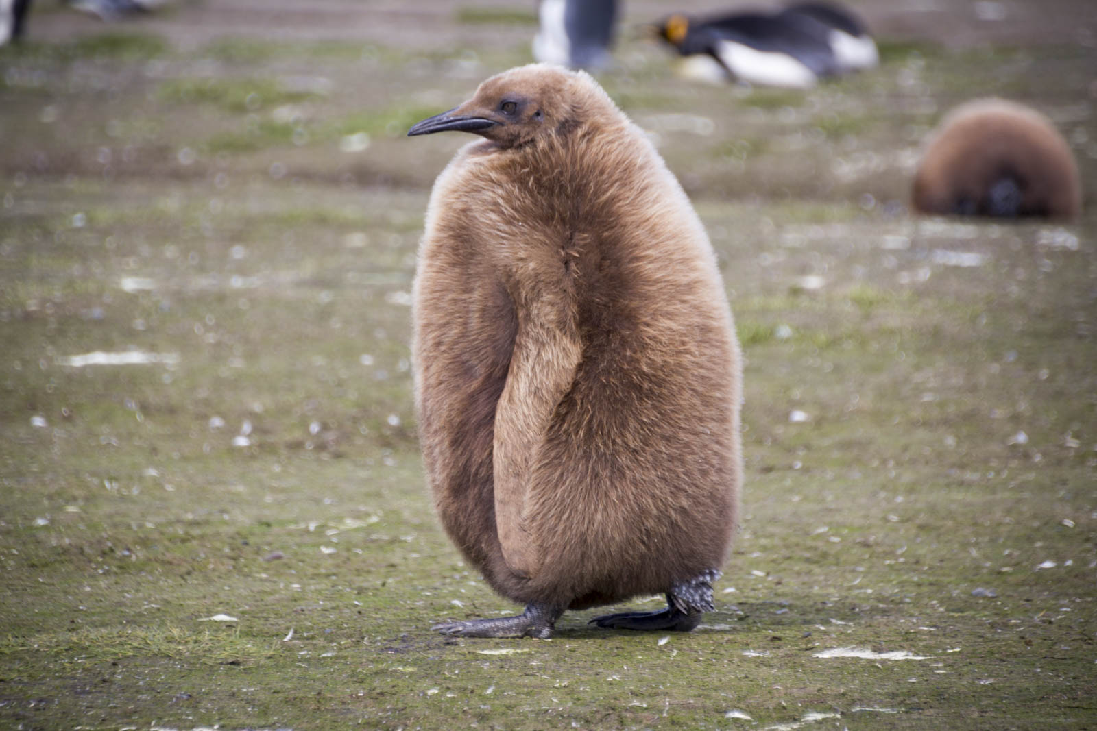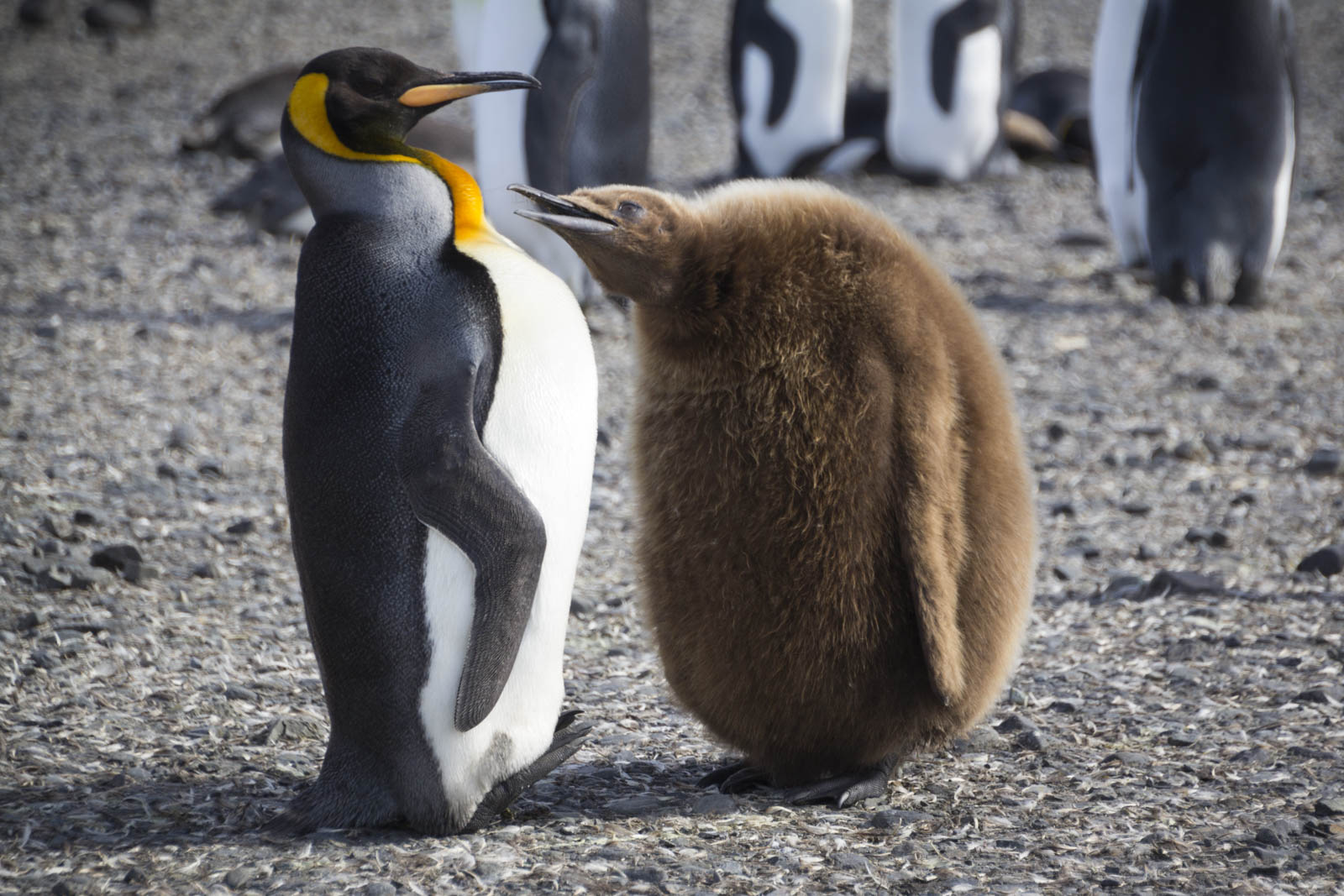 Au milieu des manchots royaux adultes et de leurs petits, on trouve en plus les jeunes nés l’année précédente. Ceux-ci ont déjà atteint la taille adulte, ou presque, mais ne sont pas encore capables de se nourrir seuls. Alors ils passent leur temps à suivre un de leurs parents, en attendant qu’il lui donne à manger. Les voir ainsi marcher gauchement derrière leur parent, en permanence, est déjà un spectacle en soi. Mais en plus, leur physique les dessert complètement : ils ne ressemblent vraiment à rien ! Ils sont tout recouverts d’un épais duvet marron qui ne leur donne absolument aucune allure comparé au beau plumage noir et blanc de l’adulte, avec sa tâche orange sous la gorge. Mais on a envie que d’une chose, finalement, c’est de se serrer contre ces grosses boules de plumes toutes brunes !