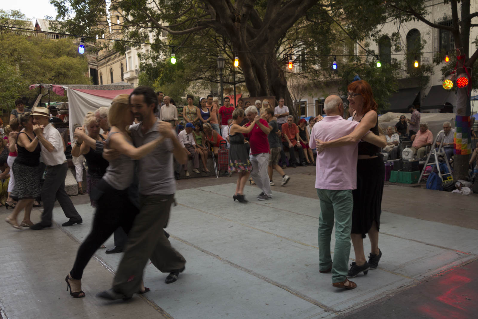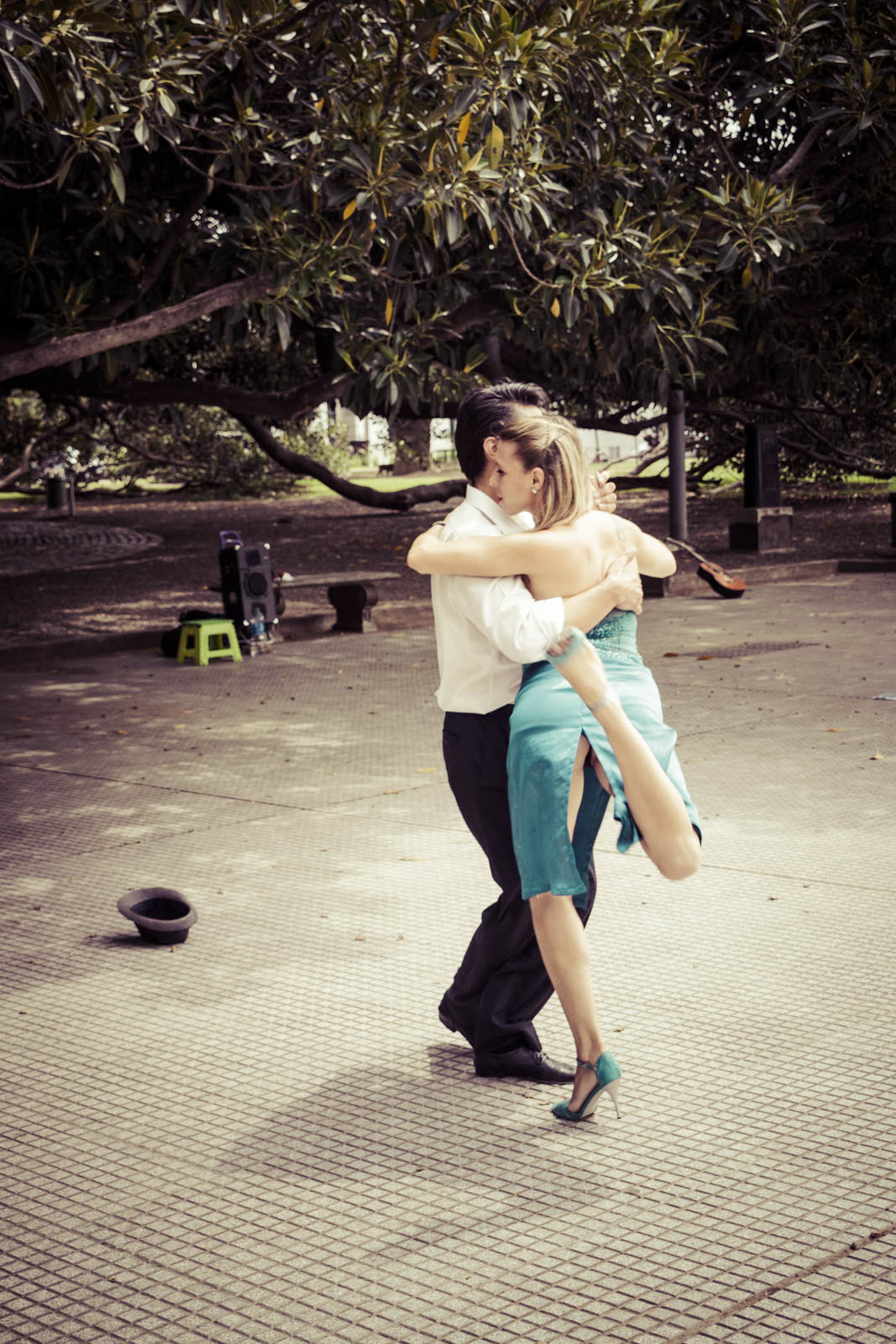Ensuite, le mode opportuniste : il suffit de se balader dans les rues, le samedi soir, ou le dimanche après-midi, pour voir des Porteños danser sur une place, dans un kiosque ou dans un parc. C’est un peu aussi cela qui fait le charme de Buenos Aires, de flâner au hasard d’un quartier et de tomber ainsi sur une milonga en plein air.