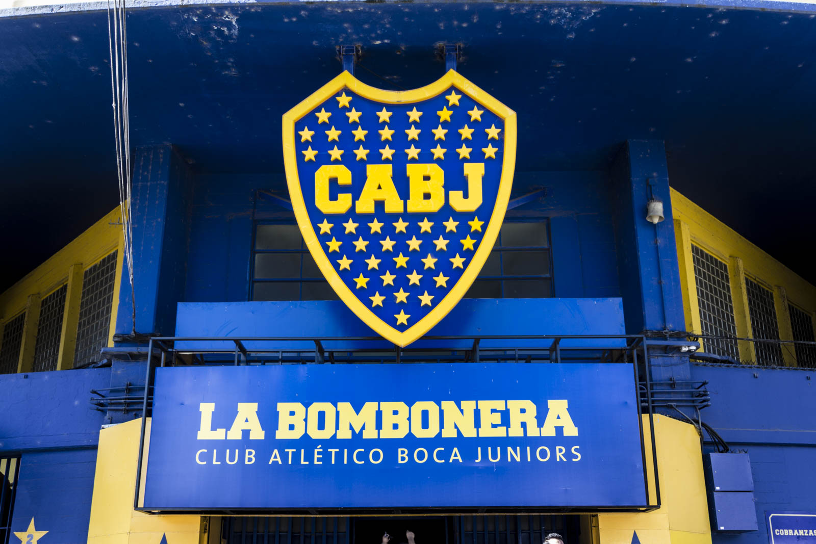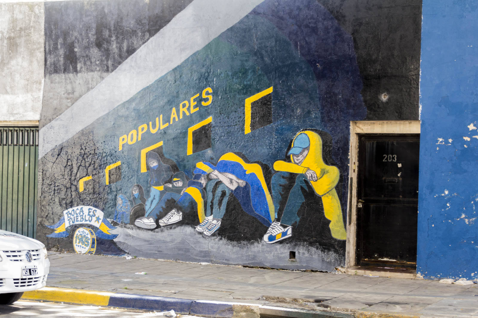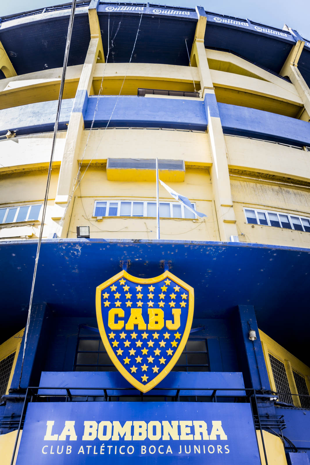 Et effectivement ça tranche nettement avec ce qu’il y a en dehors de ces trois rues, dans la vraie Boca, celle qu’on nous a recommandé de ne pas traverser en raison de sa dangerosité. Pourtant nous l’avons traversée, un peu. Mais peut-être était-ce l’heure de la sieste… On a ainsi pu découvrir la célèbre Bombonera, le stade mythique des Boca Juniors, et toutes les maisons autour du stade qui sont peintes en bleu et jaune, les couleurs du club. On ose à peine imaginer l’effervescence qui doit gagner ces rues les soirs de match. Malheureusement, il n’y en avait point ce jour-là, la saison ne reprenant que quelques jours plus tard.