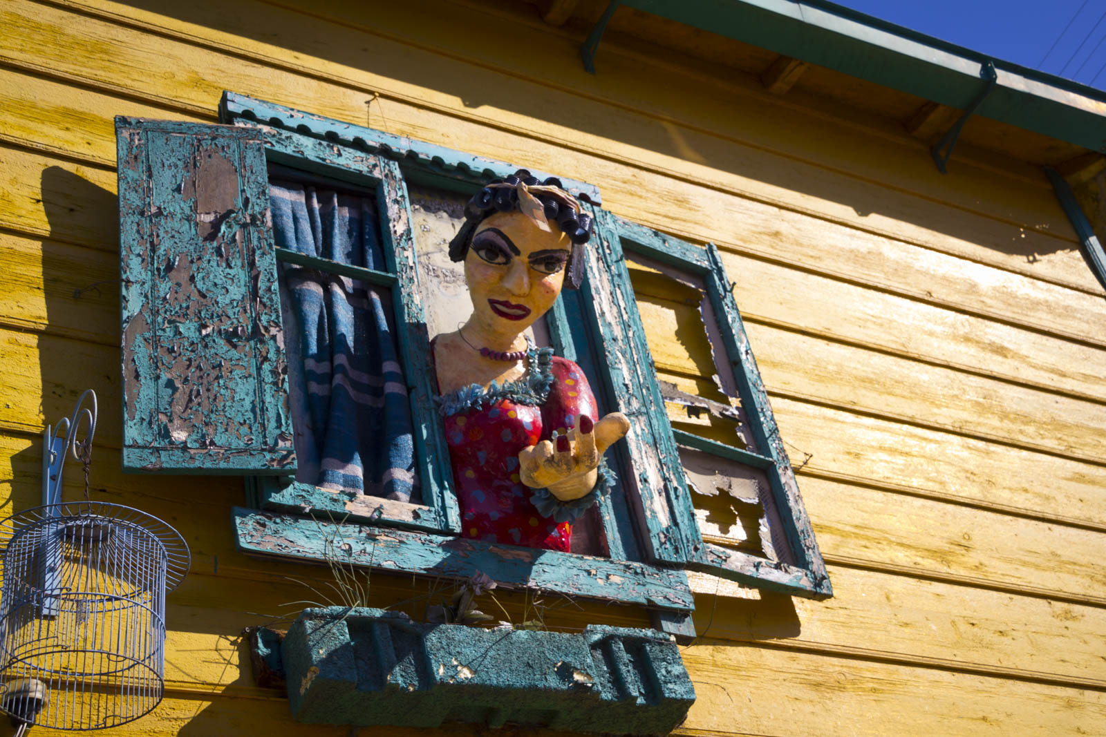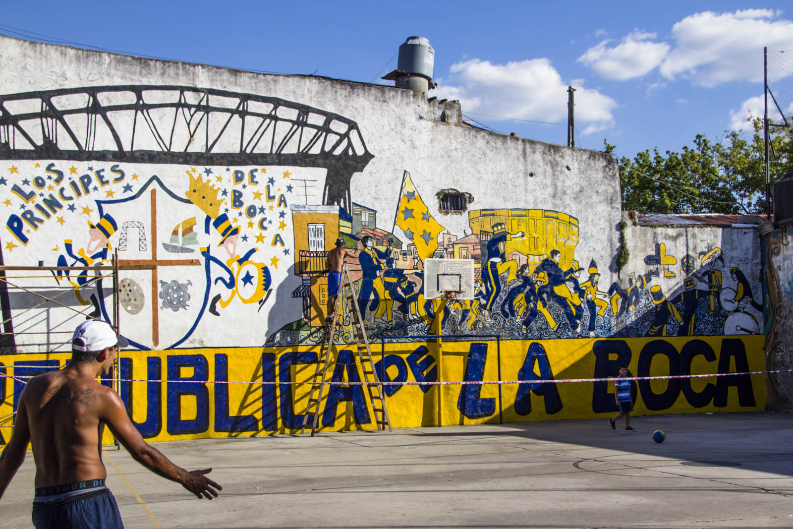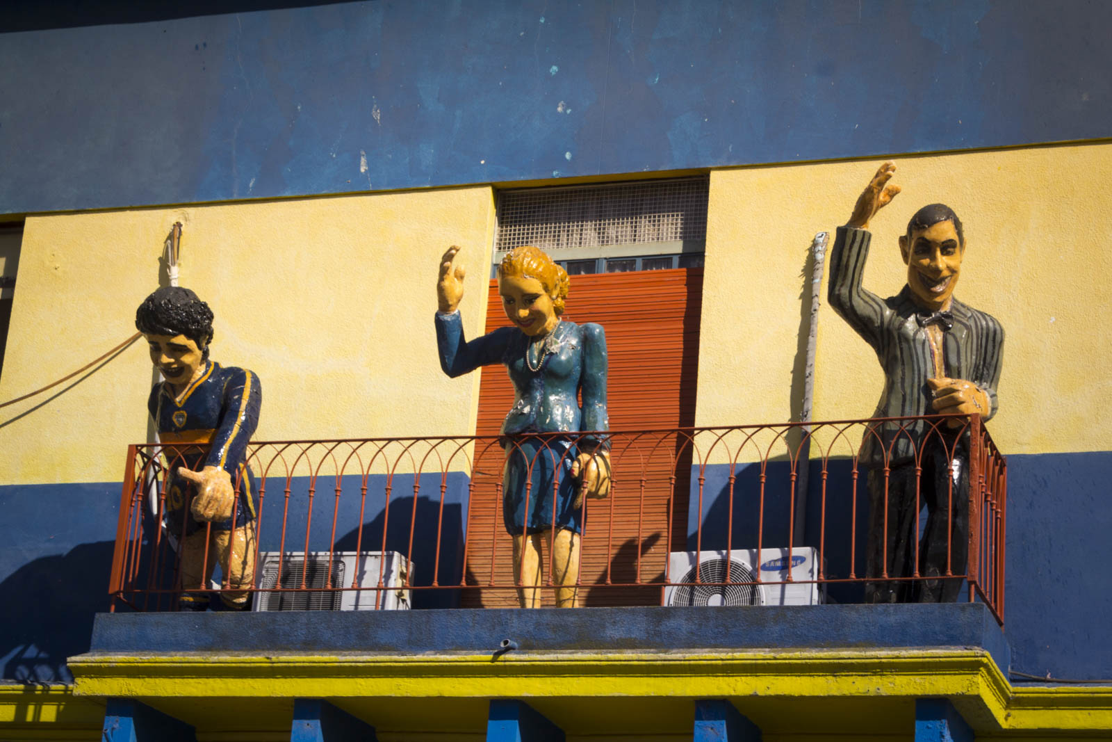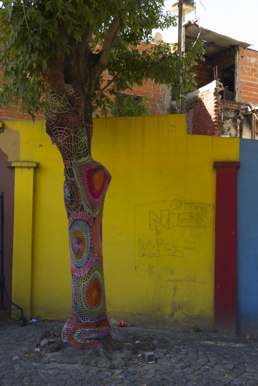 Et effectivement ça tranche nettement avec ce qu’il y a en dehors de ces trois rues, dans la vraie Boca, celle qu’on nous a recommandé de ne pas traverser en raison de sa dangerosité. Pourtant nous l’avons traversée, un peu. Mais peut-être était-ce l’heure de la sieste… On a ainsi pu découvrir la célèbre Bombonera, le stade mythique des Boca Juniors, et toutes les maisons autour du stade qui sont peintes en bleu et jaune, les couleurs du club. On ose à peine imaginer l’effervescence qui doit gagner ces rues les soirs de match. Malheureusement, il n’y en avait point ce jour-là, la saison ne reprenant que quelques jours plus tard.