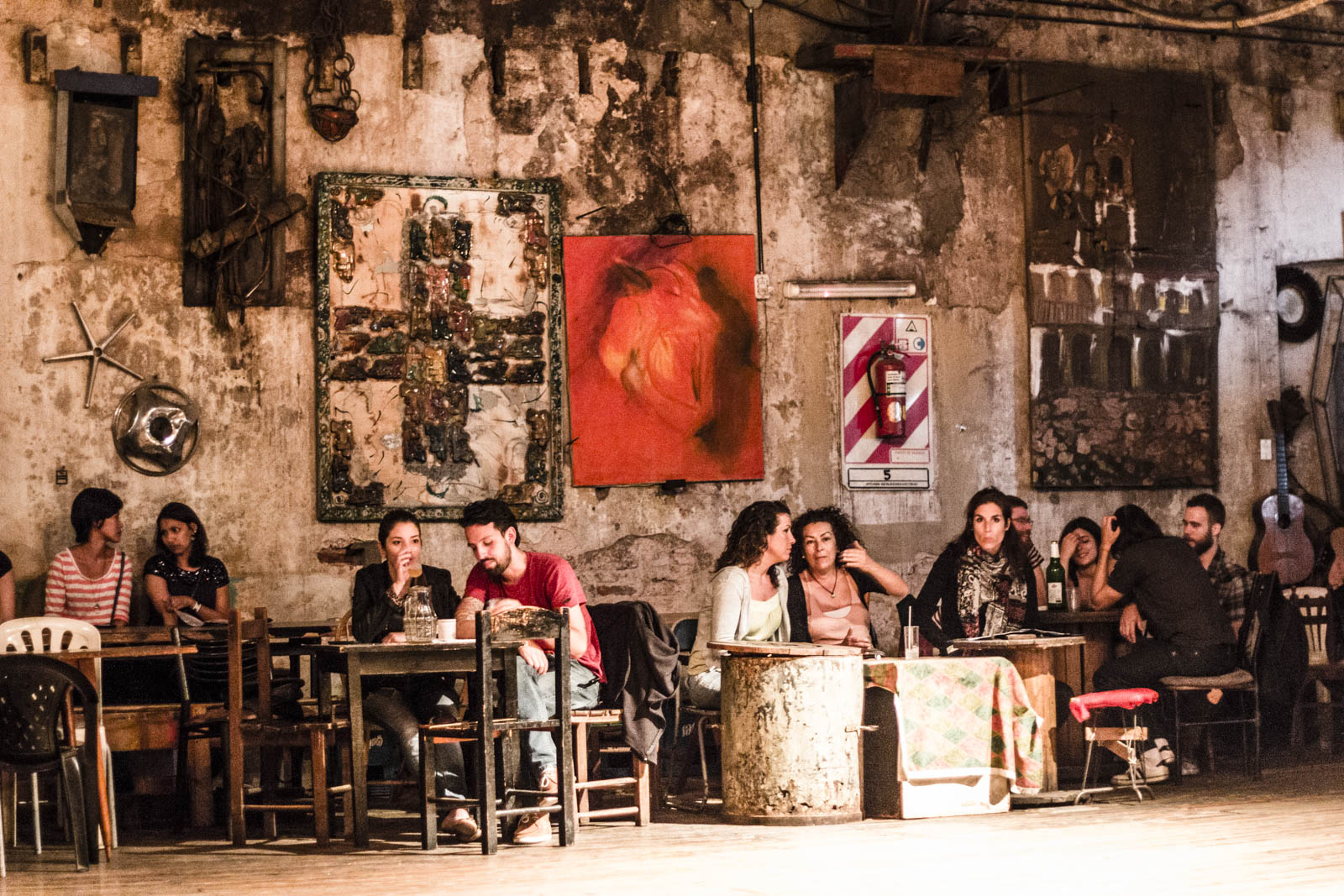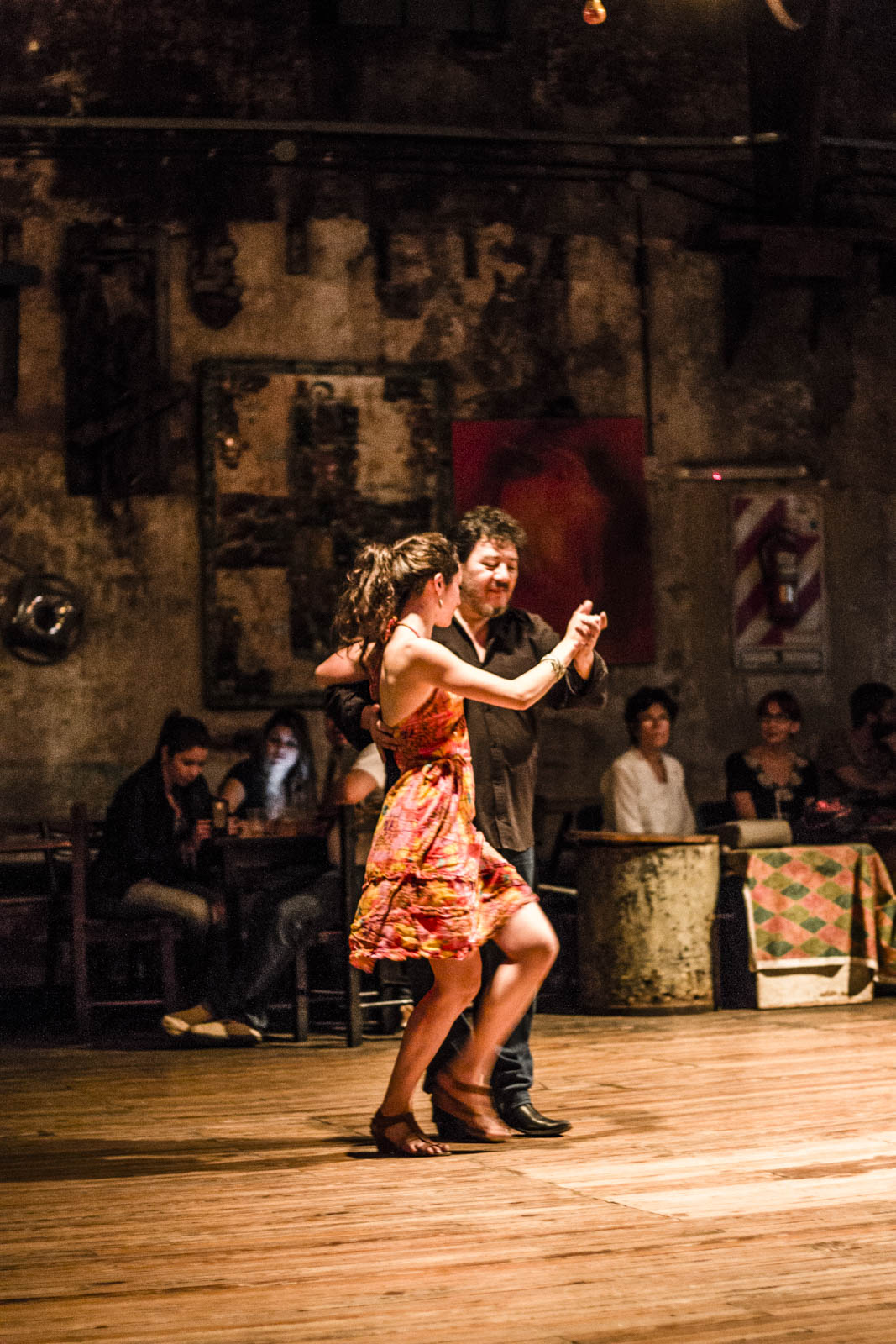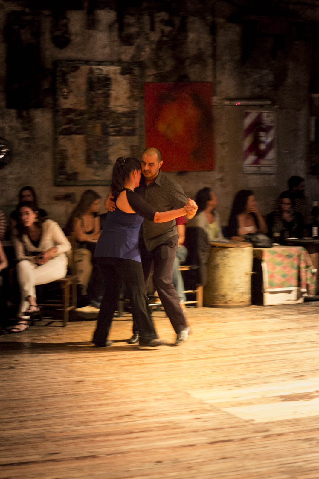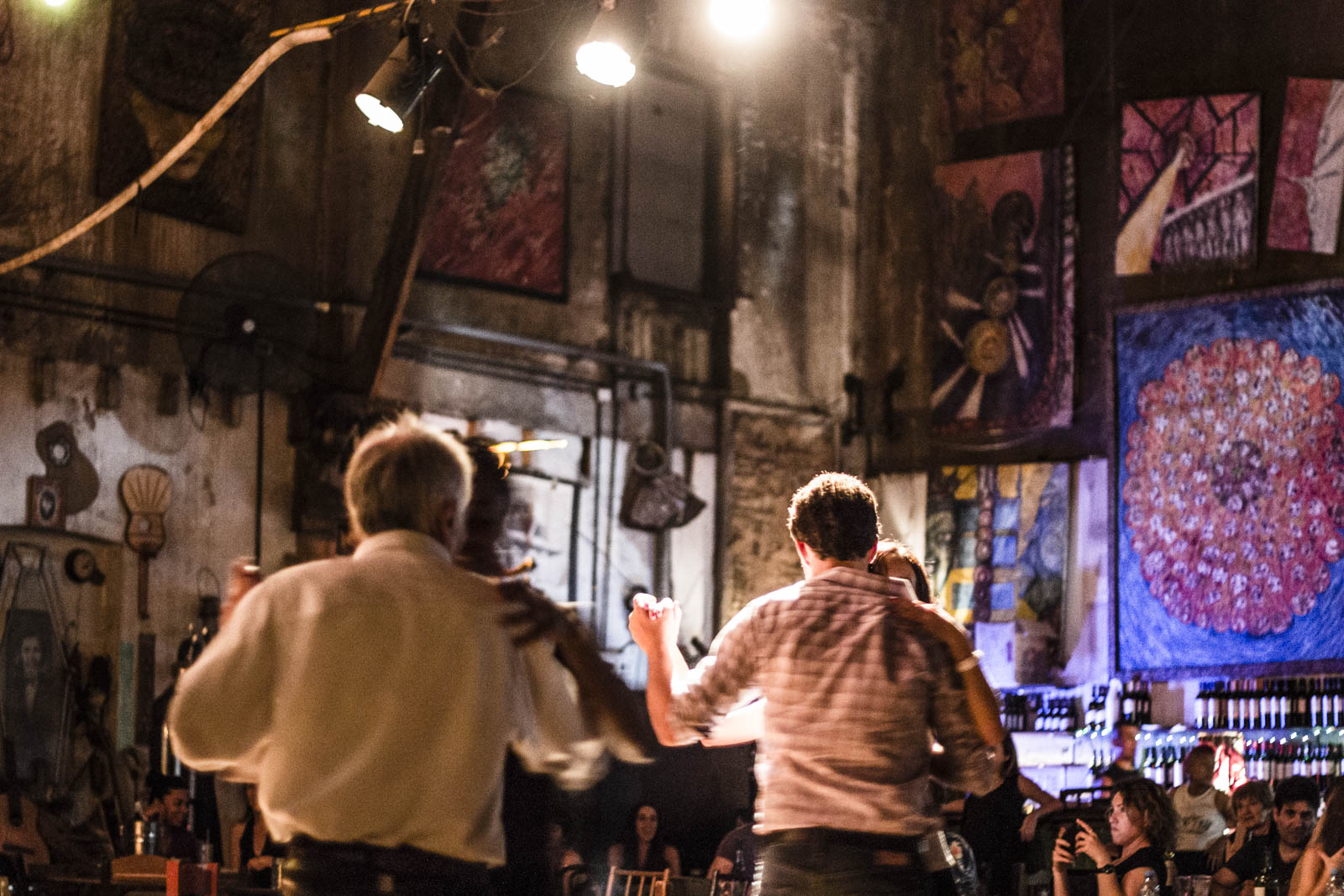Enfin, le mode plus impliqué : dans une milonga, ces lieux où l’on danse le tango. Il y en a plein à Buenos Aires, partout et de tous les types. Gratuit ou payant, avec ou sans orchestre, avec ou sans leçons, avec ou sans bar. Nous, on est allé un jeudi soir à la Catedral, un ancien bâtiment « industriel », très haut de plafond, re-décoré et reconverti en espace dédié à la musique et à la danse. Les lieux ont beaucoup de cachet et ajoutent au caractère mystique de la musique du tango. Là, à partir de minuit – car souvent on commence à danser très tard dans les milongas – les couples se mettent en action. Il y en a de tout âge et de tous niveaux. Chacun va à son rythme, plus ou moins vite, plus ou moins fluide, plus ou moins ample. Mais le spectacle de ces couples dansant et tournant tous dans le même sens, en dépit de leur grande différence d’âge, d’expérience et de talent, est vraiment très beau.