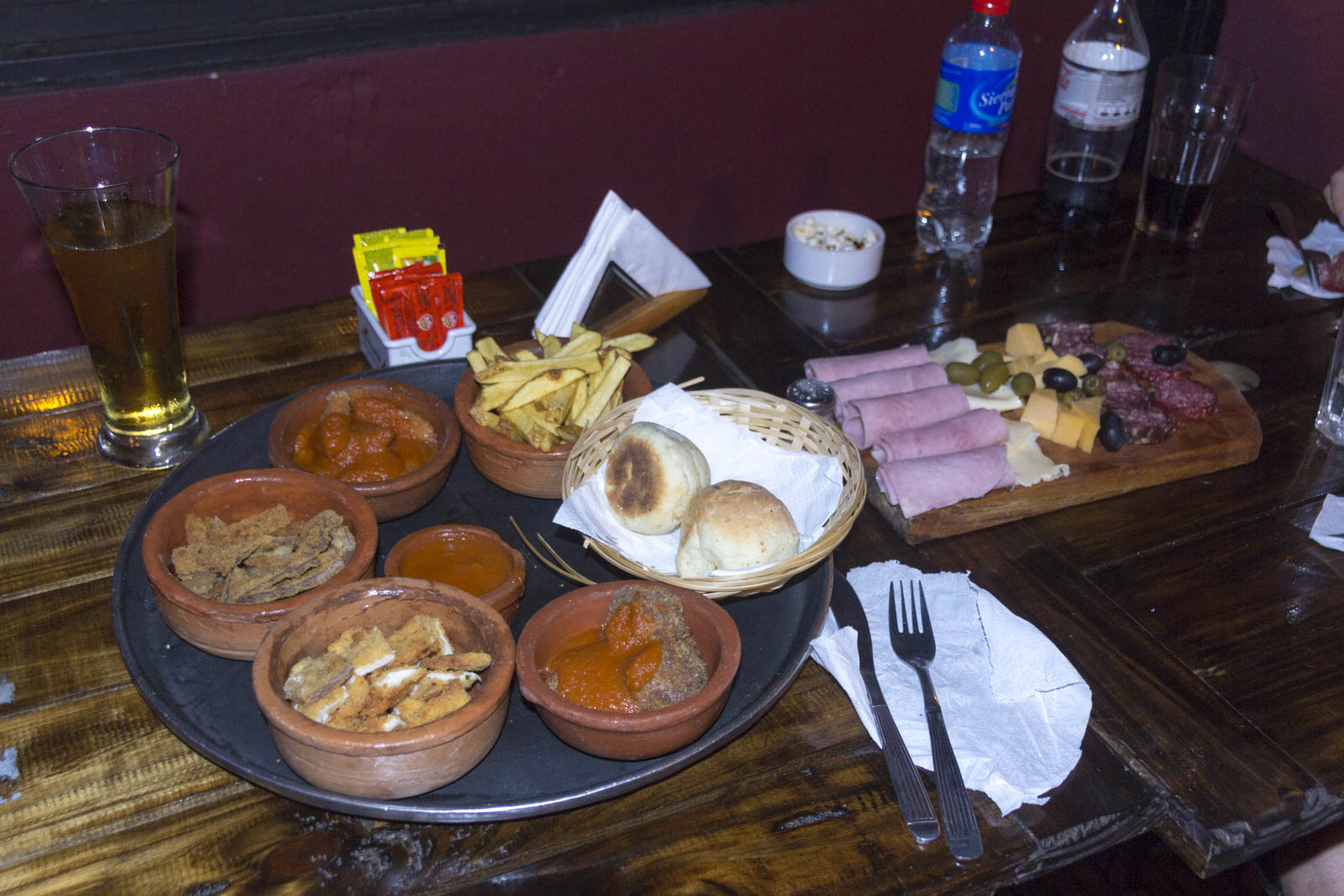 C’est l’équivalent de notre apéritif dînatoire, ou de la planche fromage-charcuterie. Un mélange de petits morceaux de charcuteries, de saucisses, de fromage, mais aussi d’olives et de petits légumes marinés. Parfois avec quelques « fritures » chaudes : frites, poulet ou fromage pânés, etc. Et bien sûr à manger avec du pain. Rien de très dépaysant en fait.