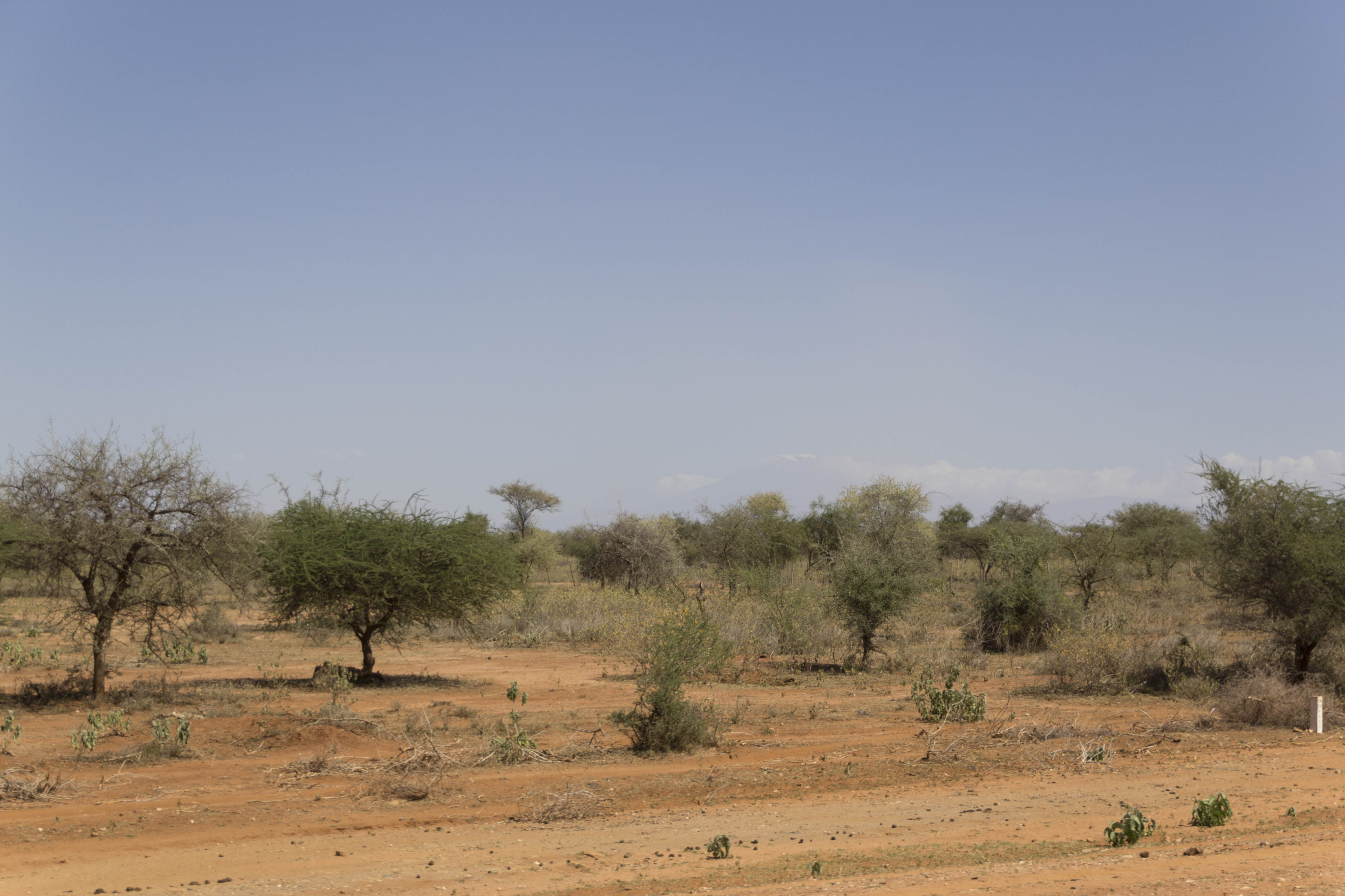 Le sud du Kenya, sur la route en direction de la Tanzanie, laisse apparaître des paysages assez secs. Quelques arbres, arbustes et herbes apportent des nuances de vert sur ce fond de terre ocre. Parfois, au loin, le vent fait tourbillonner des nuages de poussière, donnant l’impression de petits cyclones.