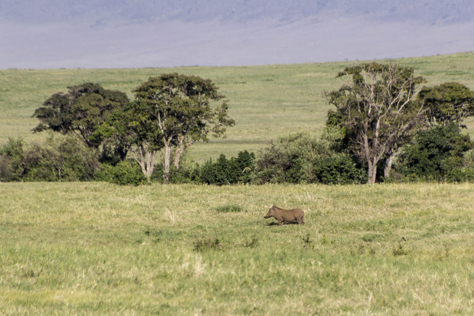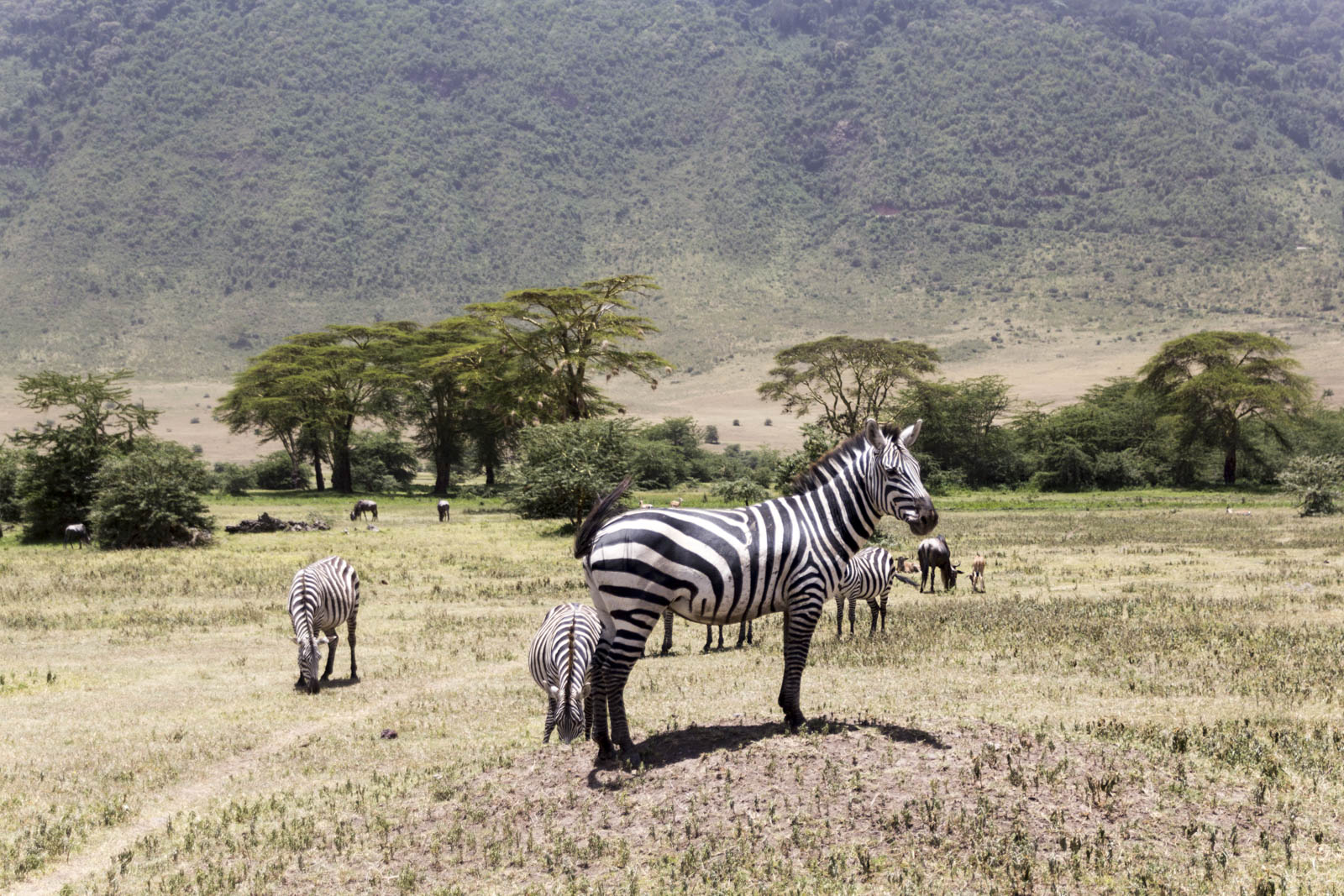 Nous arrivons sur le bord du cratère pour le lever du Soleil. La vue d’ensemble est à couper le souffle : une large étendue plate de savane et d’arbustes et quelques lacs qui brillent sous le soleil levant. Au loin, on distingue le bord opposé du cratère. Et on se dit qu’au milieu de tout ça, il y a toute cette faune qui nous attend, ou plutôt que nous attendons avec impatience.