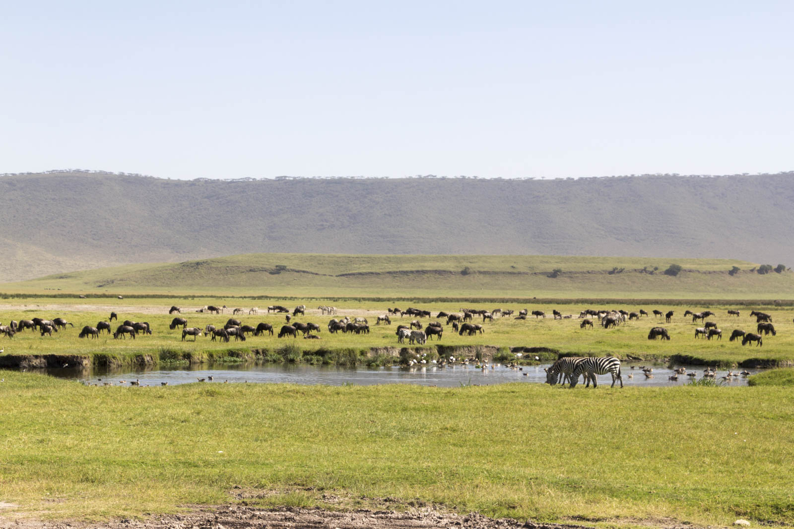 Ensuite, une bonne partie des mammifères africains y passe : troupeaux de gnous, de zèbres, d’élands, de gazelles, quelques phacochères… Tous tranquillement en train de paître ou de s’abreuver dans un petit lac du cratère. Bien sûr, leurs prédateurs sont aussi présents, notamment les chacals et les hyènes.