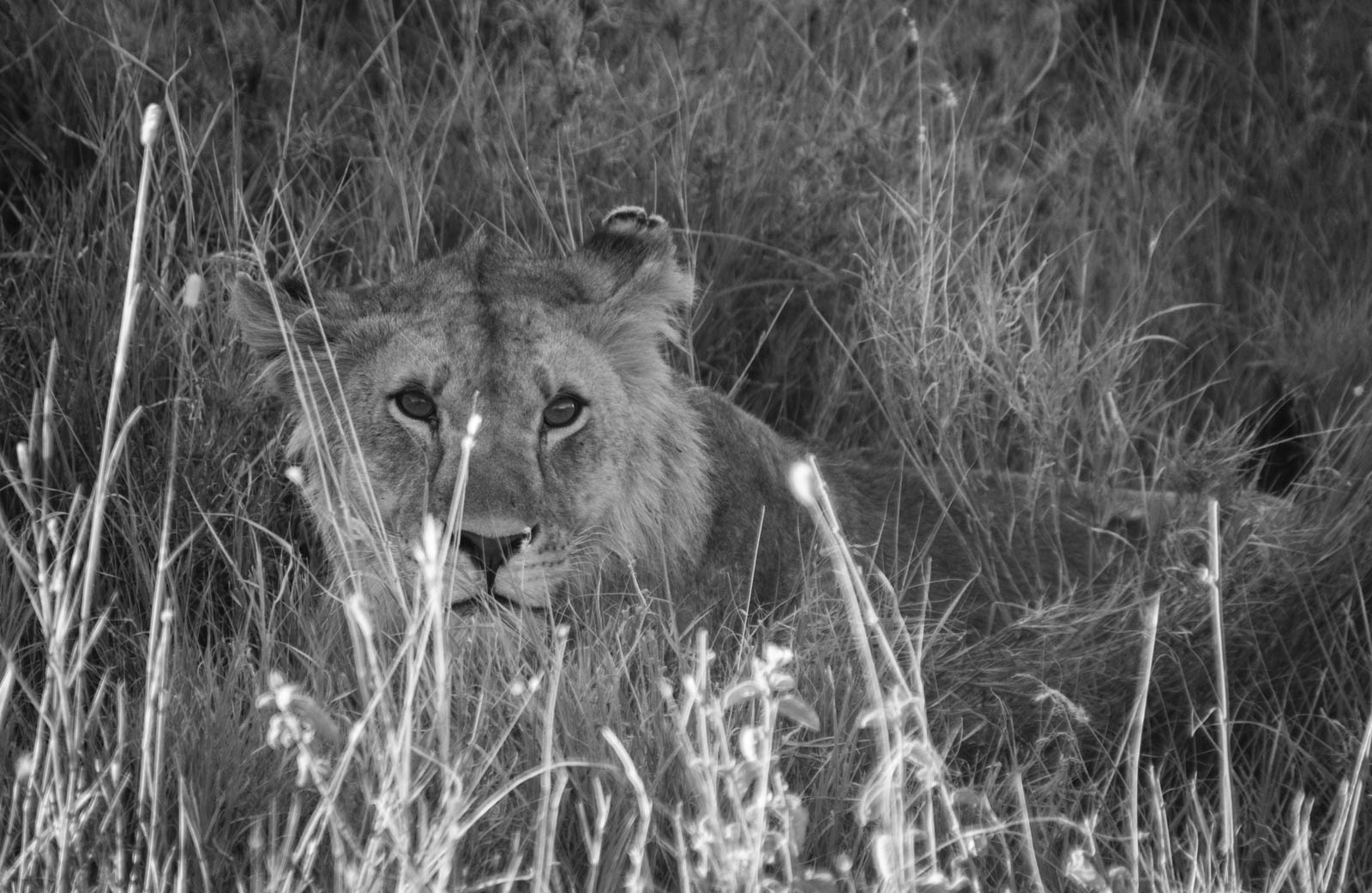 Ensuite, un groupe de lionnes près d’une rivière, puis une famille de panthères, planquées dans de hautes herbes. Au loin dans le rétro, on voit une des lionnes s’approcher tout doucement des panthères. Gabriel nous explique qu’elle cherche sans doute à les chasser.