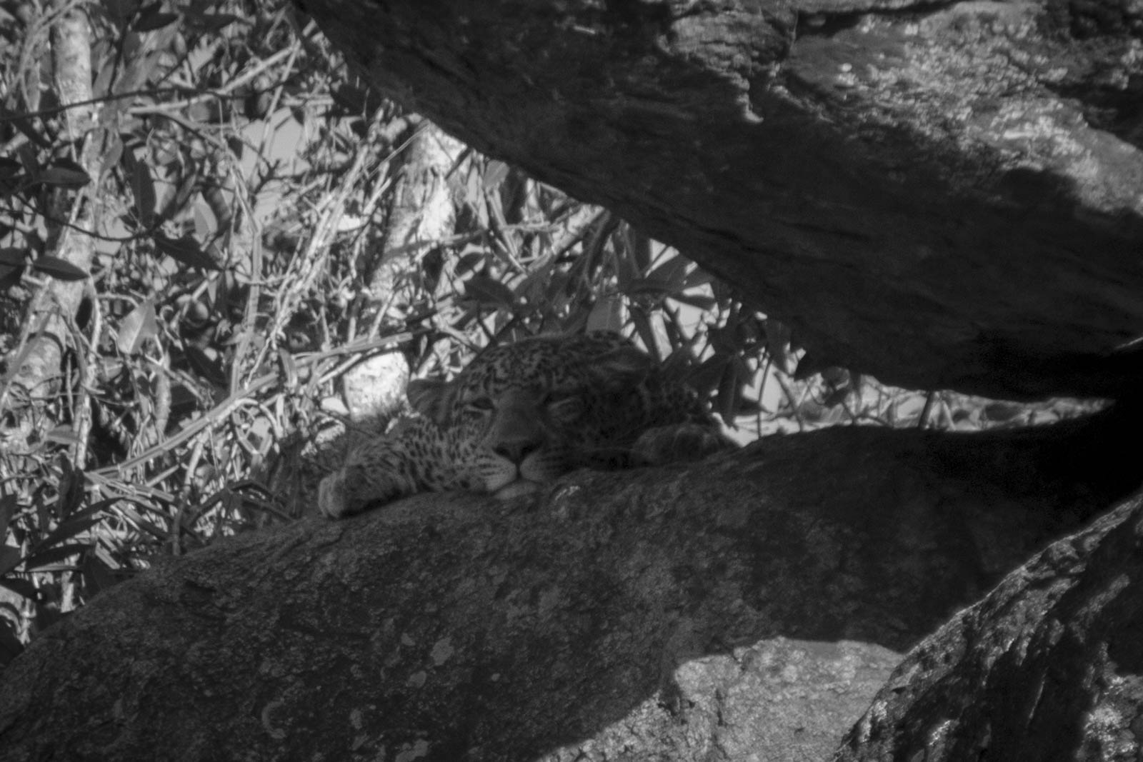 Mais c’est en toute fin de matinée qu’est apparu le clou du spectacle, le cinquième élément du Big Five, le tant recherché léopard. Une demi-douzaine de véhicules stationnaient à proximité, mais il fallait quand même avoir l’œil bien exercé pour le trouver. Il dormait là en haut d’un rocher, tapi dans l’ombre d’une pierre. Mais avec les jumelles, on a réussi à distinguer sa tête et ses pattes.