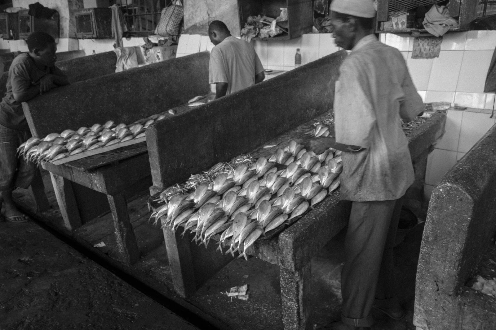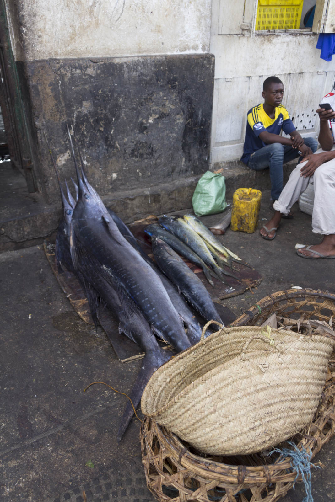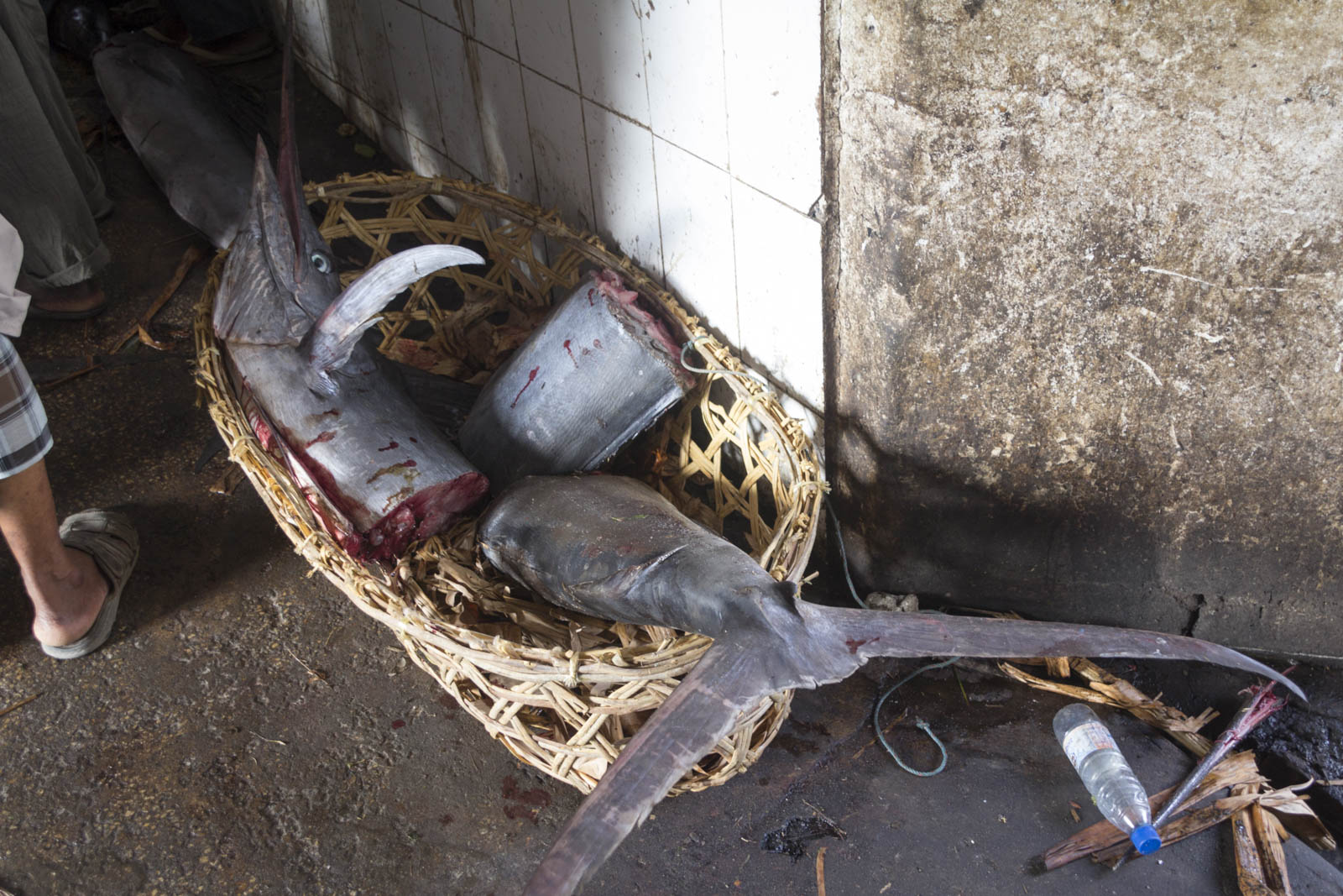 Les pêcheurs sont rentrés avec leurs filets pleins au petit matin, et dans une petite salle, les meilleures pièces sont vendues aux enchères. De magnifiques espadons, barracudas, thons… A côté, les autres poissons sont préparés pour être vendus au détail. Ca coupe, ça vide, ça gicle, le sang coule par terre et surtout ça pue ! Car tous ces jolis poissons sont découpés sur des établis en béton, sans carrelage, sans glace, dans une moite ambiance tropicale. Voilà qui réveille !