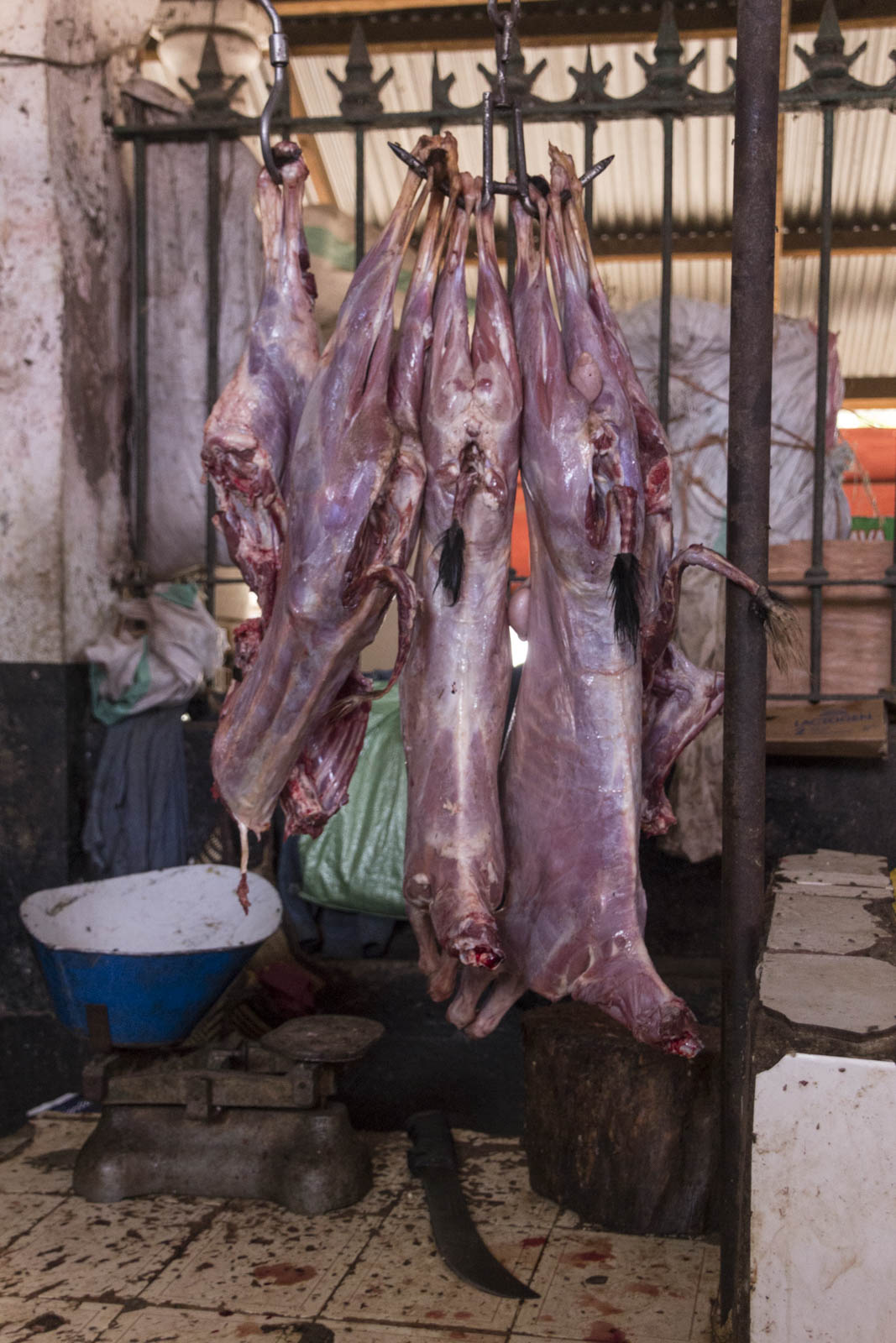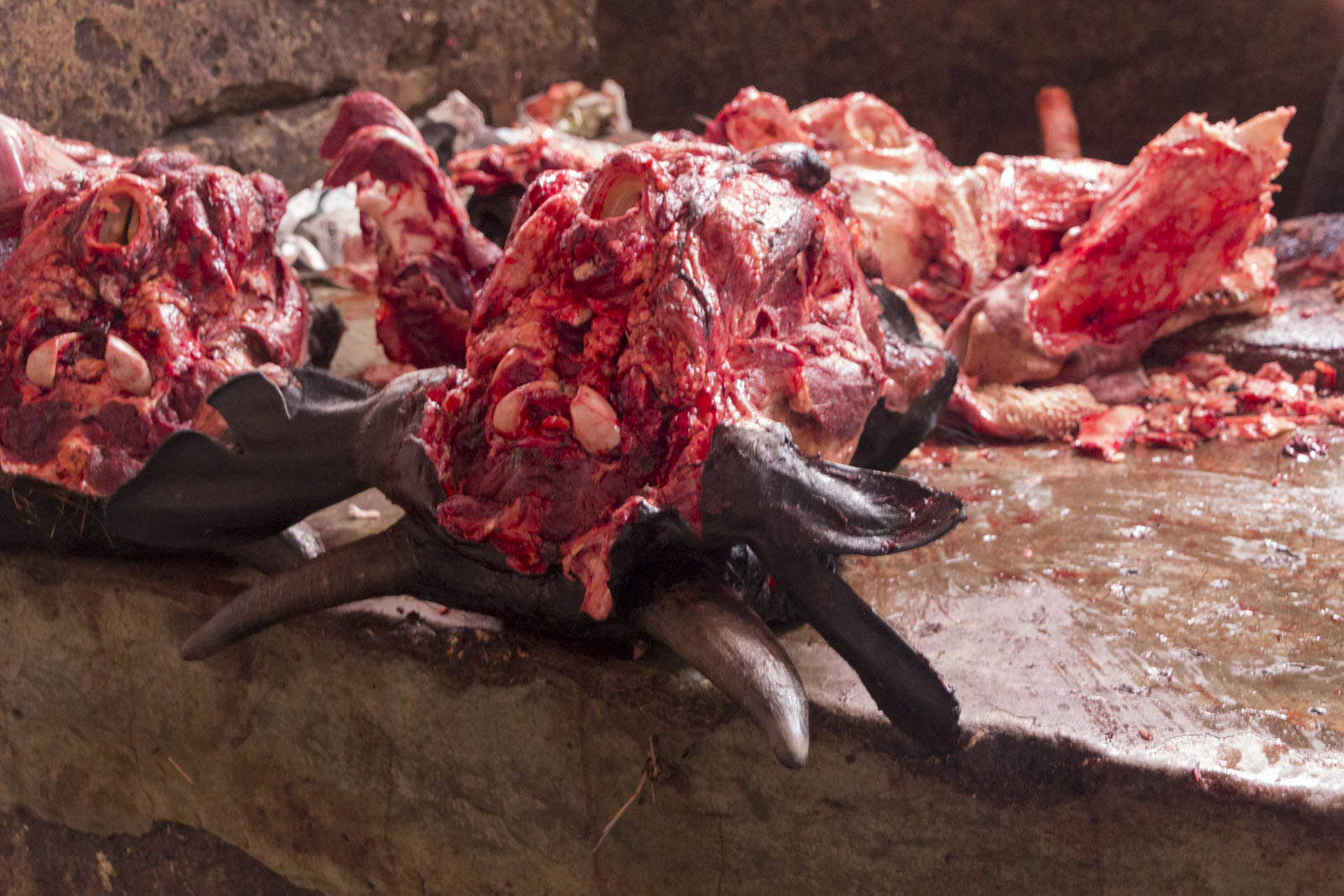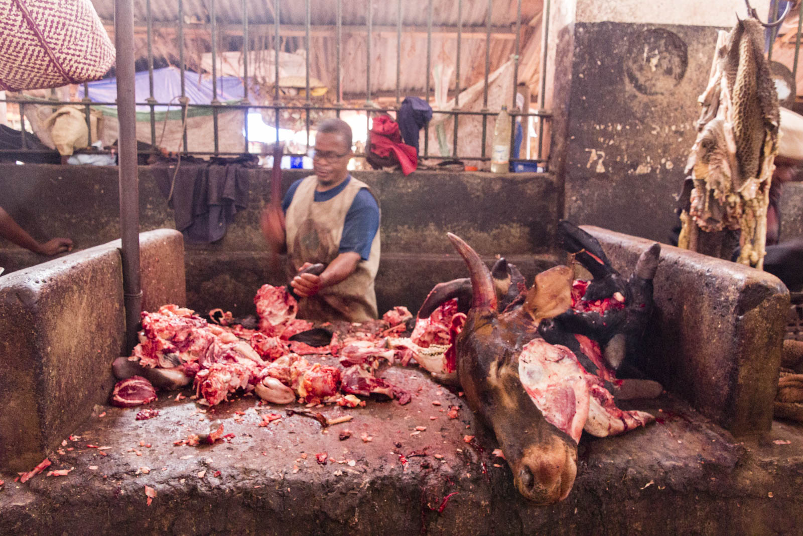 Là, devant nous, les bouchers découpent des têtes de bœuf, toujours sur les mêmes plans de travail en béton, toujours sans carrelage ni réfrigération. L’odeur est terrible. Ah, un bout de viande vient d’atterrir – accidentellement cette fois – sur le t-shirt de Sandrine. Quelle manie de prendre les têtes de bœuf en photo, décidément !