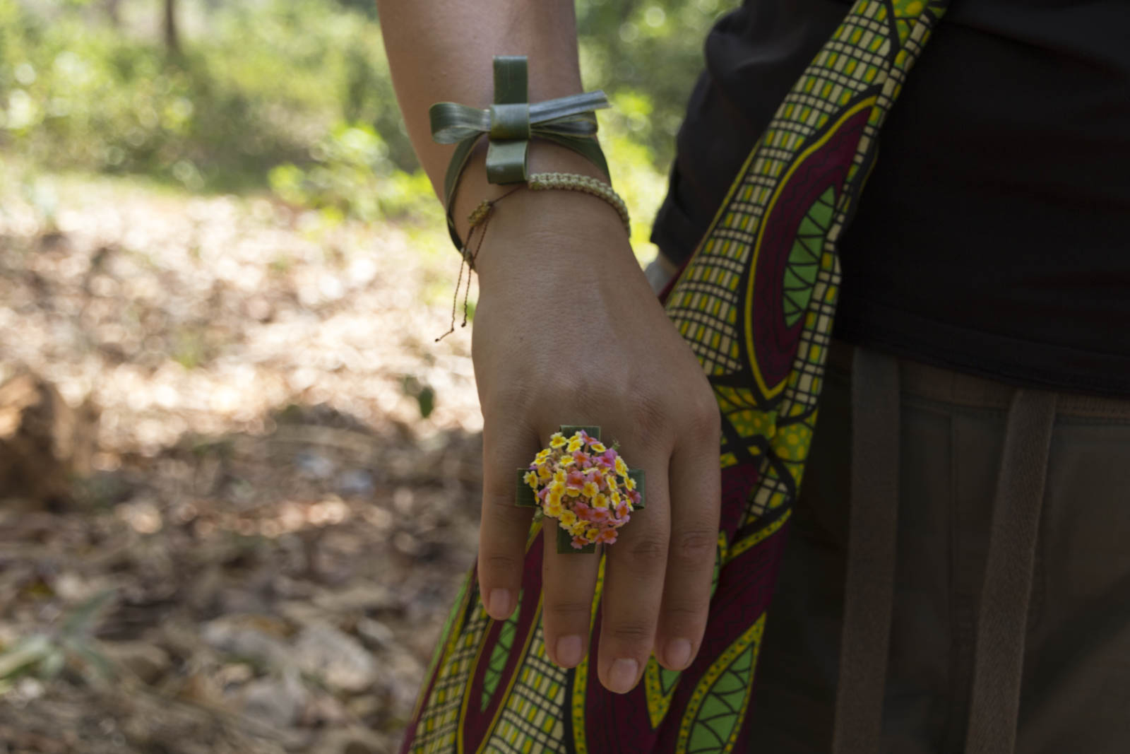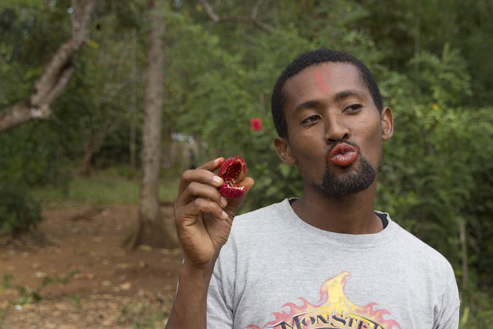 Une vingtaine de minutes de route plus tard, nous voilà arrivés dans une grande plantation de fruits et d’épices, comme le centre de l’île en est recouvert. On observe les arbres, les plantes, les fleurs, les racines. On sent, on goûte, on regarde. C’est une longue et intense expérience sensorielle. Et diversifiée tant la variété des fruits est importante : des bananes, des plantains, des ananas (enfin un seul, qui était le modèle d’expo, car la saison était terminée), des mangues, des noix de coco, des jacquiers (et leur fruit, donc), des pomelos, des oranges, des caramboles, du corossol…