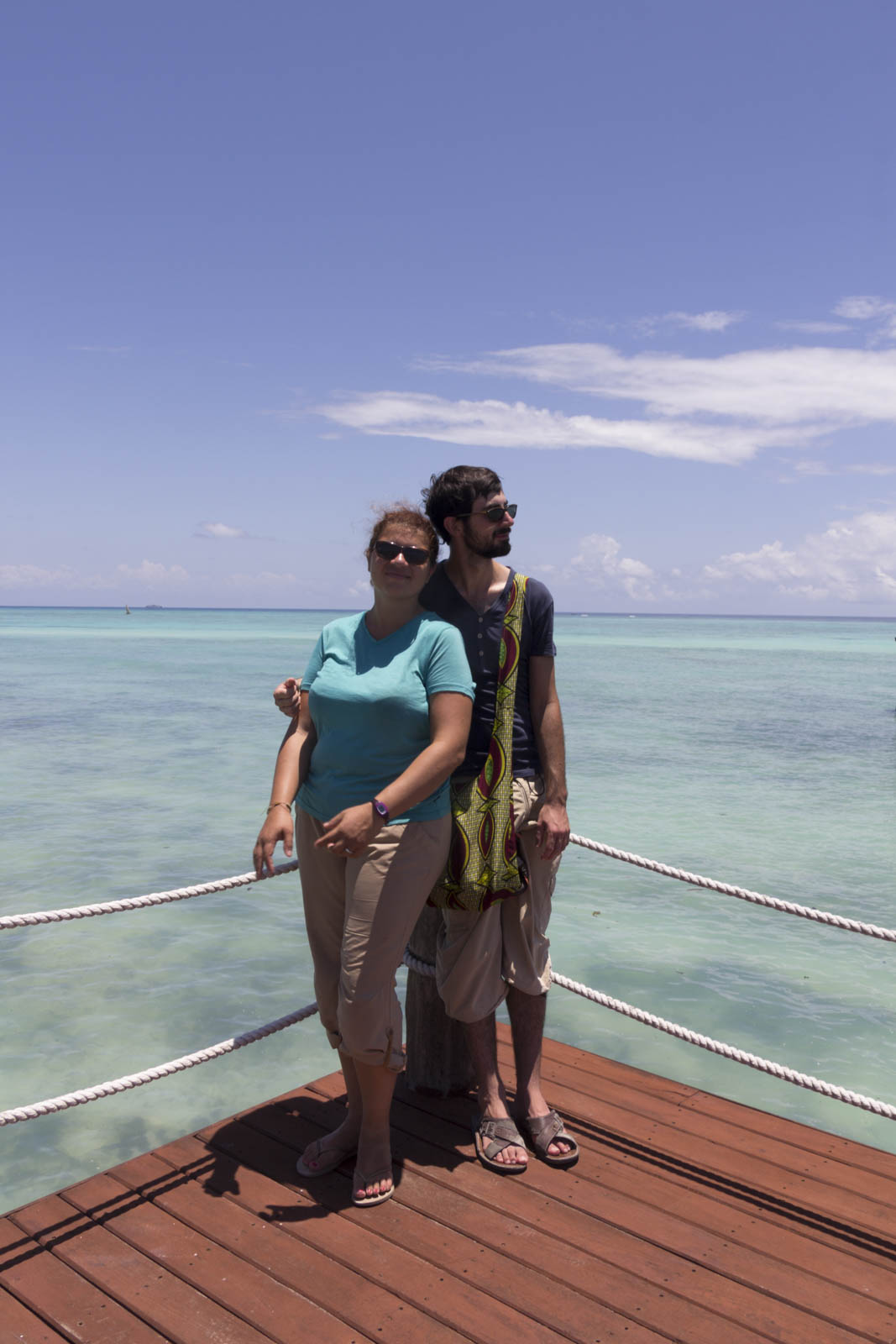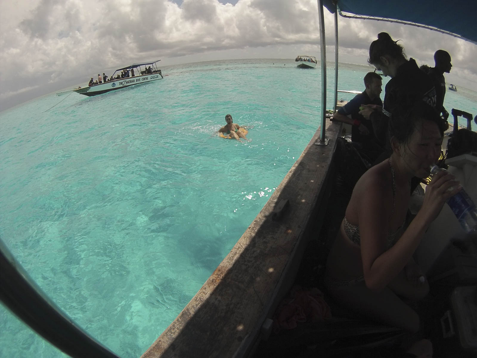 Parmi les autres activités de loisir dont l’on peut profiter dans le coin, il y a la plongée et le snorkeling. Sandrine et une dizaine d’autres personnes embarquent donc à destination de la réserve marine de l’atoll de Mnemba. Le bateau est rapide, le temps clair, l’eau cristalline, les quarante minutes de navigation pour rejoindre la réserve nous en mettent plein la vue. Nous croisons même quelques dauphins et nous jetons à l’eau pour nager avec eux. Malheureusement nous n’avons pas été assez rapides et eux n’étaient pas assez joueurs, c’est plutôt un acte manqué.