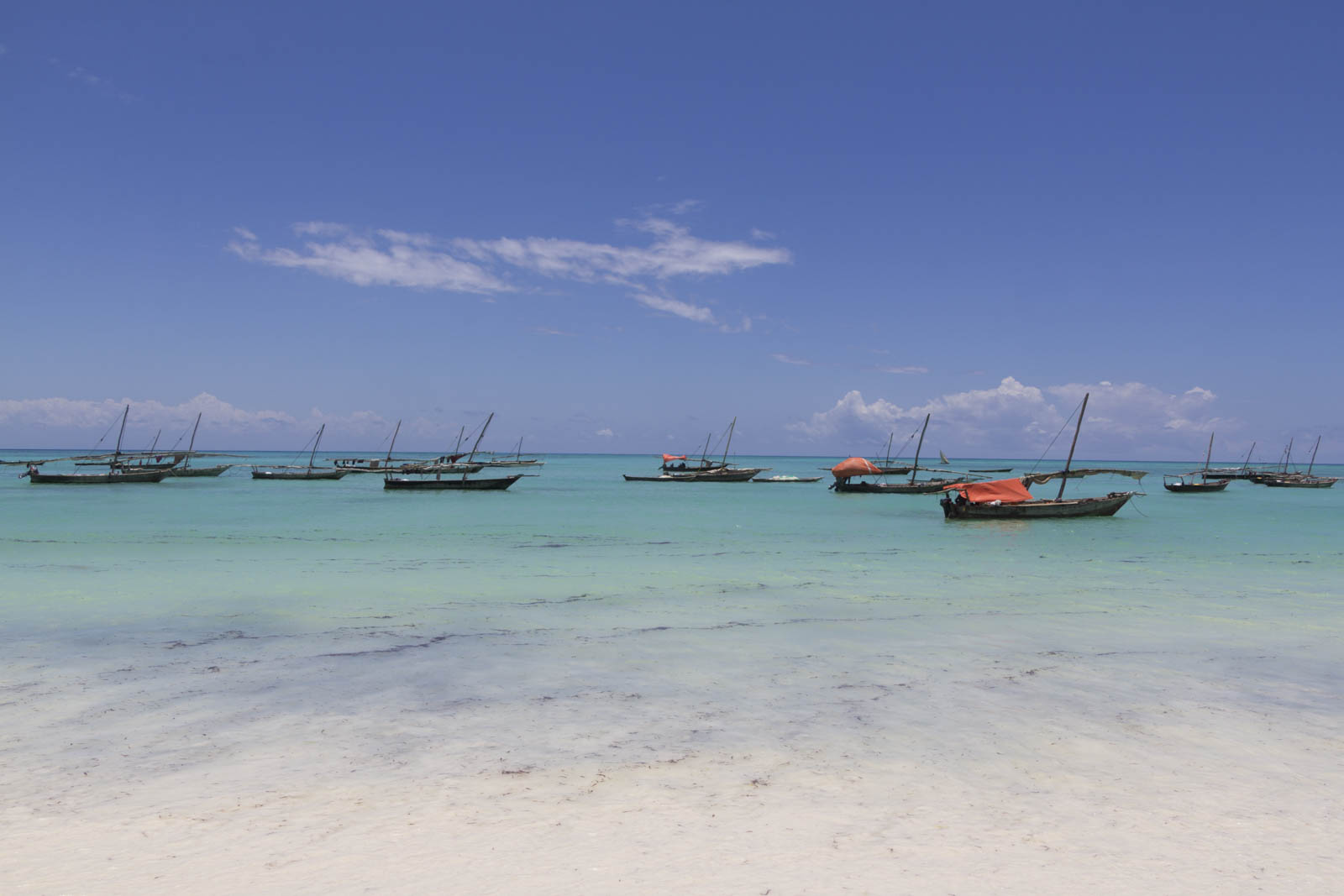 Pour rentrer vers Nungwi Beach, nous empruntons le front de mer, largement envahi par les algues de ce côté-ci, mais passé ces premiers mètres de végétation, l’eau est toujours aussi transparente. Nous croisons quelques pêcheurs et quelques-uns de leurs petits bateaux. Mais en plein midi, tout paraît bien calme.