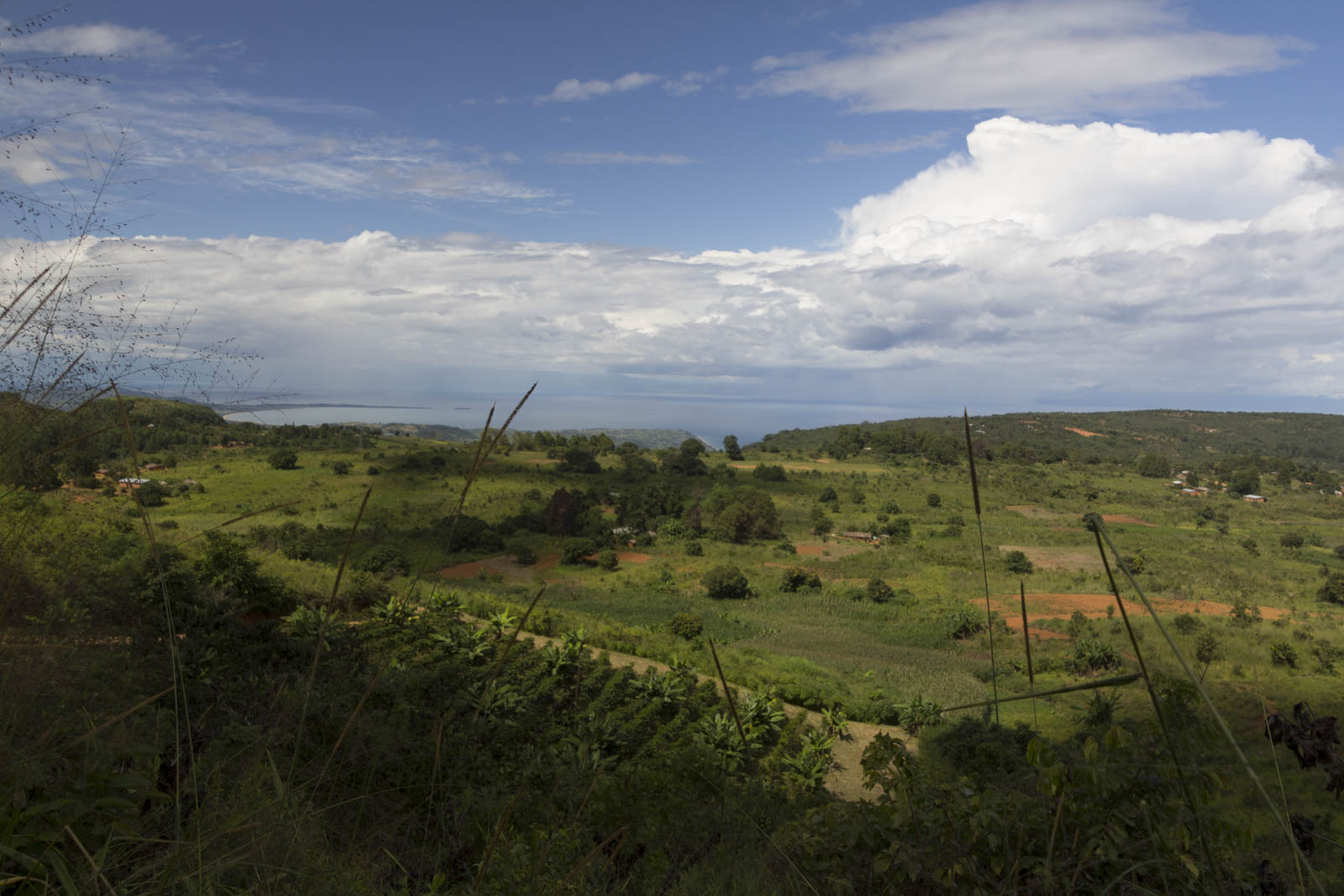 Nous quittons la grande route et tournons à droite pour suivre une piste en terre et cailloux qui monte sinueusement. 16km nous séparent de la ville en haut de la montagne. Virage 20, c’est ce qu’indique un petit écriteau en bois sur un arbre. Le compte à rebours est lancé. Virage 18. Dickson notre guide nous propose de prendre un raccourci. On prend, bien sûr ! On commence alors à couper les virages en grimpant à travers la végétation. Le chemin est très pentu, le souffle est court mais on gagne pas mal de kilomètres. Virage 13. L’effort est récompensé, on avance bien. Virage 9. Mais qu’est-ce qu’il fait chaud ! Et pourtant il n’est pas encore 8h. Virage 1. Wahou, nous voici arrivés en haut de la montagne, le paysage est époustouflant. En face de nous, l’immense lac étend son drap bleu jusqu’à l’horizon. En contrebas, une plaine légèrement vallonnée, des champs, quelques habitations. Et puis de chaque côté, la terre se plie pour former quelques montagnes, comme la nôtre, qui surplombent le lac. Il est 9h, c’est l’heure du petit déj pour tous les autres du groupe qui sont restés au campement. Nous, on est là devant cette vue magnifique et on est vraiment ravis.